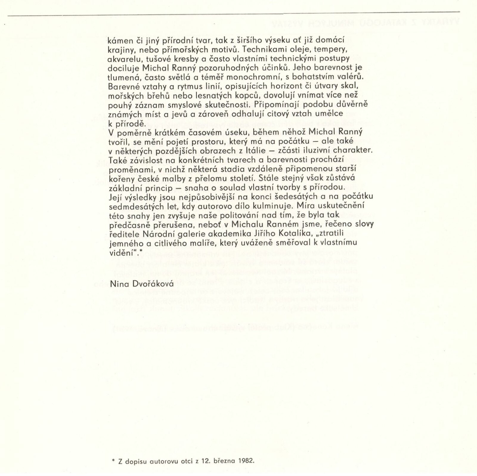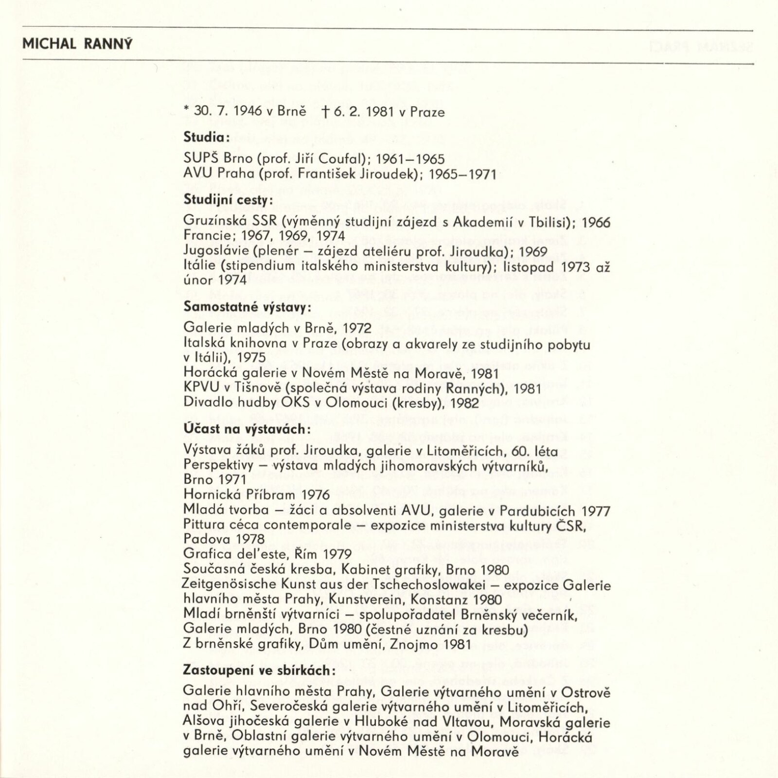 Michal Ranný. Obrazy, kresby: Dům umění / Dům pánů z Kunštátu, 1. patro, 14. 2. – 11. 3. 1984 / Texty: Nina Dvořáková, Alena Konečná, Jiří Valoch, Jan Skácel. – Brno: DUmB, 1984. – 60 s., obr., životní data, výstavy, zastoupení ve sbírkách, DPK 818. – MZK; MG; MMB