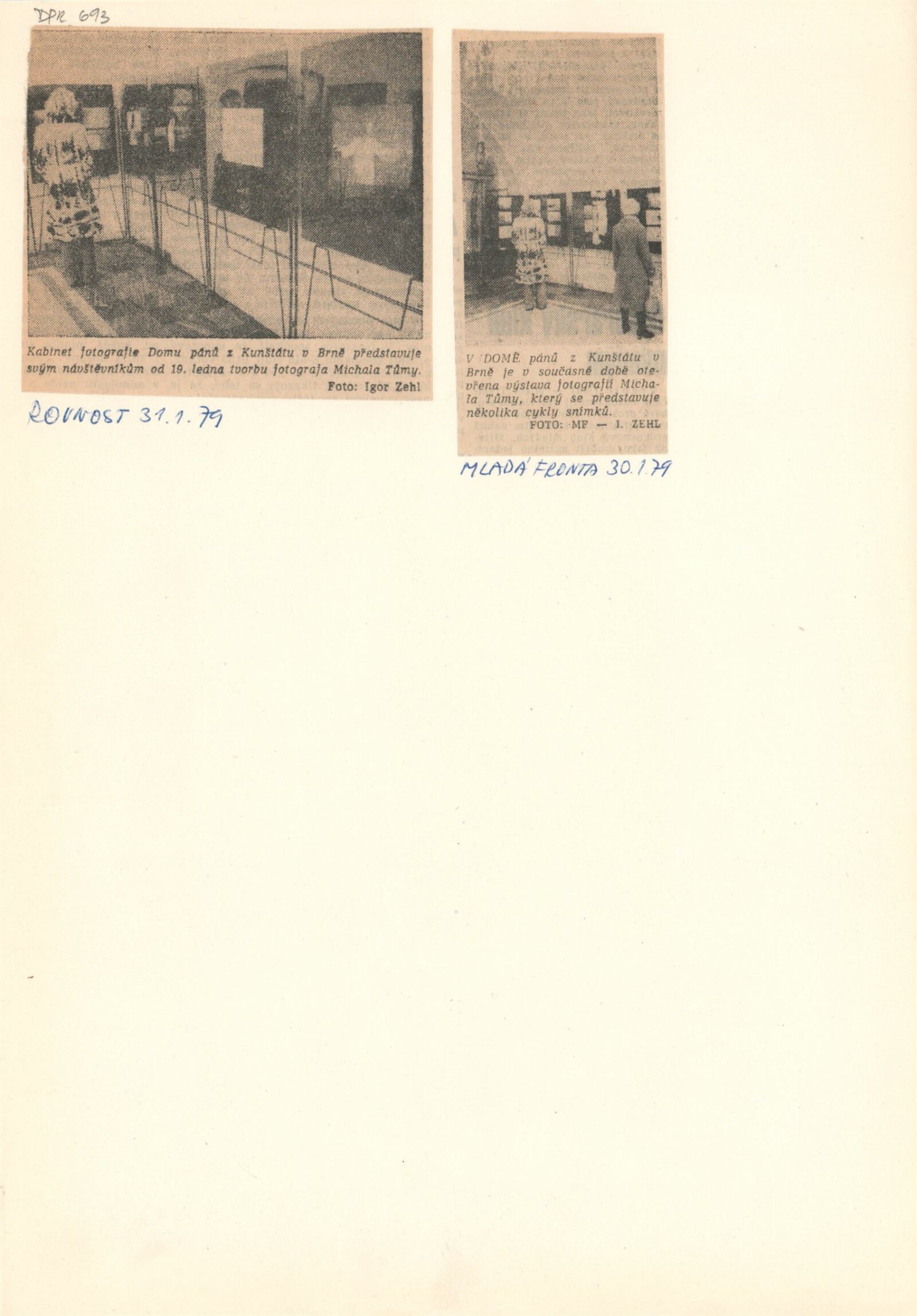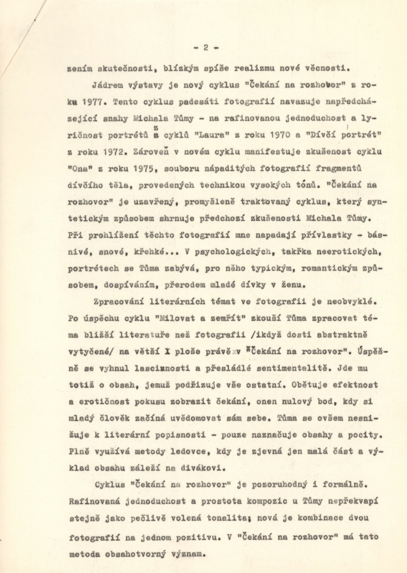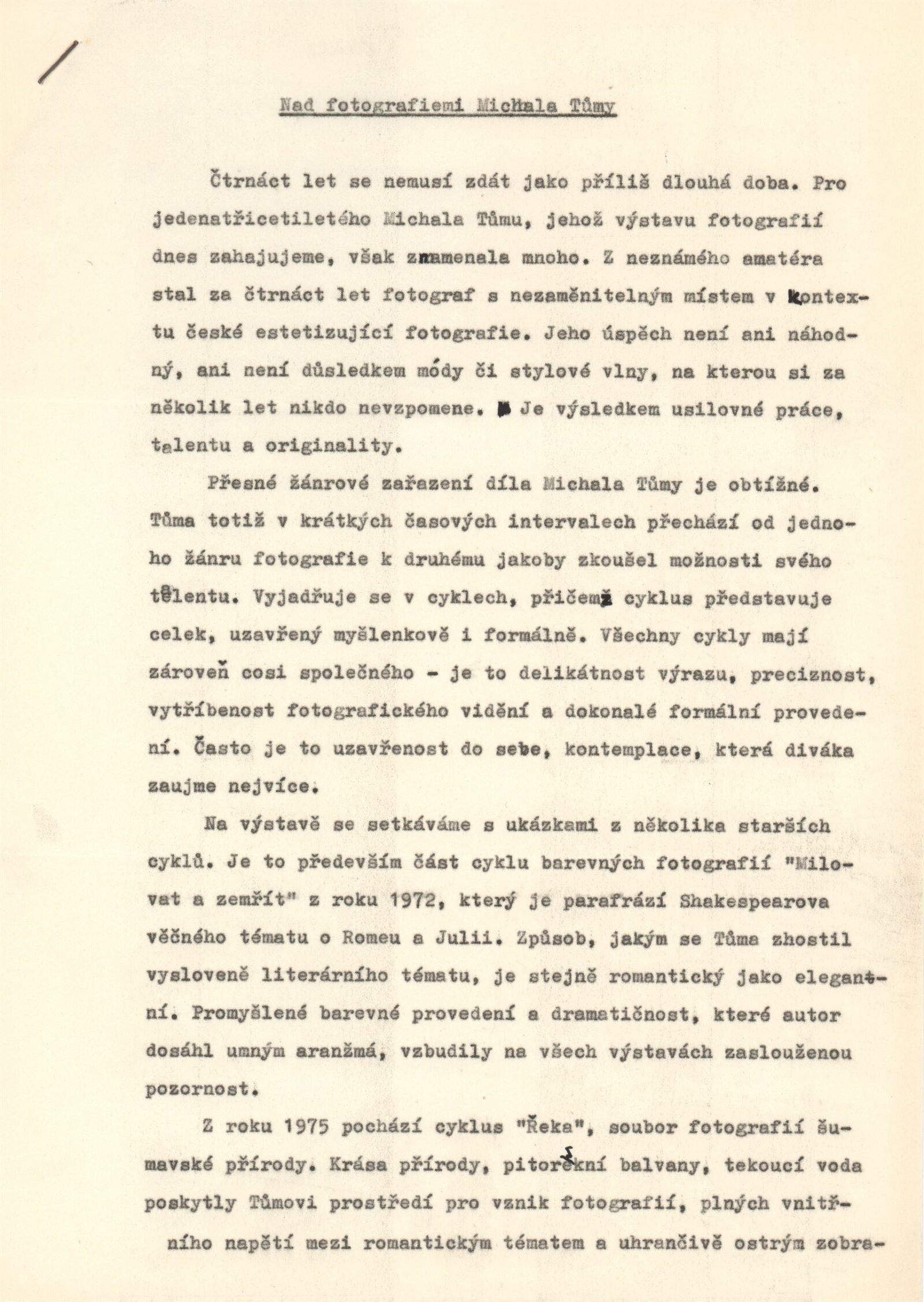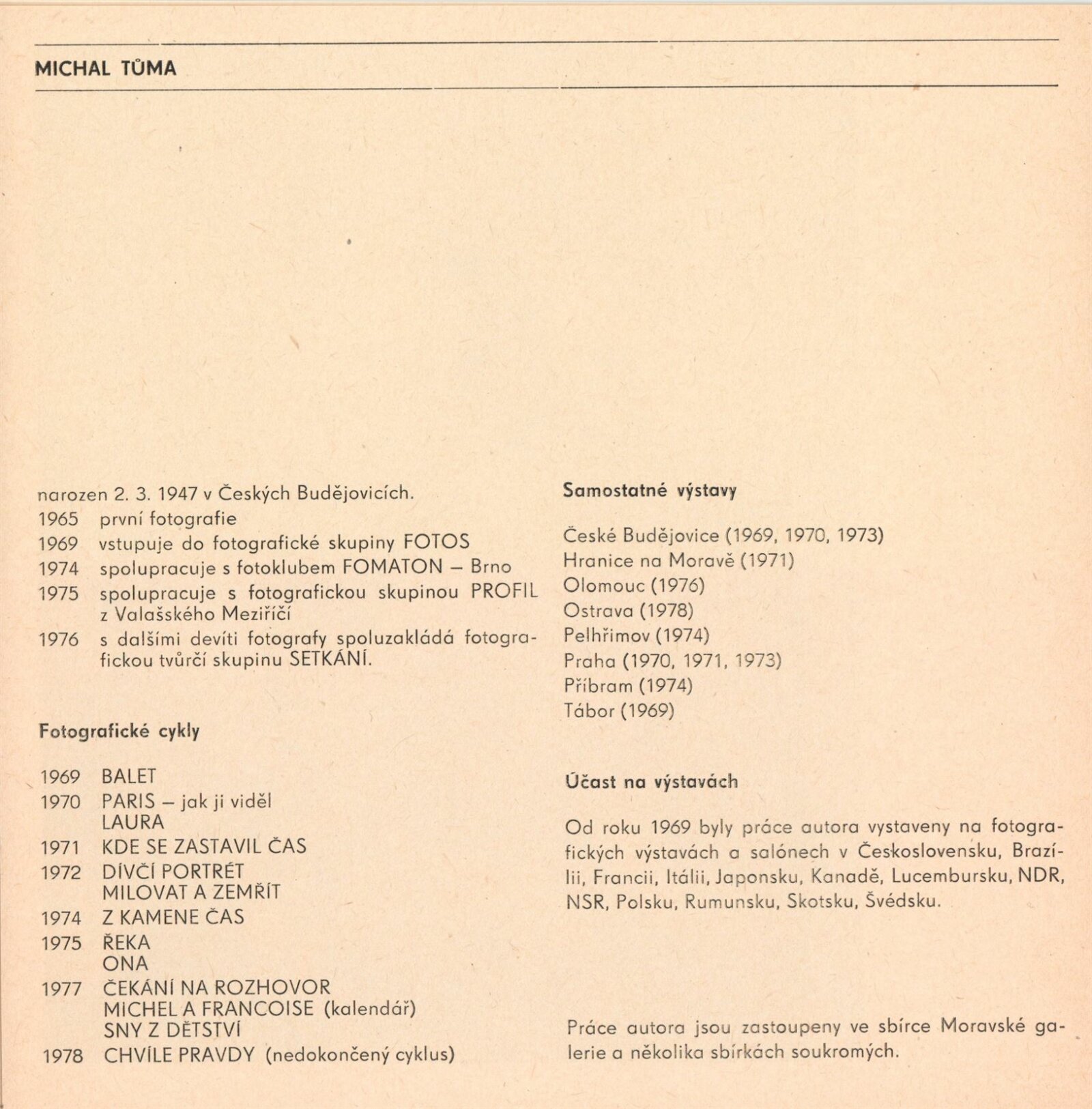 společná pozvánka pro DPK 692–694, katalog, strojopis, autorské fotografie, text Petra Klimpla Nad fotografiemi Michala Tůmy, provozní korespondence s autorem, potvrzení o převzetí děl, žádost o výstavu, recenze v tisku, katalogy autorových cyklů Řeka a Ona
