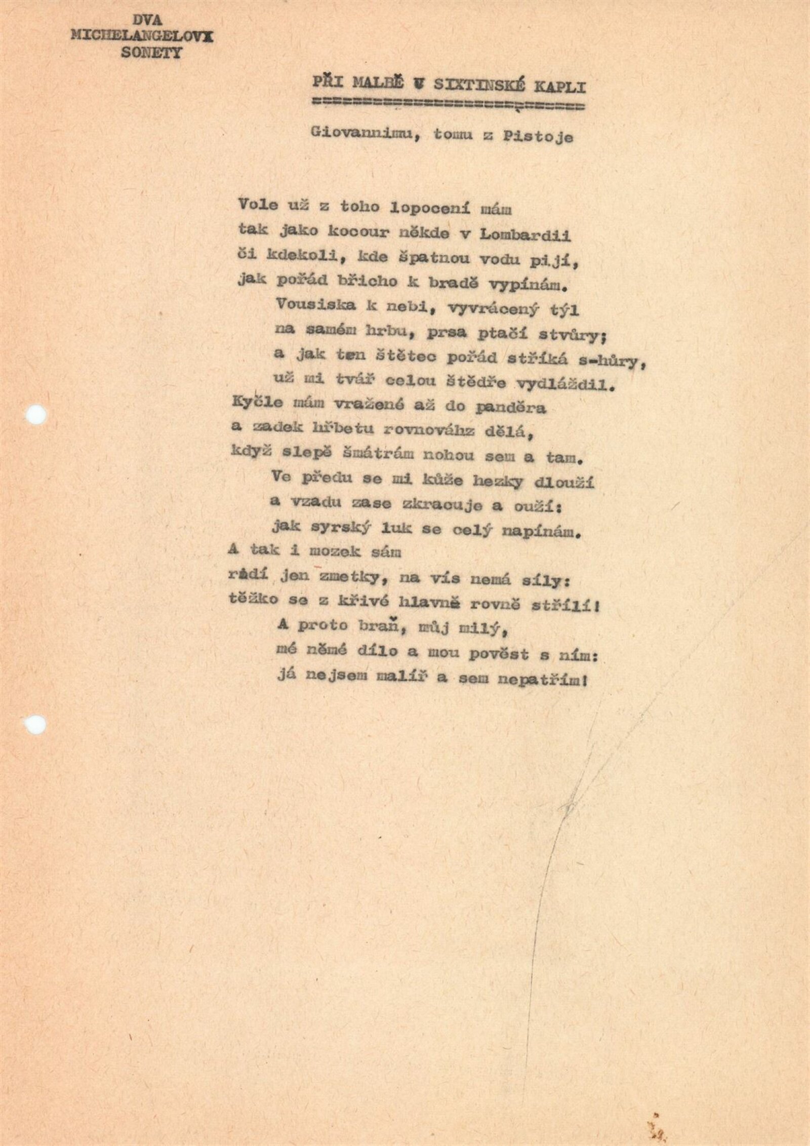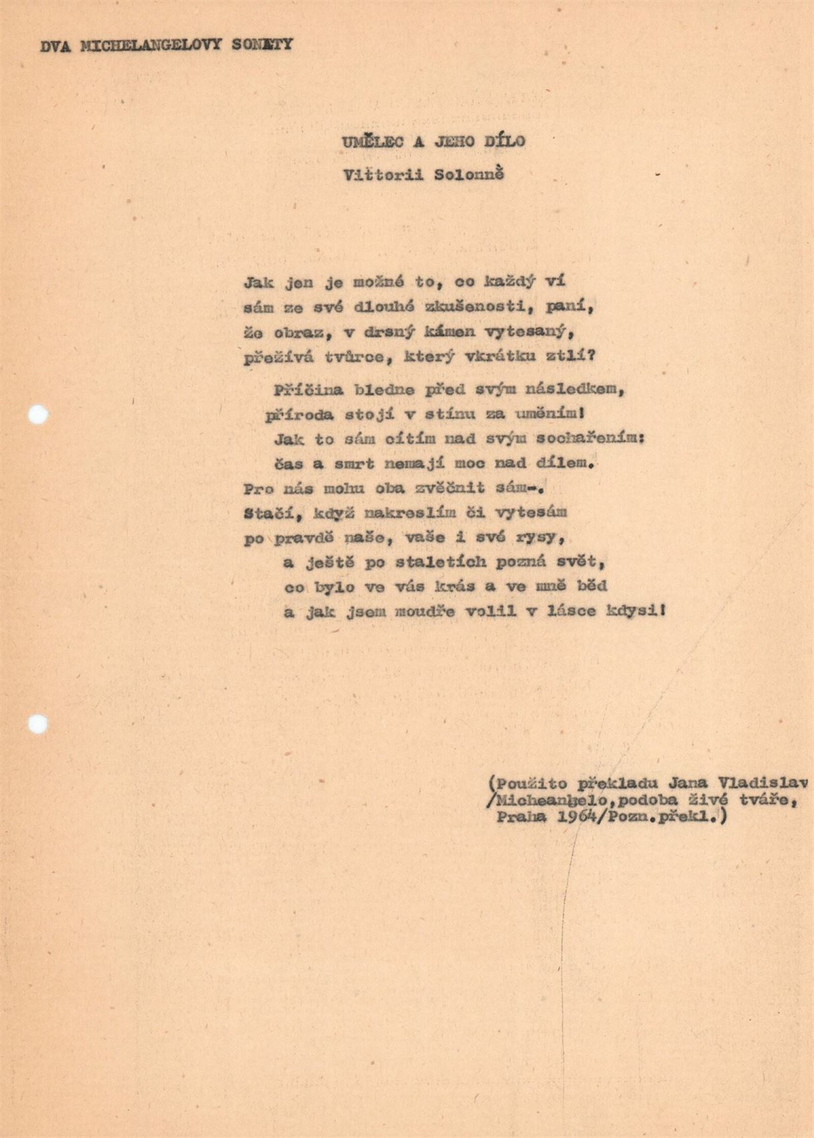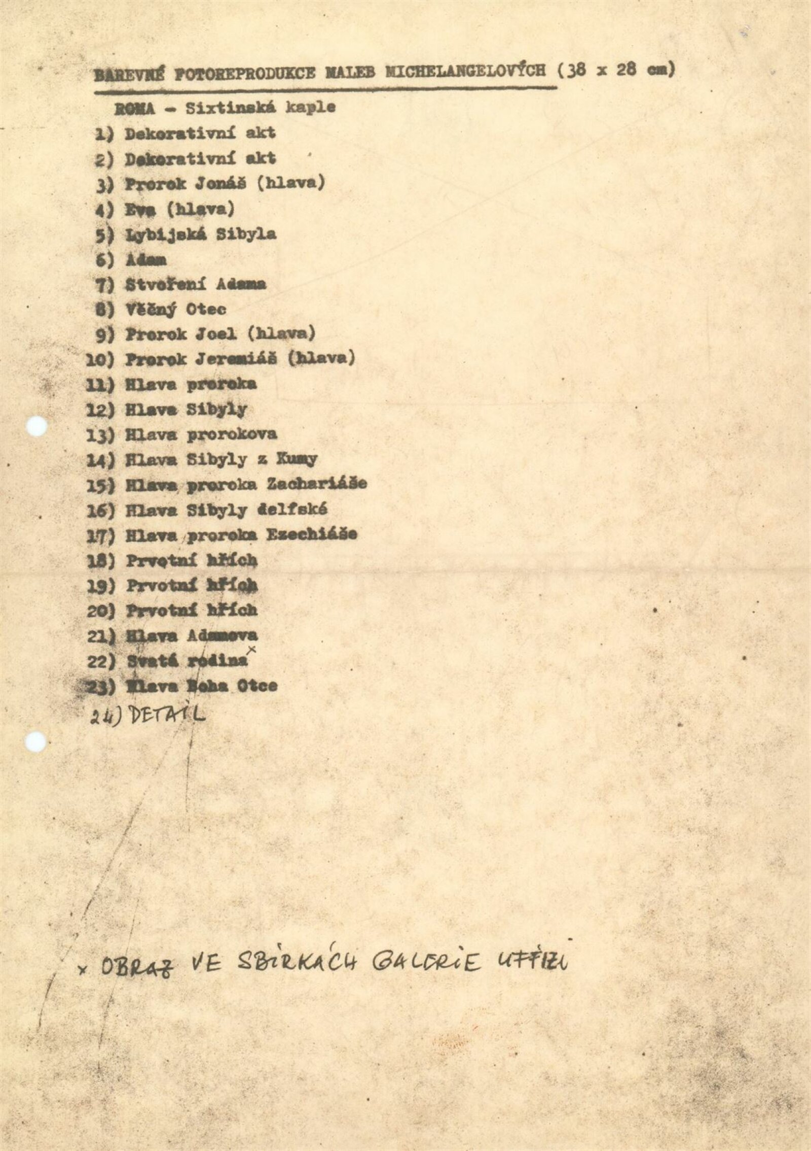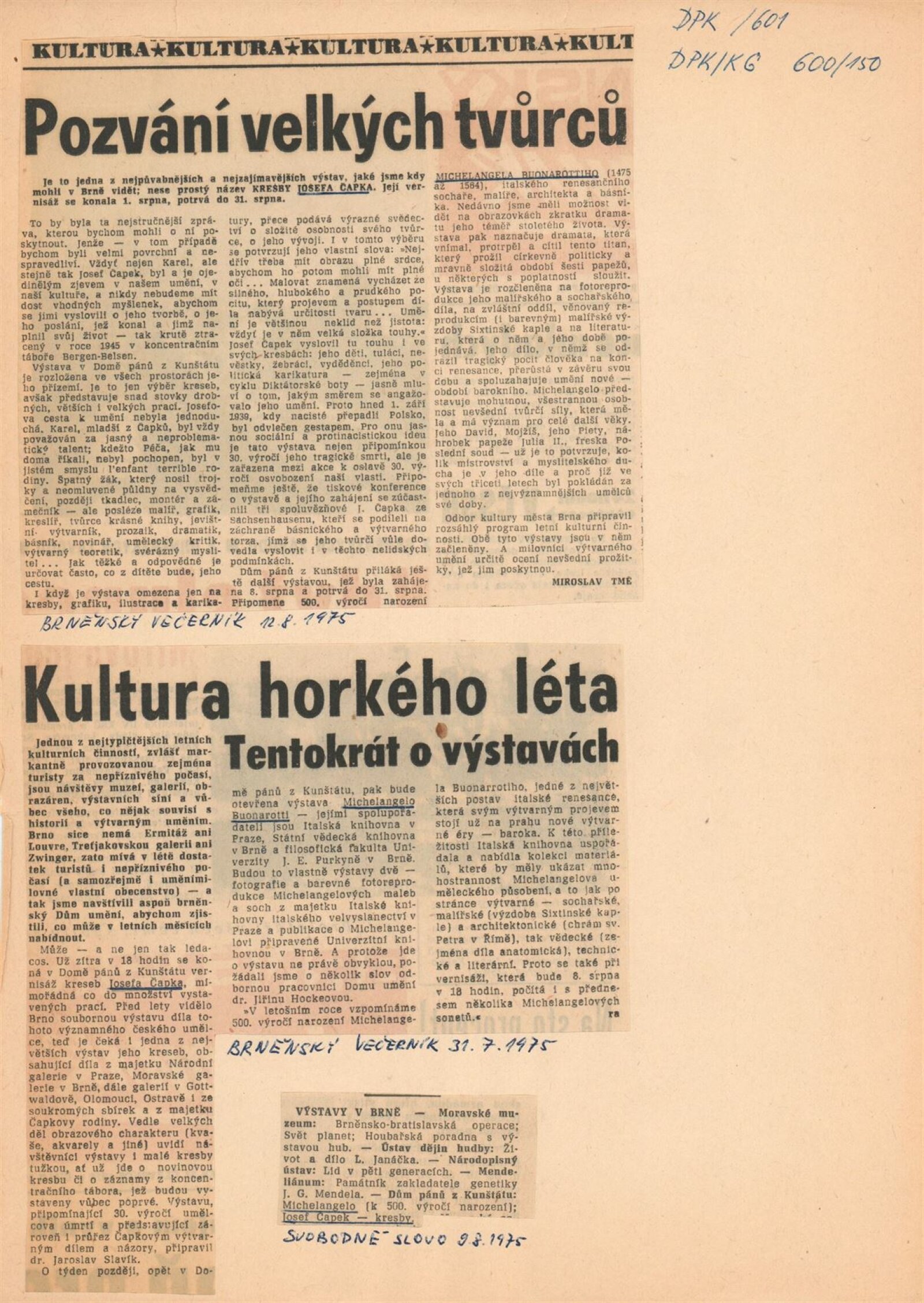 pozvánka, společná pozvánka pro DPK 600 a 601, fotografie z vernisáže, dva Michelangelovy sonety, seznam vystavených exponátů, zápis z jednání, hospodářská smlouva (DU s univerzitní knihovnou v Brně), korespondence – italská knihovna italského velvyslanectví, zpráva o vernisáži, žádost o povolení výstavy, recenze v tisku