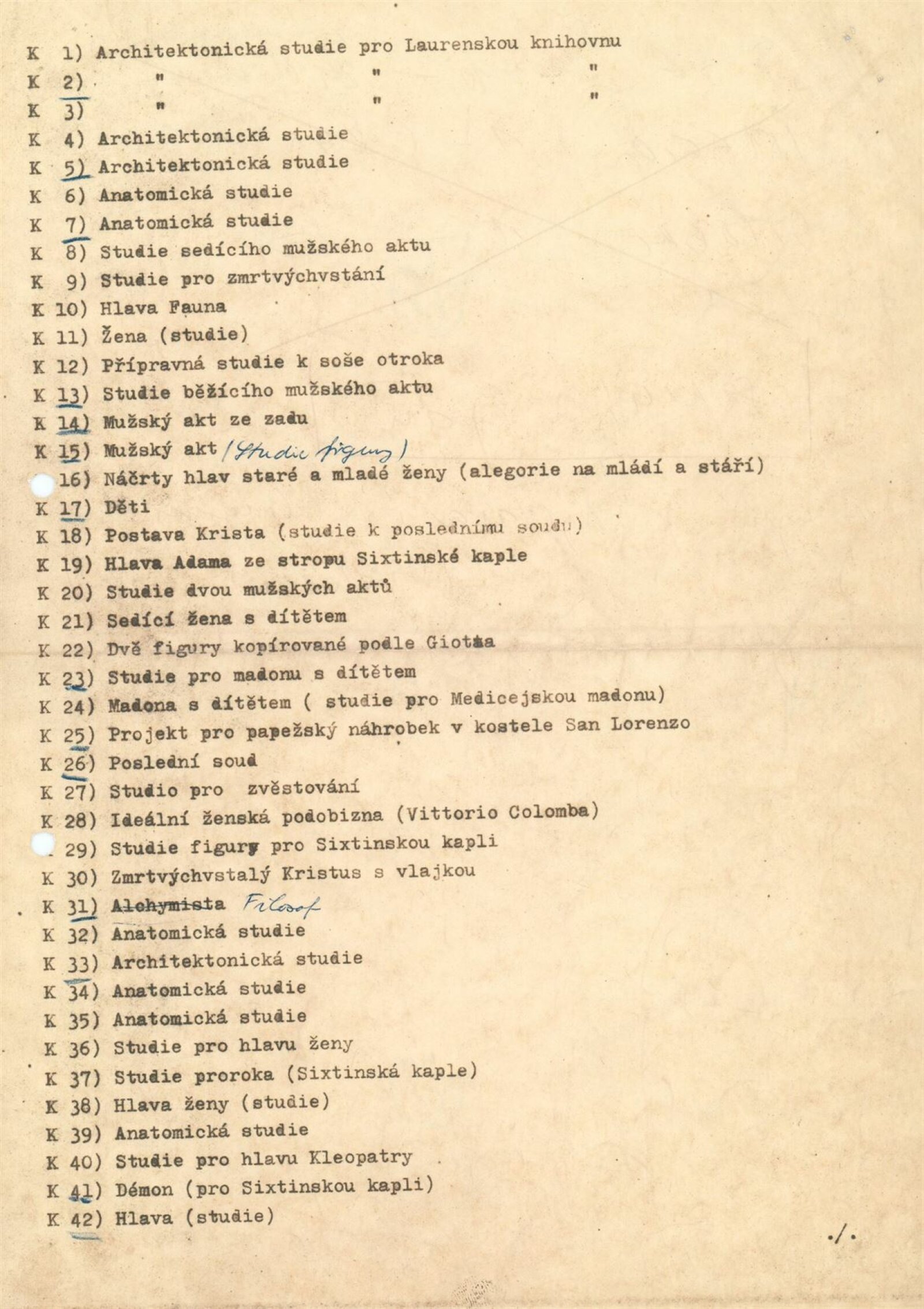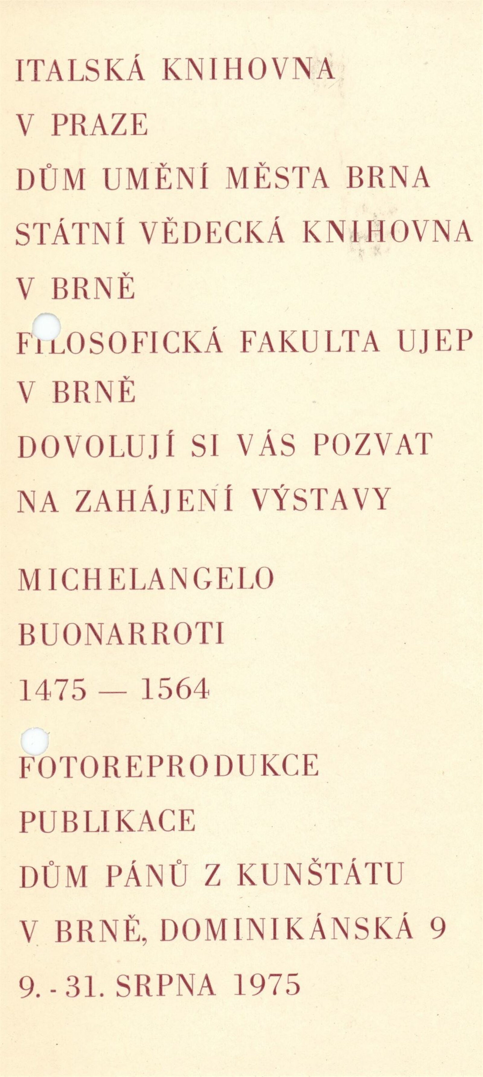 Michelangelo Buonarroti. Fotoreprodukce výtvarných děl a knihy k pětistému výročí narození: Dům umění / Dům pánů z Kunštátu, 9. – 31. 8. 1975 / U příležitosti výstavy vyšel tisk Michelangelo Buonarroti v Universitní knihovně v Brně. Bibliografie. – Zpracoval: Mirko Riedl. – Brno: Universitní knihovna, 1975. – 70 s., DPK 601. – MZK
