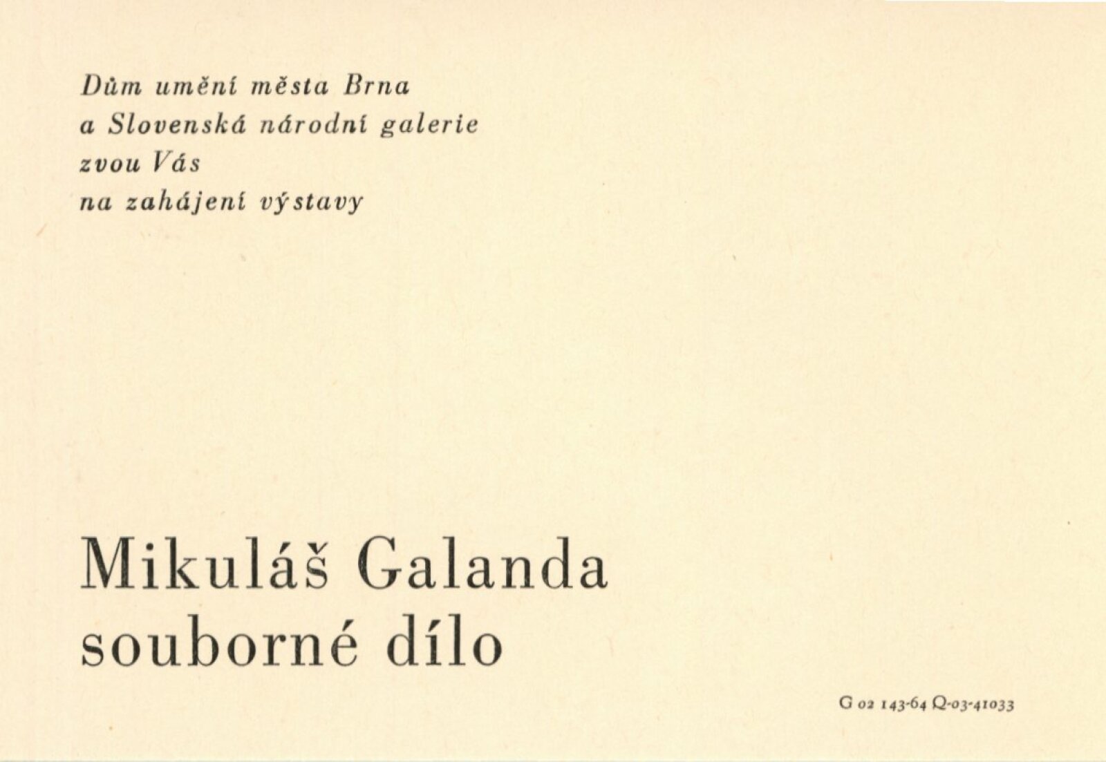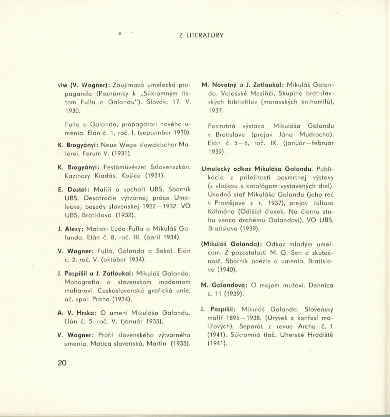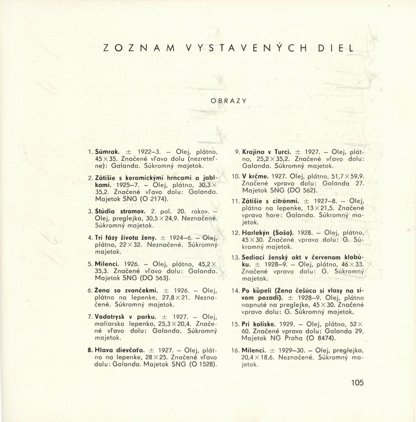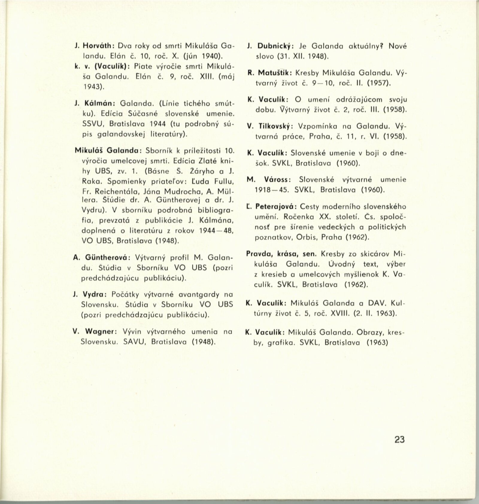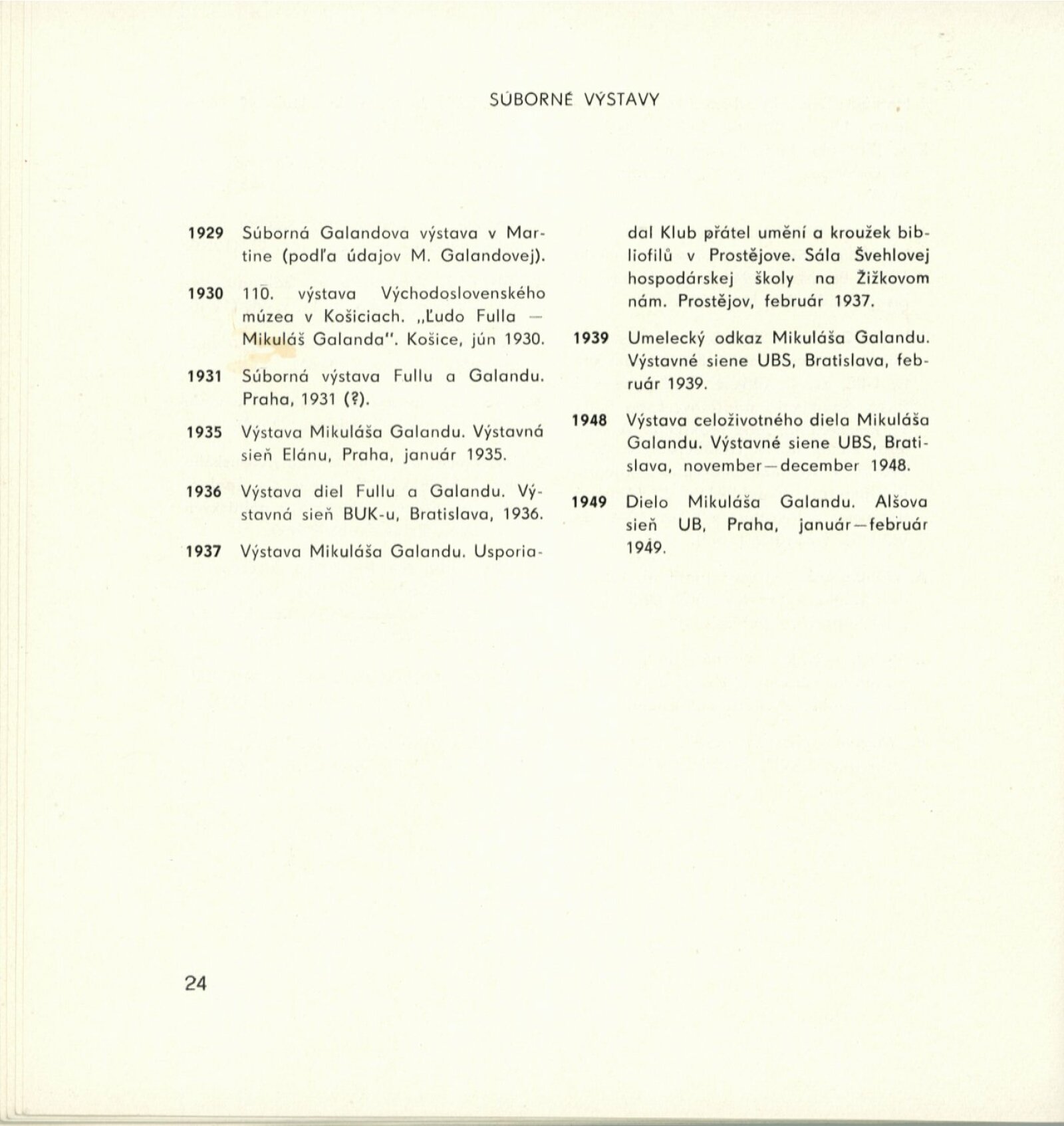 Mikuláš Galanda. Souborné dílo: Dům umění města Brna / Dům pánů z Kunštátu, 19. 1. – 23. 2. 1964 / Převzatý katalog. Dielo Mikuláša Galandu: Slovenská národná galéria Bratislava, září–prosinec 1963 / Text Karol Vaculík, z myšlienok Mikuláša Galandu. – Bratislava: Slovenská národná galéria, 1963. – 139 s., obr., životní data, výstavy, bibliografie, DPK 212. – MZK