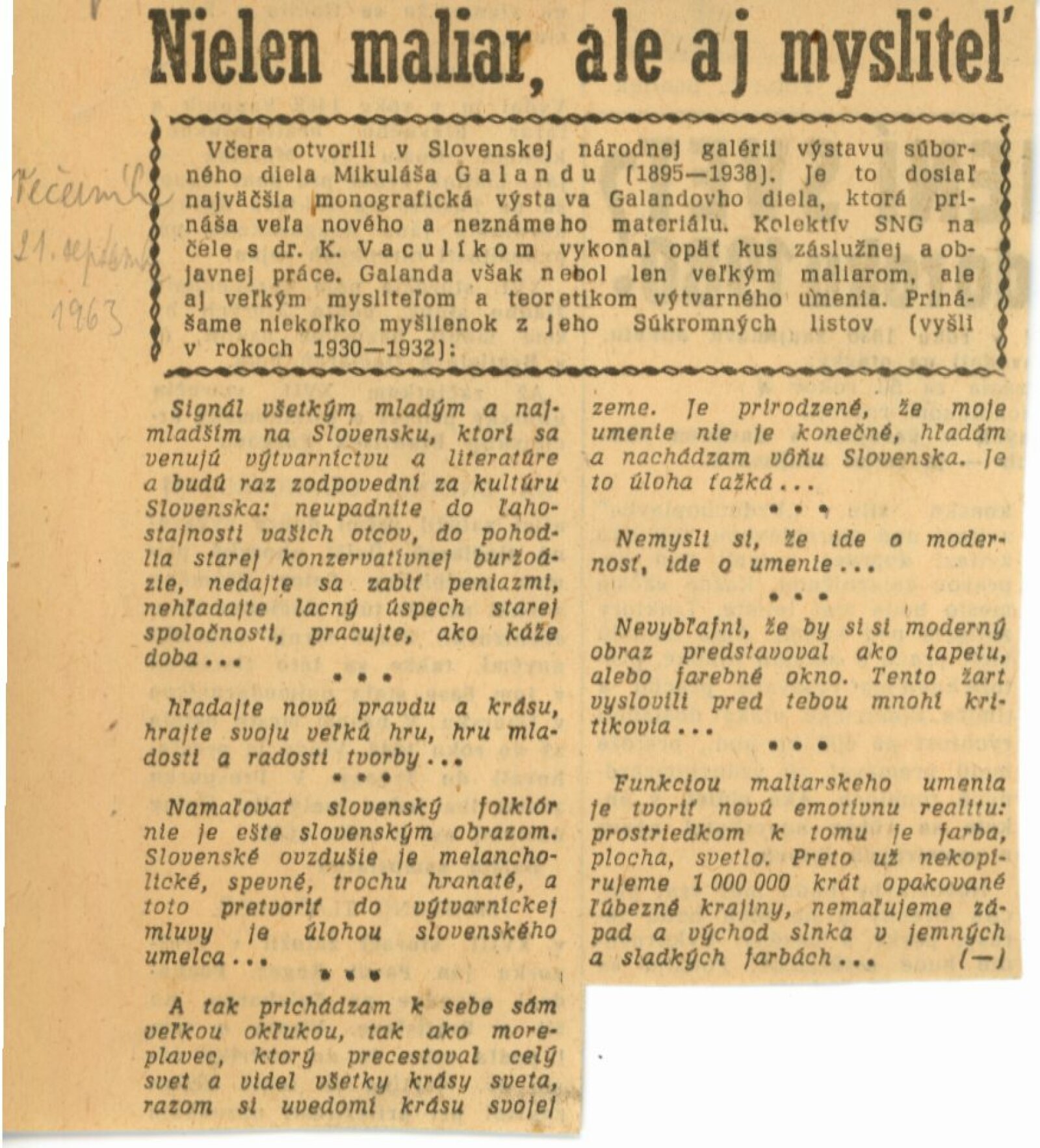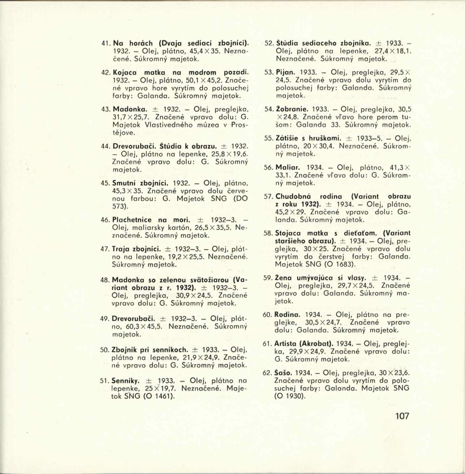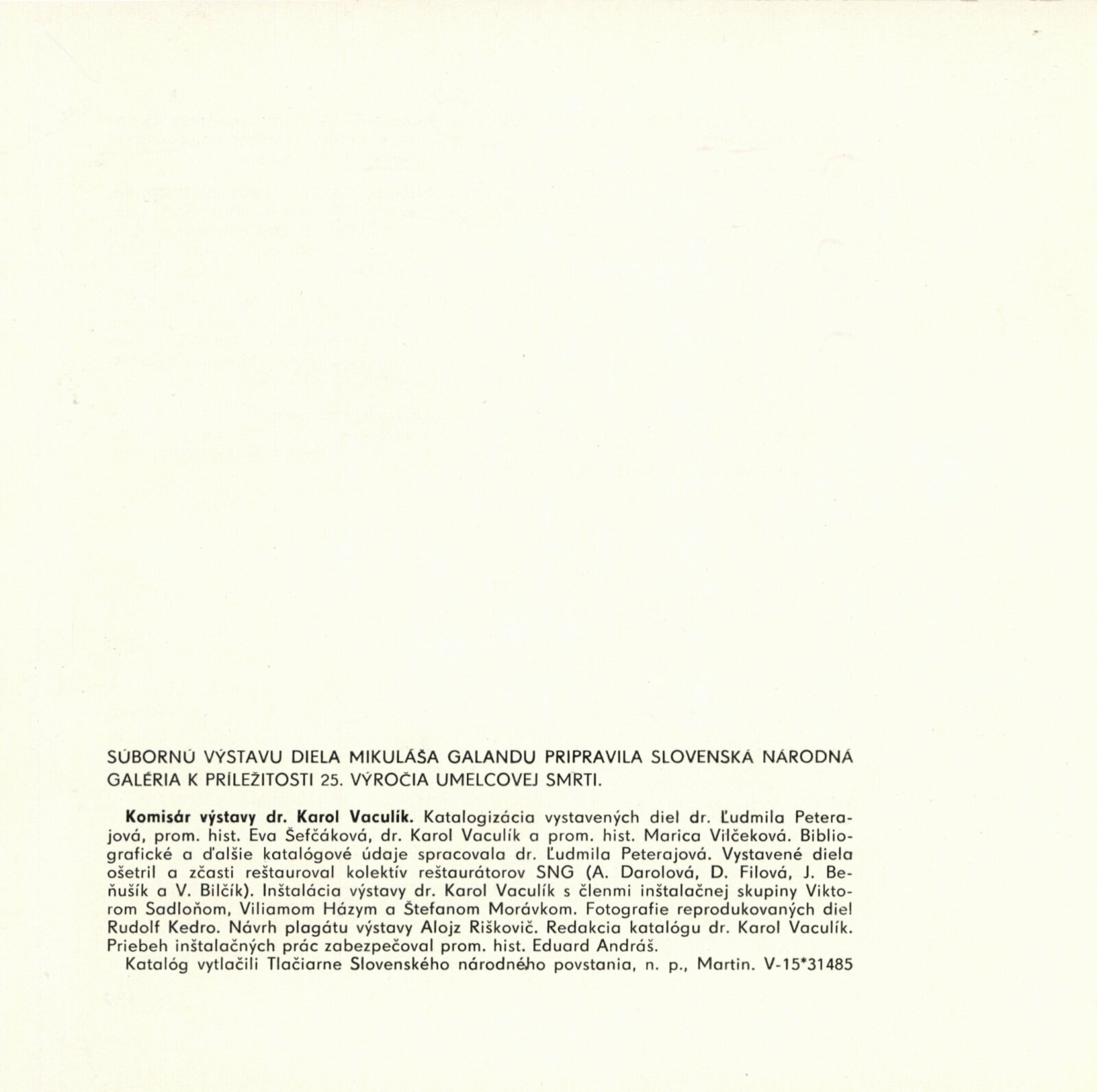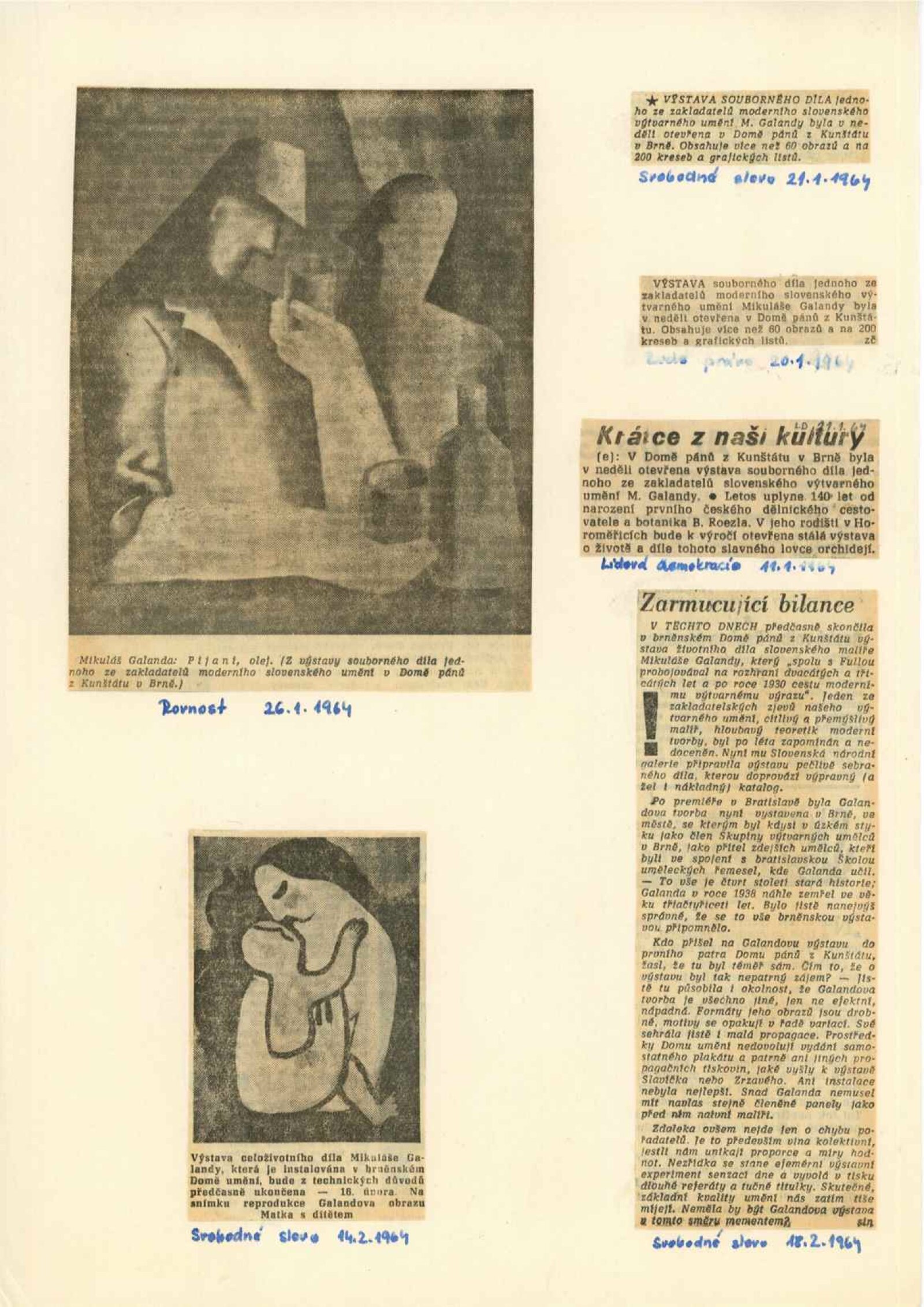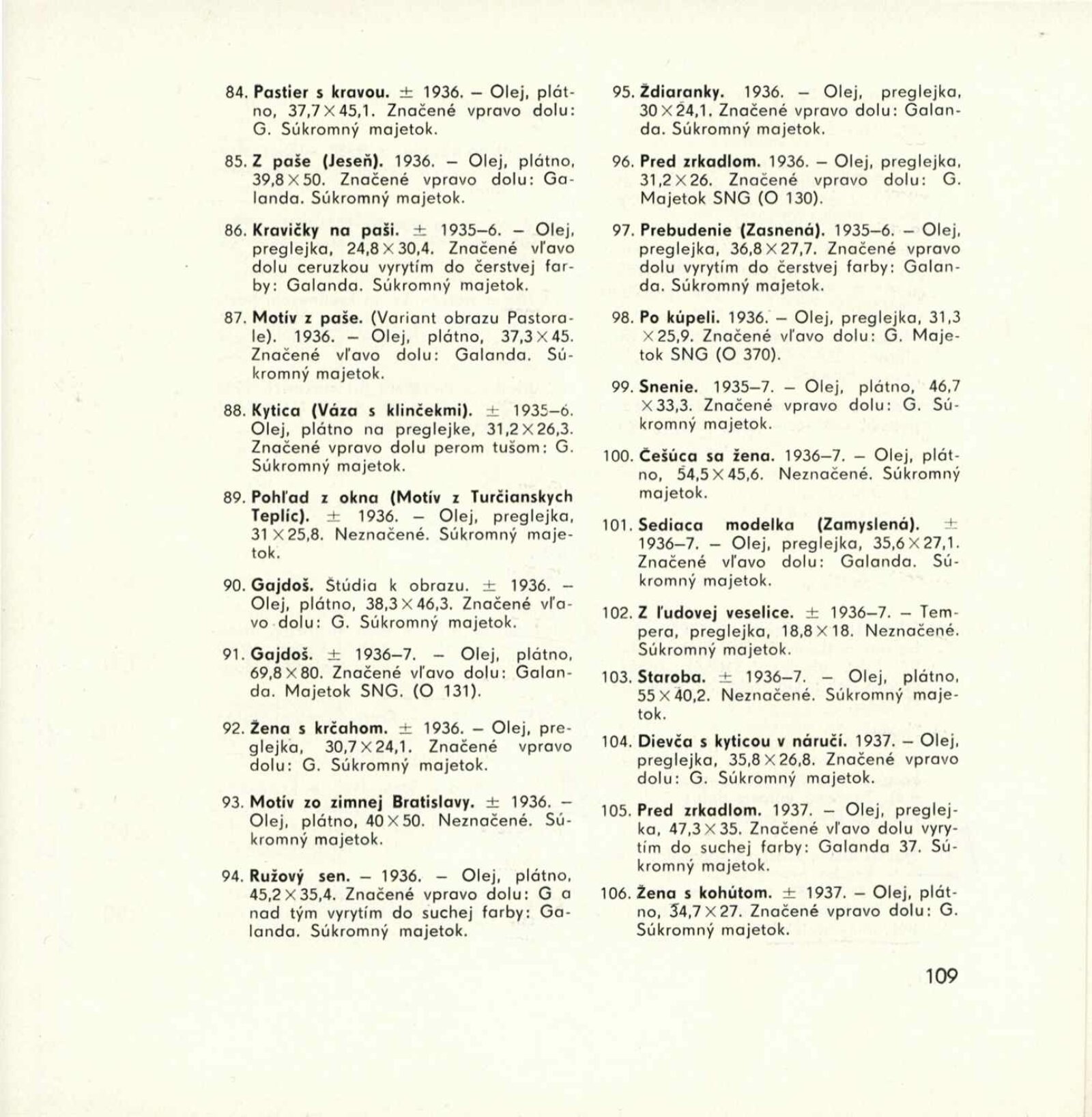 Mikuláš Galanda. Souborné dílo: Dům umění města Brna / Dům pánů z Kunštátu, 19. 1. – 23. 2. 1964 / Převzatý katalog. Dielo Mikuláša Galandu: Slovenská národná galéria Bratislava, září–prosinec 1963 / Text Karol Vaculík, z myšlienok Mikuláša Galandu. – Bratislava: Slovenská národná galéria, 1963. – 139 s., obr., životní data, výstavy, bibliografie, DPK 212. – MZK