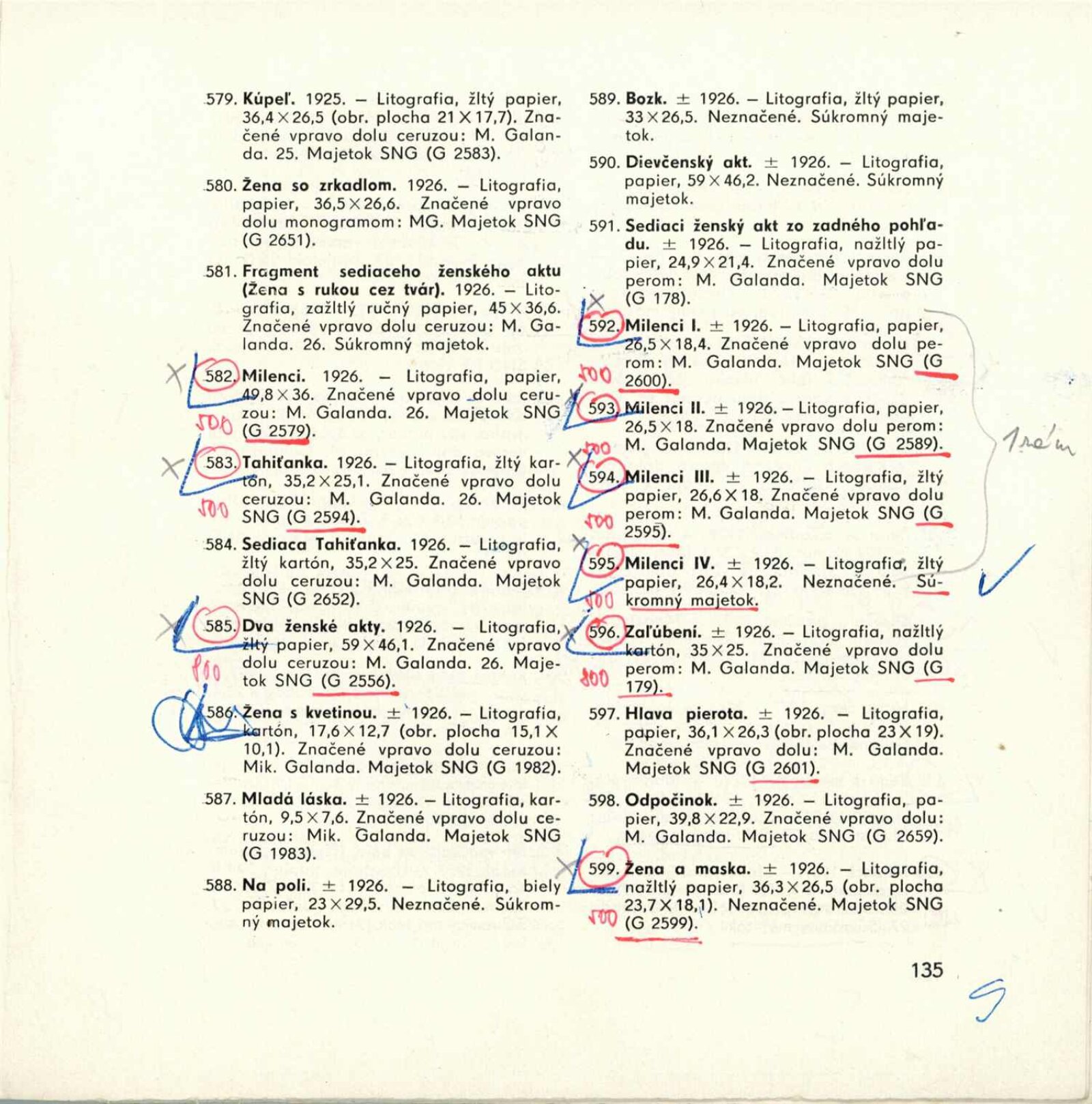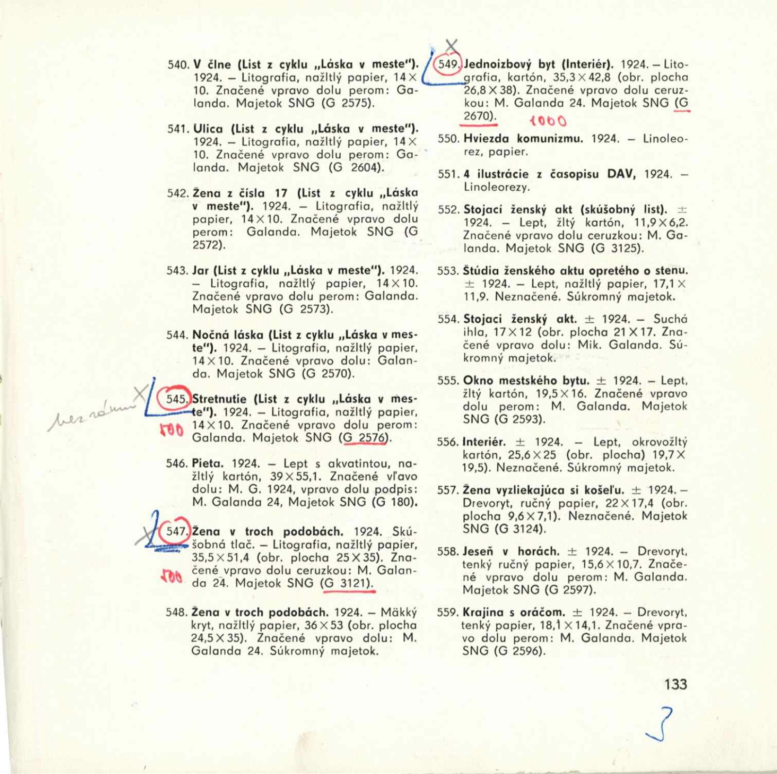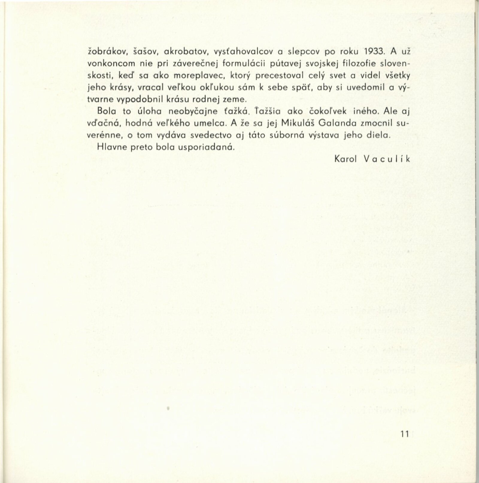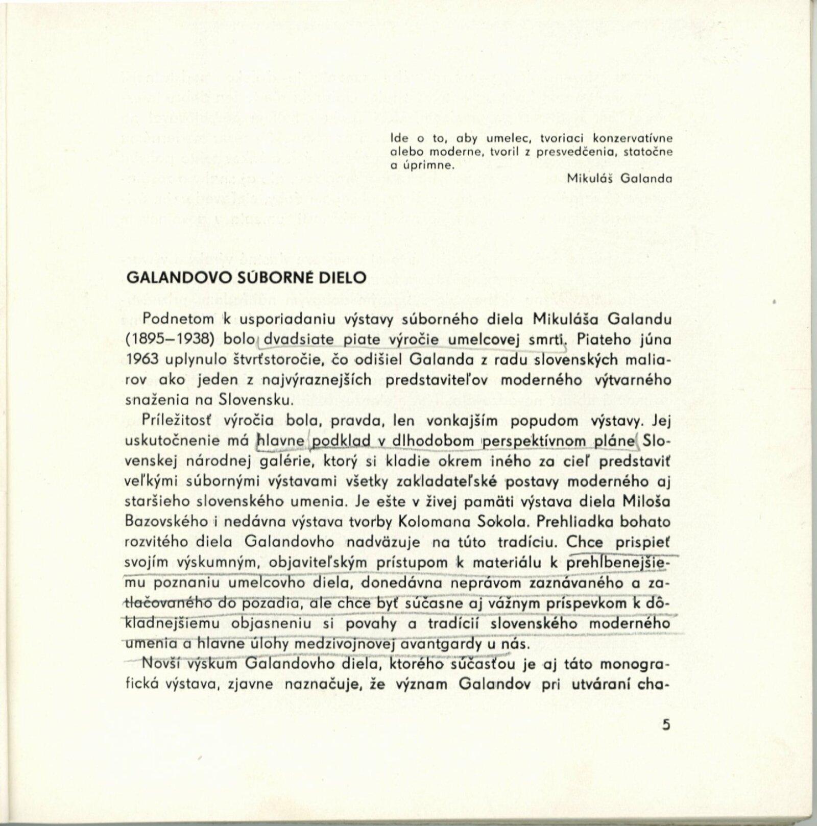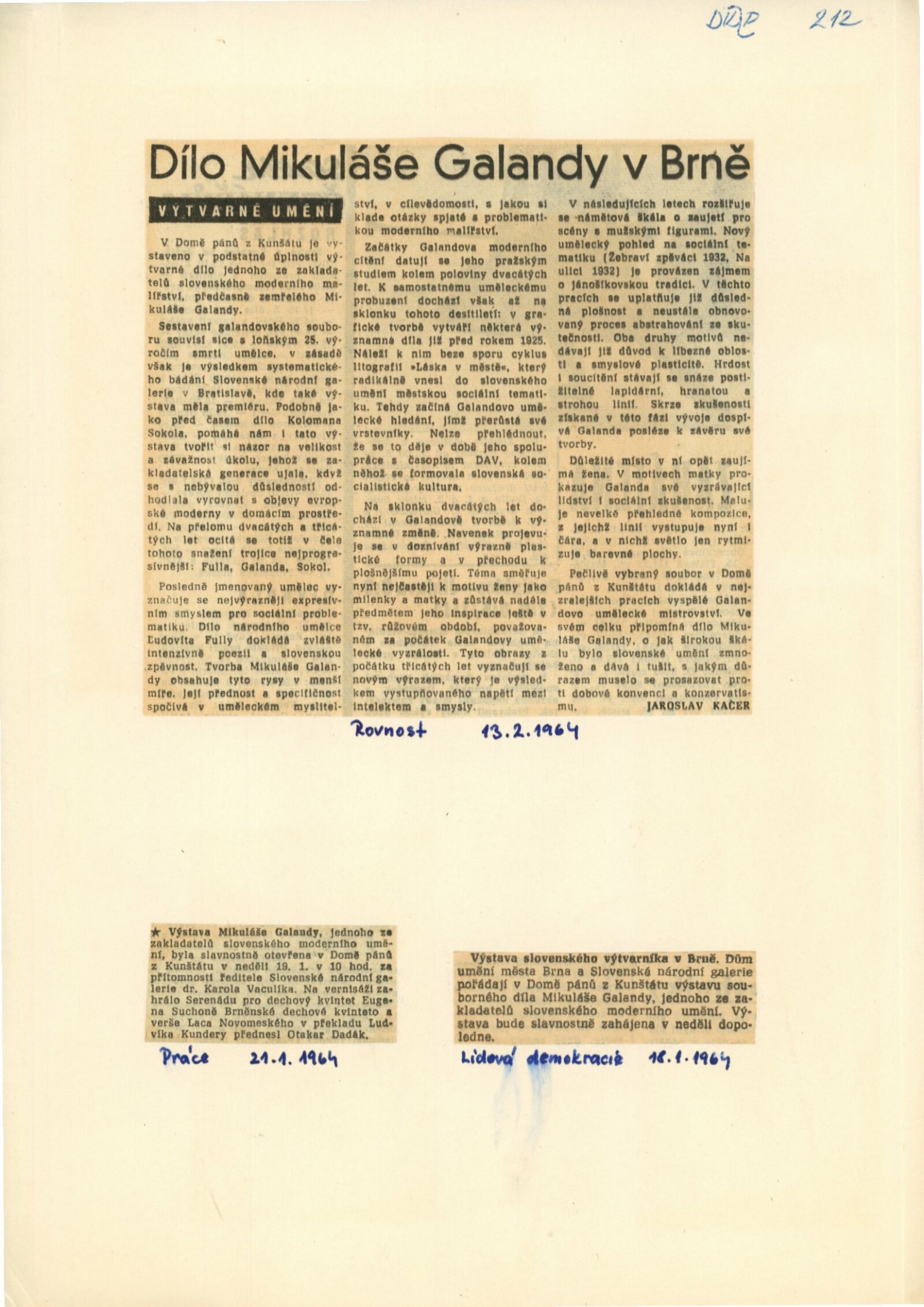 Mikuláš Galanda. Souborné dílo: Dům umění města Brna / Dům pánů z Kunštátu, 19. 1. – 23. 2. 1964 / Převzatý katalog. Dielo Mikuláša Galandu: Slovenská národná galéria Bratislava, září–prosinec 1963 / Text Karol Vaculík, z myšlienok Mikuláša Galandu. – Bratislava: Slovenská národná galéria, 1963. – 139 s., obr., životní data, výstavy, bibliografie, DPK 212. – MZK