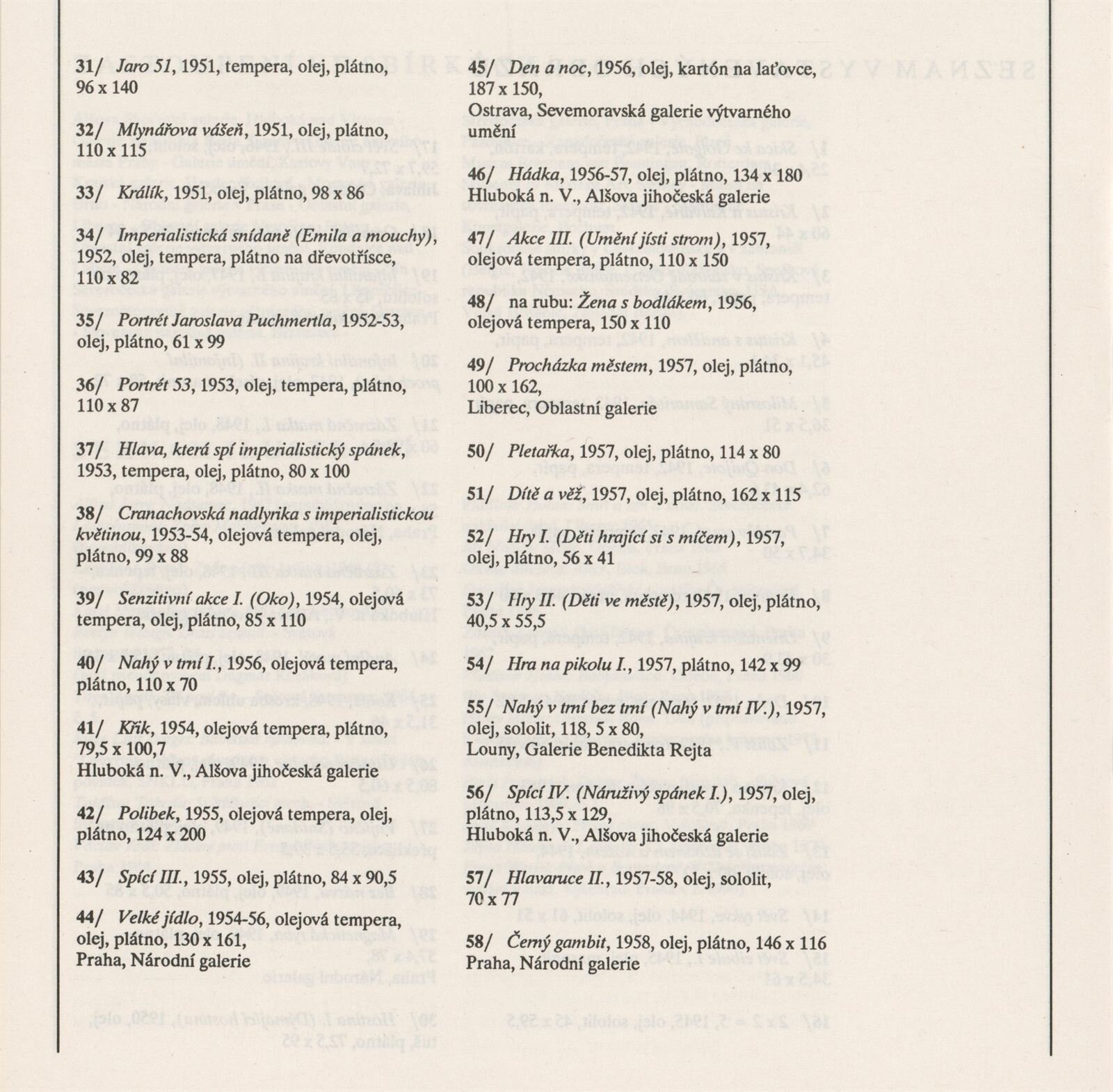 pozvánka, katalog, podklady pro katalog, návrh instalace výstavy, fotografie děl, seznam vystavených děl, pojistný seznam, provozní korespondence, potvrzení o převzetí, institucionální korespondence ohledně zápůjček, korespondence s majiteli, smlouva o výpůjčce, dohoda o uspořádání výstavy, hospodářská smlouva, recenze v tisku, digitalizovaný videozáznam výstavy z archivu Aleše Záboje (24.4.1990, 1:20, S-VHS), digitalizovaný videozáznam z výstavy (VHS)