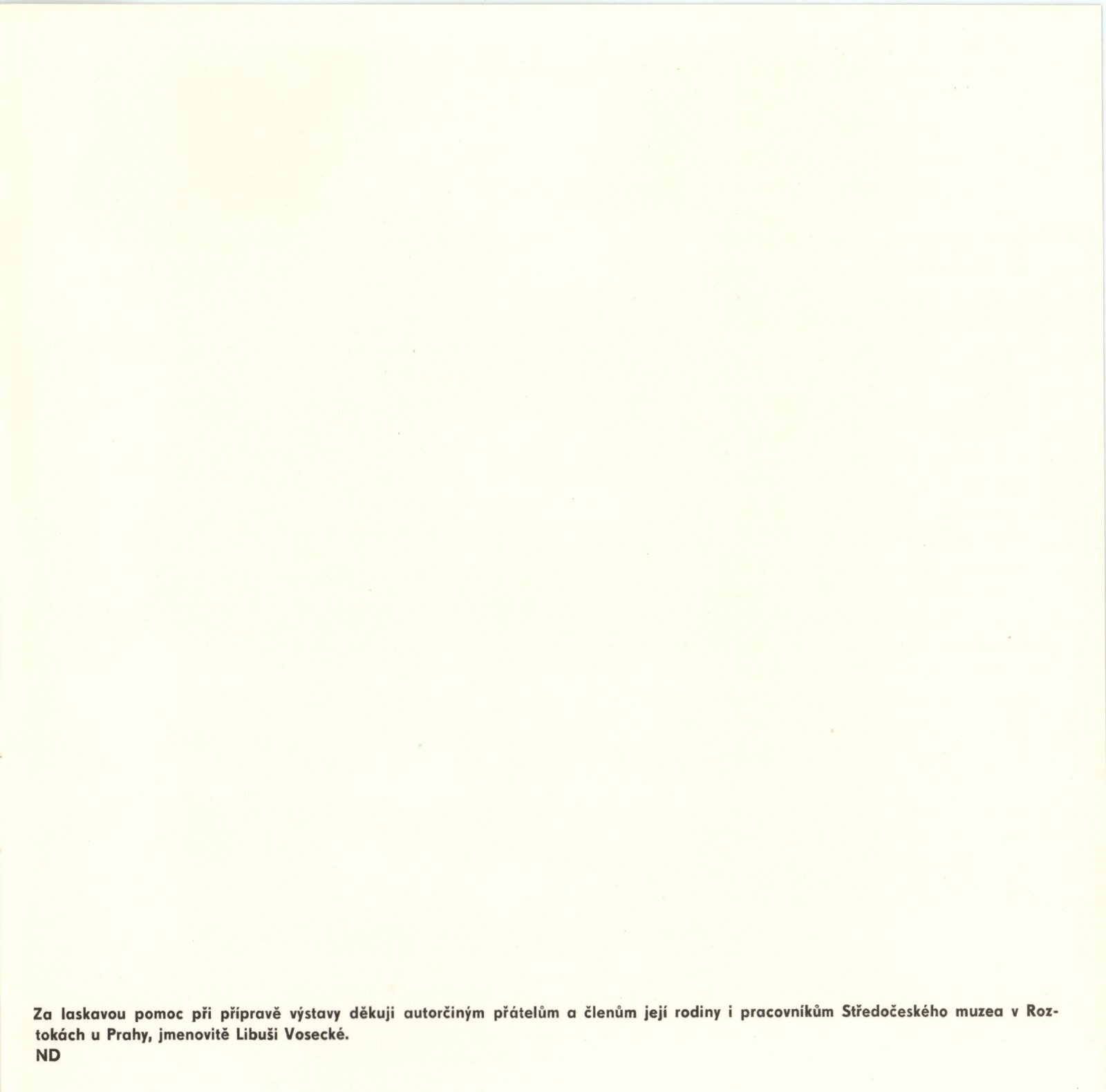 Milada Marešová. Obrazy, kresby: Dům umění / Dům pánů z Kunštátu, 6. 12. 1985 – 12. 1. 1986 / Text: Jiřina Hockeová. – Brno: DUmB, 1985. – 17 s., obr., životní data, DPK 860. – MZK; MG; MMB / Zasloužilá umělkyně Hedvika Zaorálková. Sochy: Dům umění / Dům pánů z Kunštátu, 6. 12. 1985 – 12. 1. 1986 / Text: Nina Dvořáková, báseň autorka. – Brno: DUmB, 1985. – 16 s., obr., životní data, DPK 860. – MZK; MG