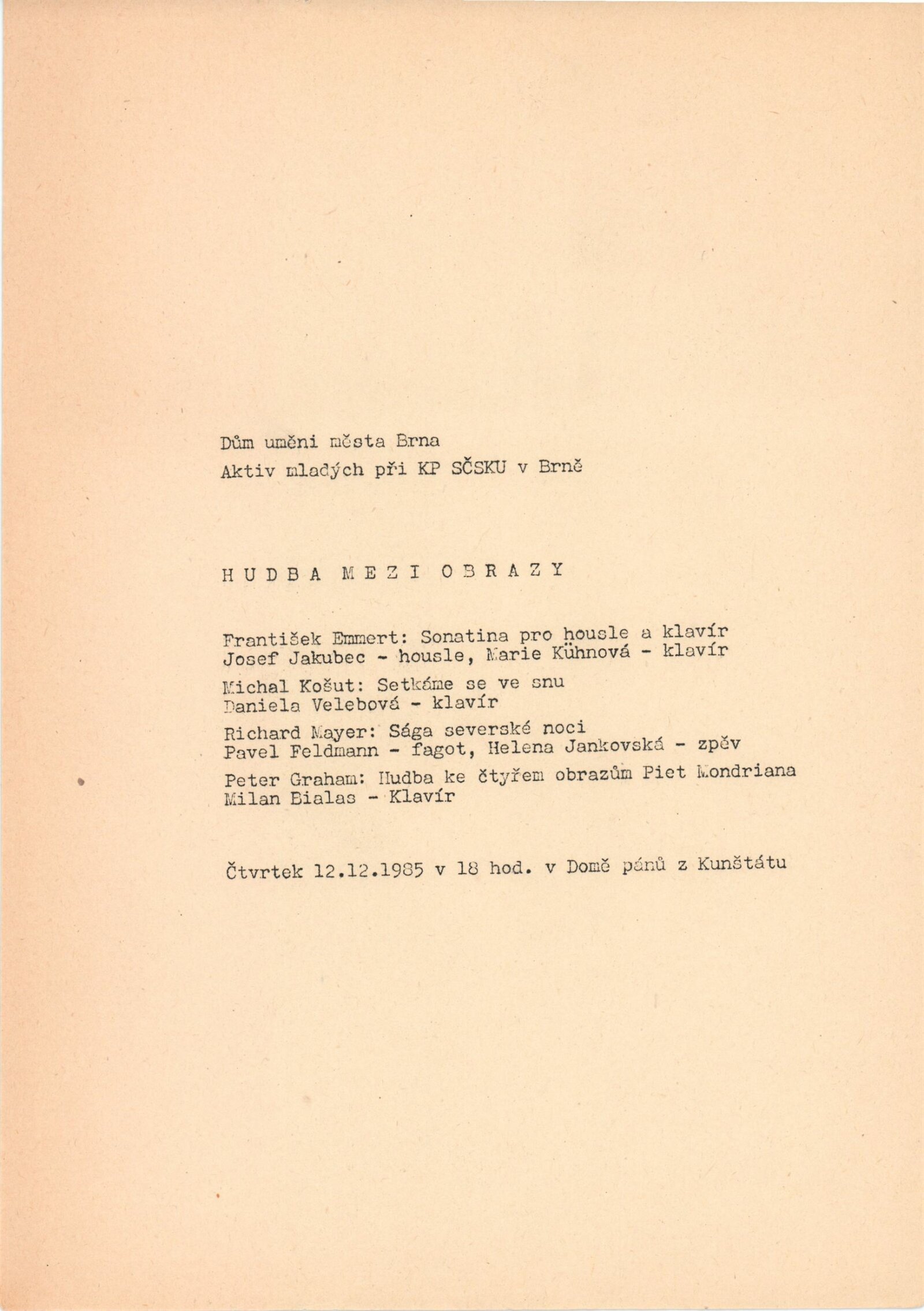 pozvánka, pozvání na Hudbu mezi obrazy, katalog, strojopis, fotografie a negativy ke katalogu, seznam vystavených děl, pojistný seznam, dohoda o pořádání výstavy, provozní korespondence, výpůjčky, převzetí a reversy Marešové a Zaorálkové (I. + II.), recenze v tisku, pozvánka na výstavu Marešové v Hluboké (1984), katalog výstavy Sociální tendence (1983), poznámky
