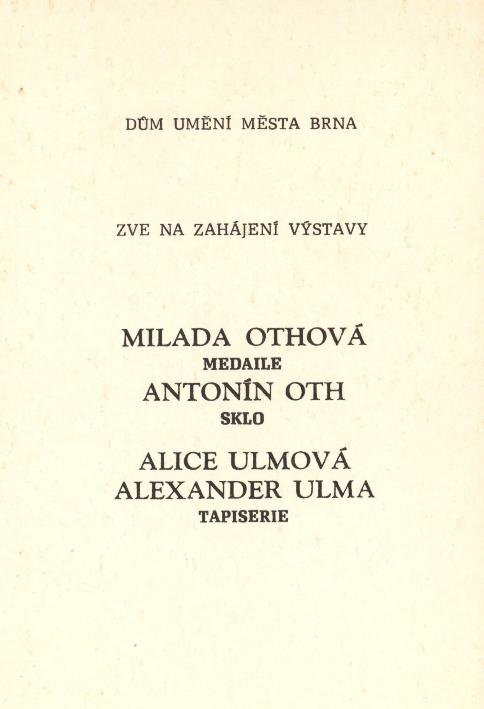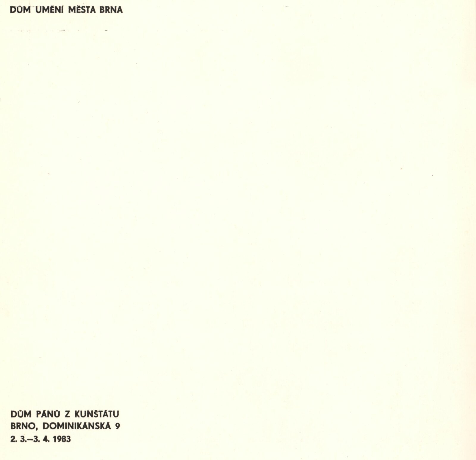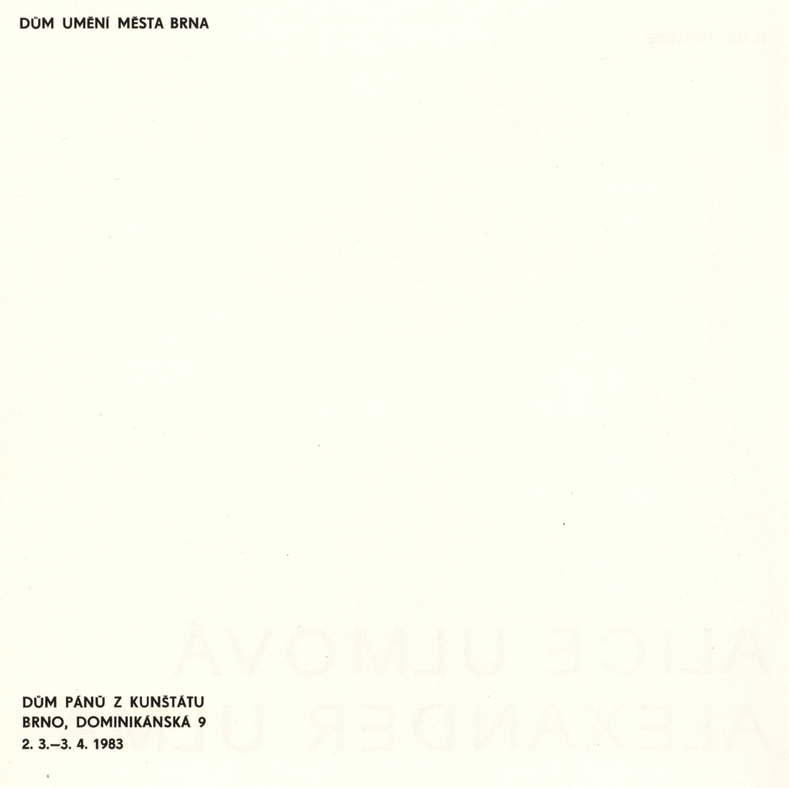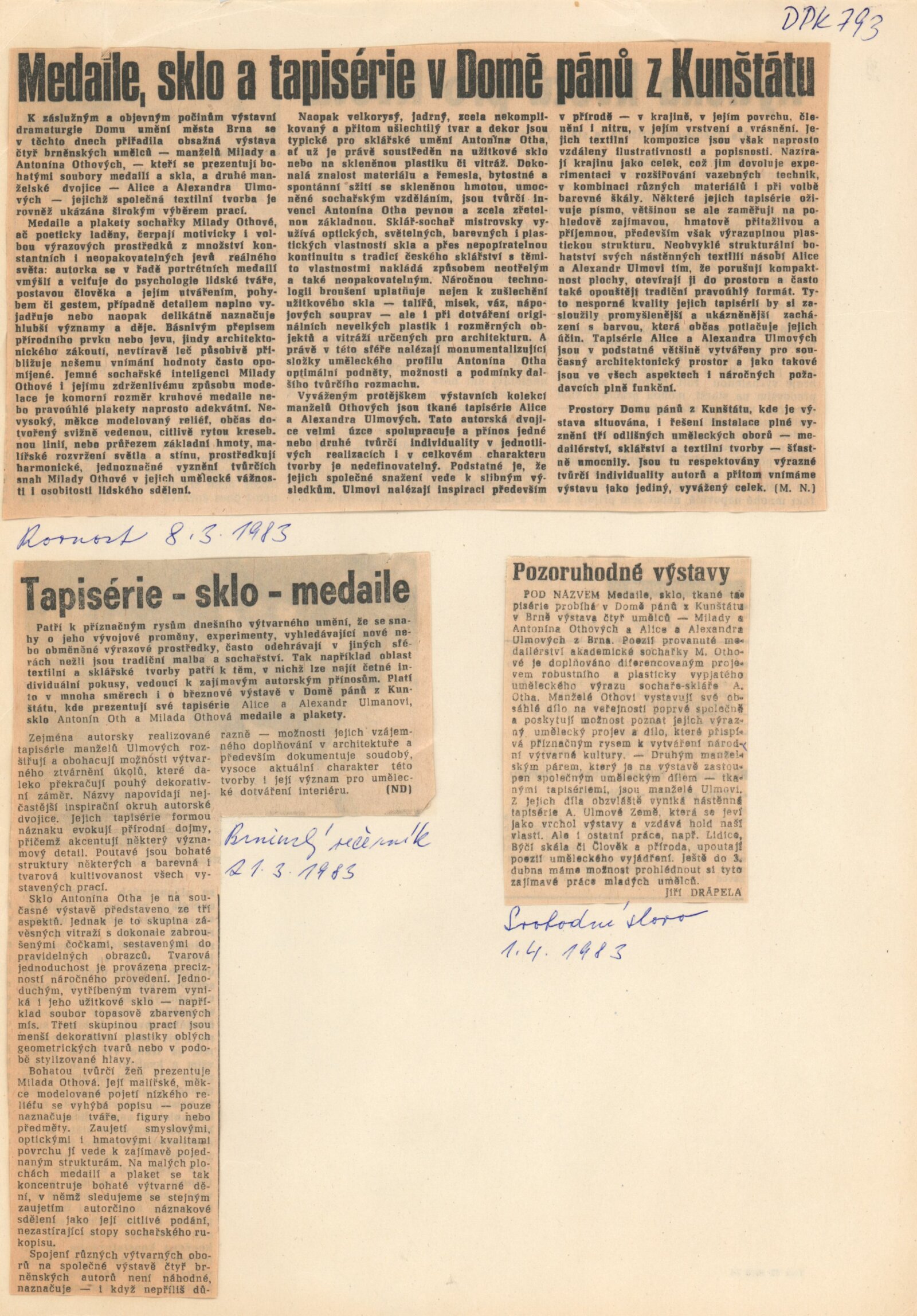 Milada Othová. Antonín Oth. Medaile, sklo: Dům umění / Dům pánů z Kunštátu, 1. patro, 2. 3. – 3. 4. 1983 / Text: Karel Holešovský. – Brno: DUmB, 1983. – 12 s., obr., životní data, výstavy, bibliografie, DPK 793. – MZK; MG; MMB / Alice Ulmová. Alexandr Ulma. Tkané tapiserie: Dům umění / Dům pánů z Kunštátu, 1. patro, 2. 3. – 3. 4. 1983 / Text: Ludmila Kybalová. – Brno: DUmB, 1983. – 13 s., obr., životní data, realizace v architektuře, DPK 793. – MZK; MG; MMB
