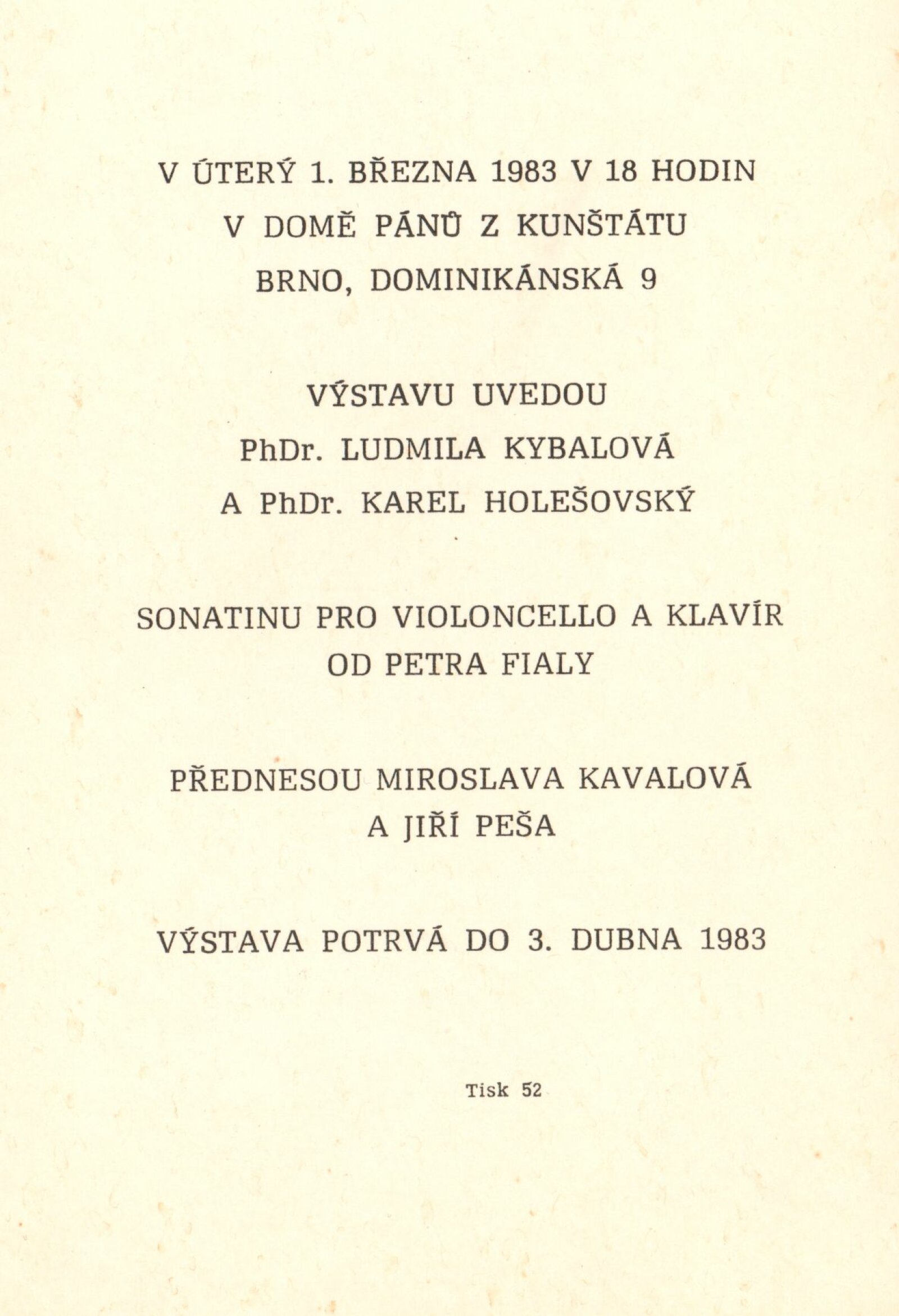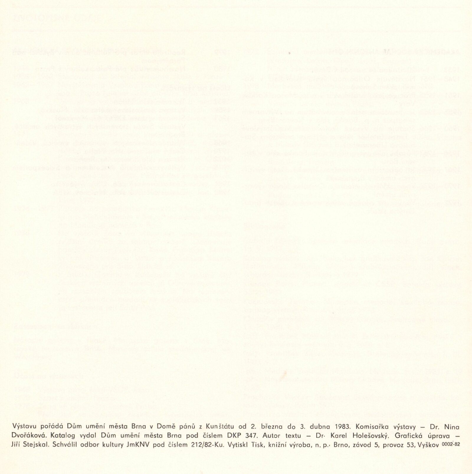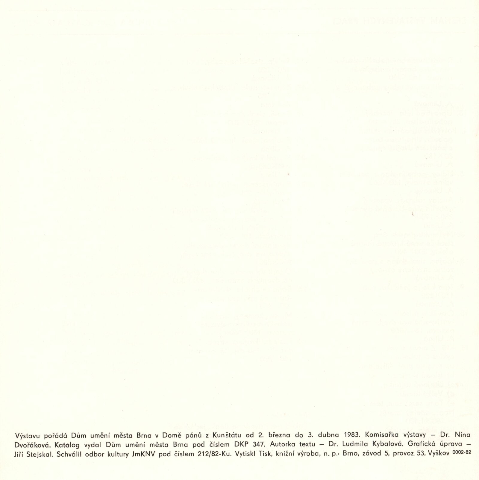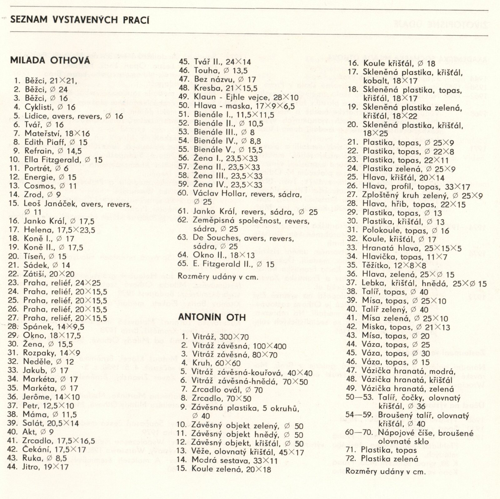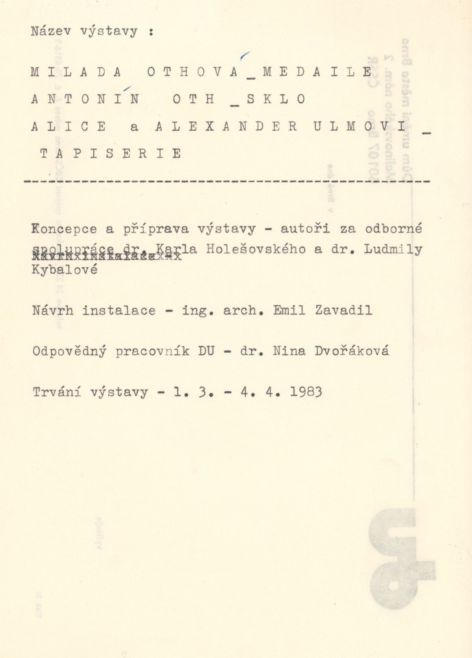 Milada Othová. Antonín Oth. Medaile, sklo: Dům umění / Dům pánů z Kunštátu, 1. patro, 2. 3. – 3. 4. 1983 / Text: Karel Holešovský. – Brno: DUmB, 1983. – 12 s., obr., životní data, výstavy, bibliografie, DPK 793. – MZK; MG; MMB / Alice Ulmová. Alexandr Ulma. Tkané tapiserie: Dům umění / Dům pánů z Kunštátu, 1. patro, 2. 3. – 3. 4. 1983 / Text: Ludmila Kybalová. – Brno: DUmB, 1983. – 13 s., obr., životní data, realizace v architektuře, DPK 793. – MZK; MG; MMB