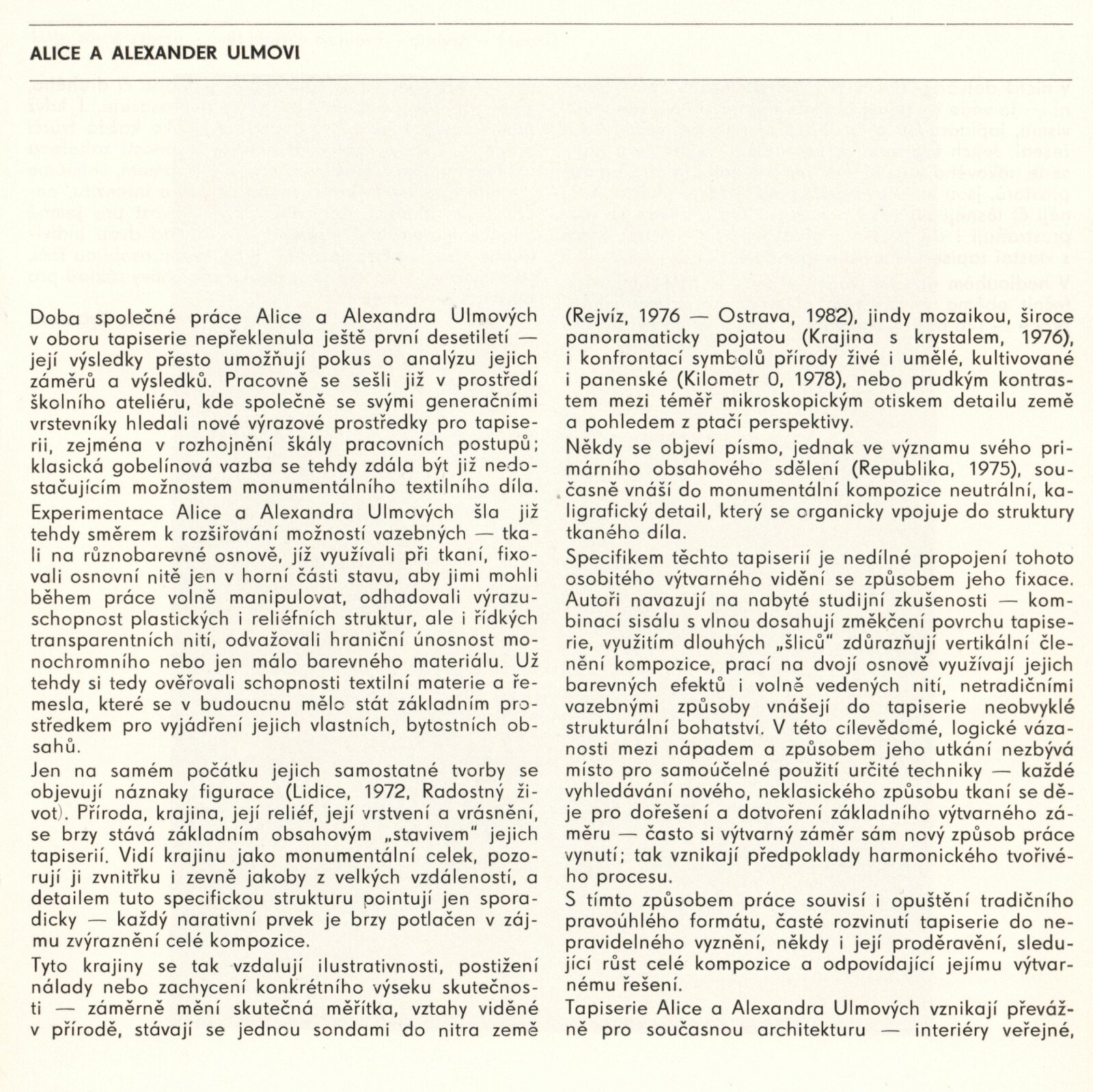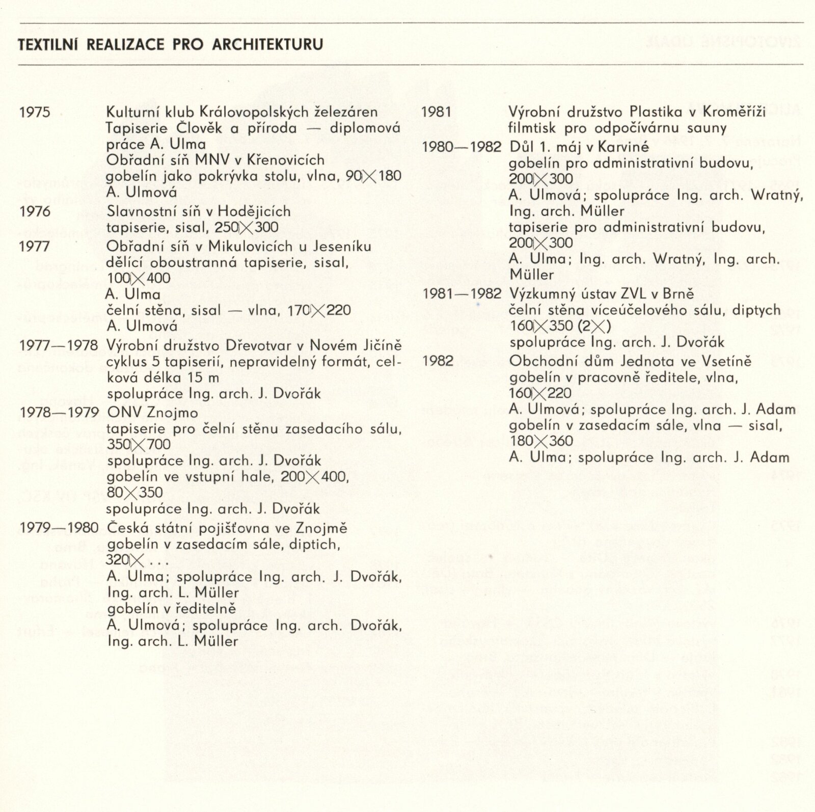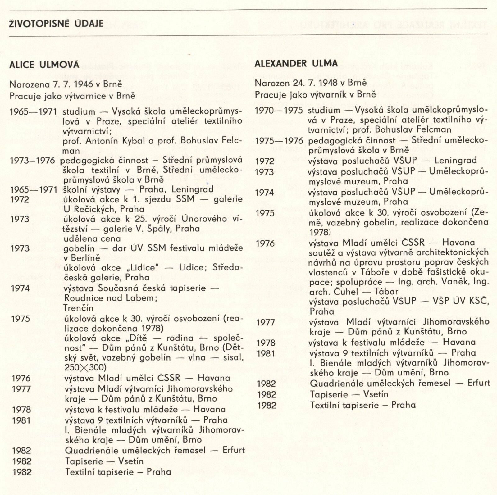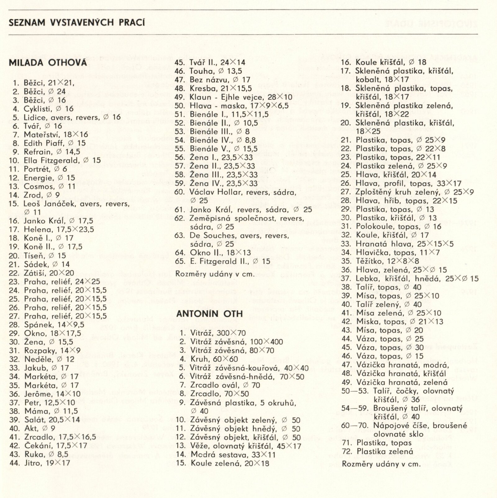 Milada Othová. Antonín Oth. Medaile, sklo: Dům umění / Dům pánů z Kunštátu, 1. patro, 2. 3. – 3. 4. 1983 / Text: Karel Holešovský. – Brno: DUmB, 1983. – 12 s., obr., životní data, výstavy, bibliografie, DPK 793. – MZK; MG; MMB / Alice Ulmová. Alexandr Ulma. Tkané tapiserie: Dům umění / Dům pánů z Kunštátu, 1. patro, 2. 3. – 3. 4. 1983 / Text: Ludmila Kybalová. – Brno: DUmB, 1983. – 13 s., obr., životní data, realizace v architektuře, DPK 793. – MZK; MG; MMB