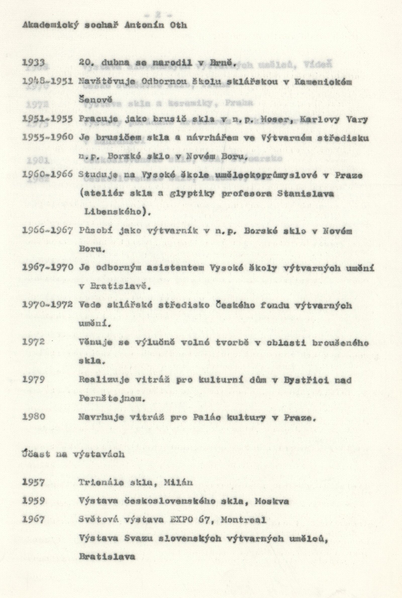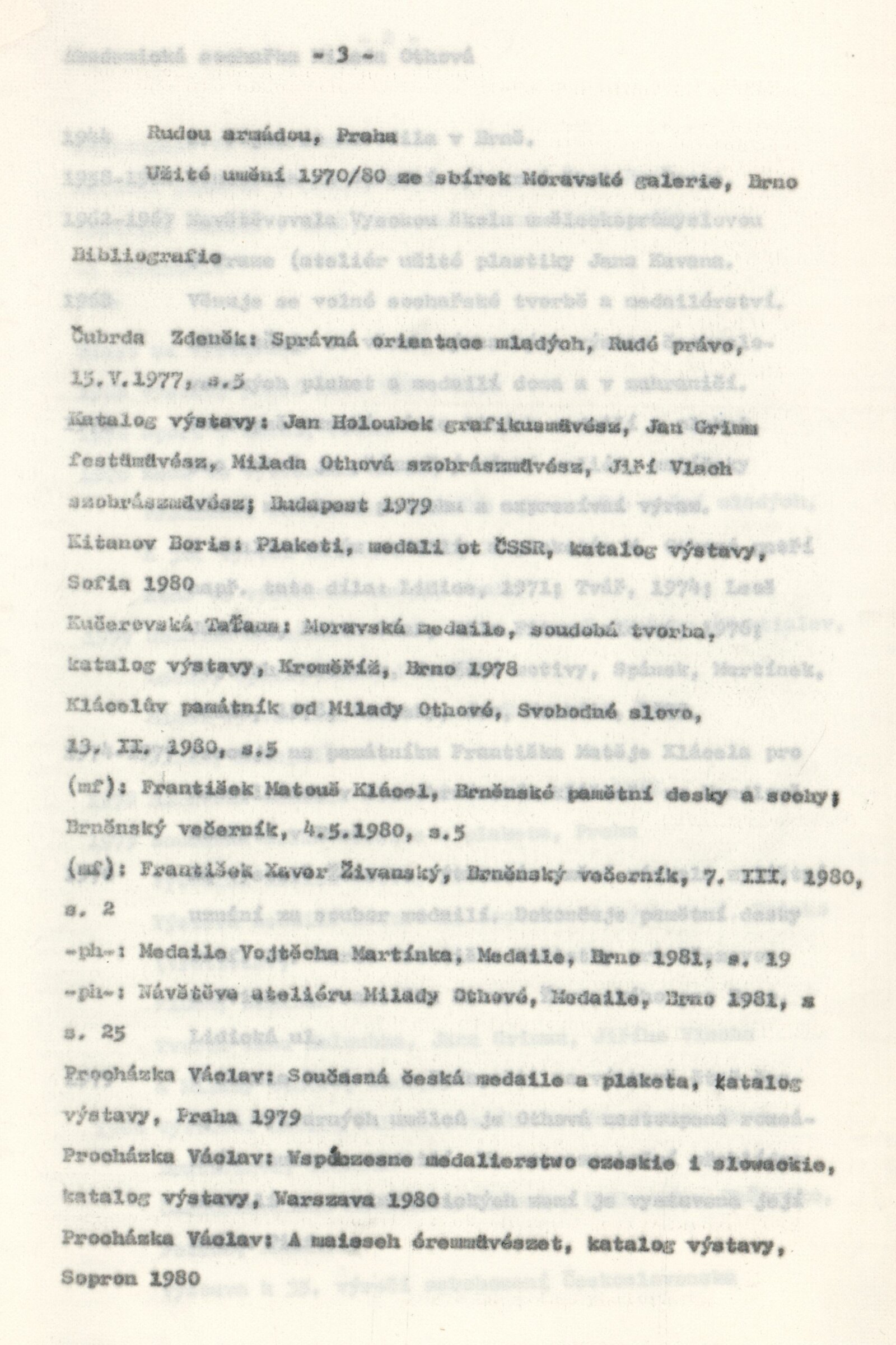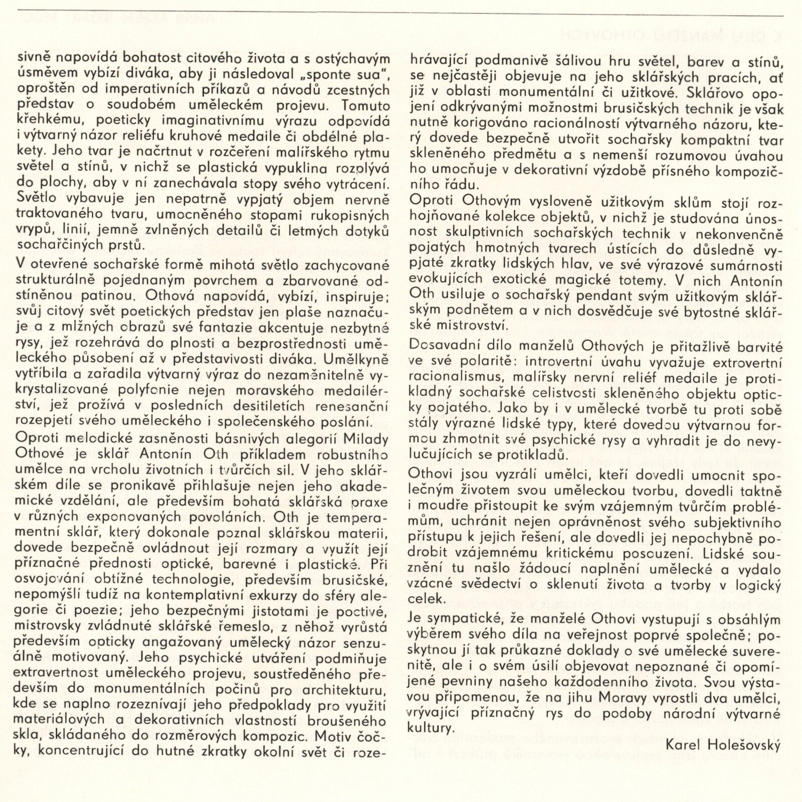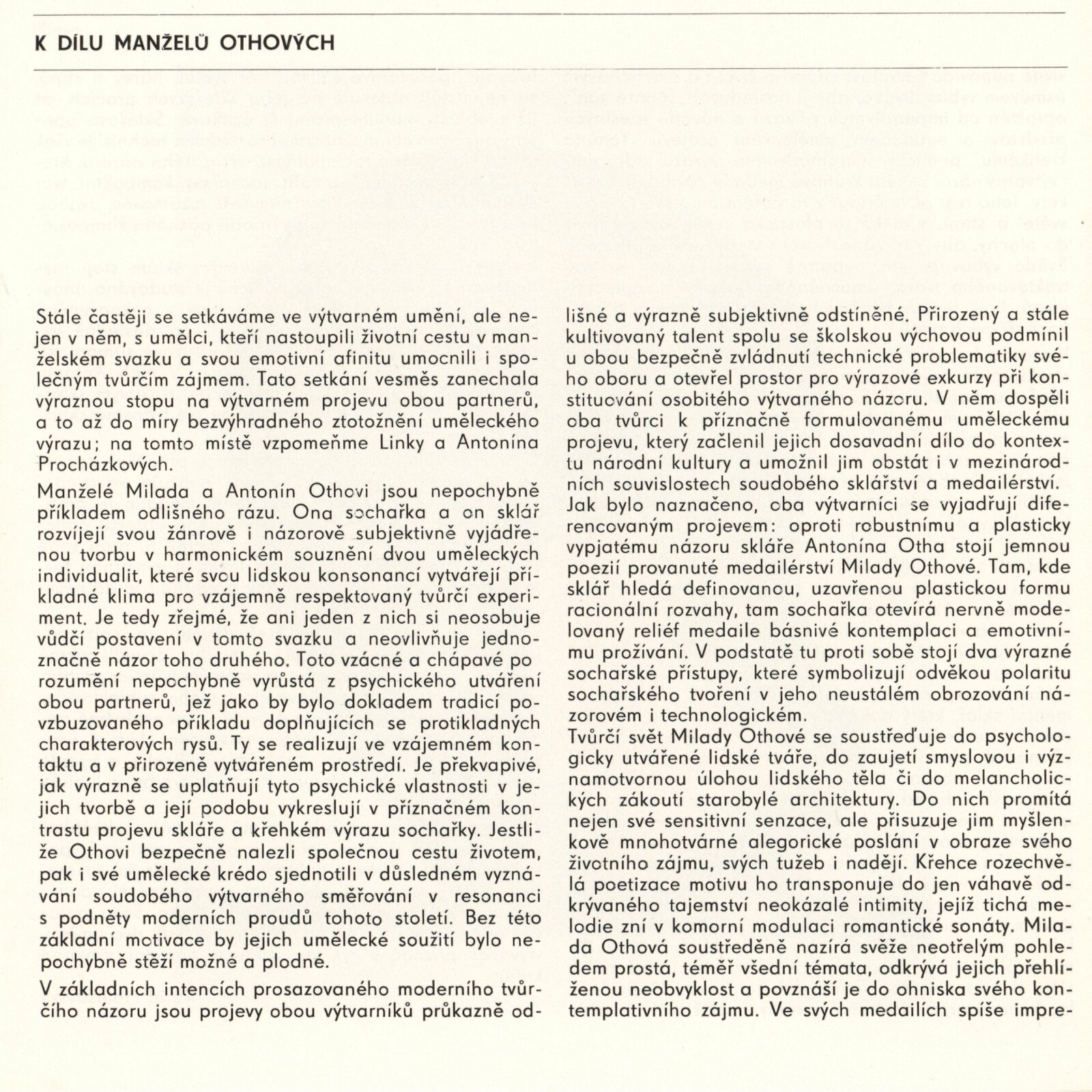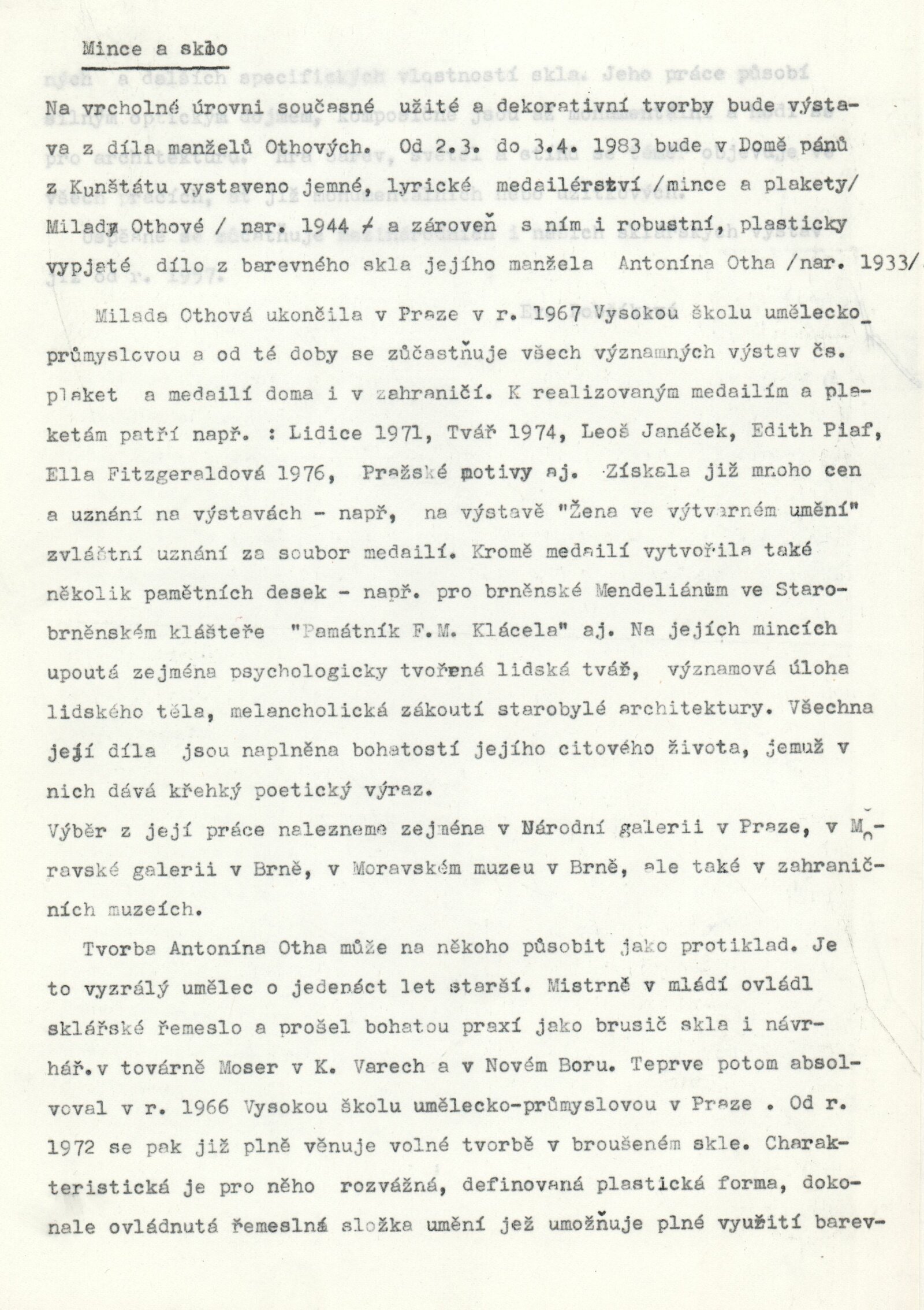 Milada Othová. Antonín Oth. Medaile, sklo: Dům umění / Dům pánů z Kunštátu, 1. patro, 2. 3. – 3. 4. 1983 / Text: Karel Holešovský. – Brno: DUmB, 1983. – 12 s., obr., životní data, výstavy, bibliografie, DPK 793. – MZK; MG; MMB / Alice Ulmová. Alexandr Ulma. Tkané tapiserie: Dům umění / Dům pánů z Kunštátu, 1. patro, 2. 3. – 3. 4. 1983 / Text: Ludmila Kybalová. – Brno: DUmB, 1983. – 13 s., obr., životní data, realizace v architektuře, DPK 793. – MZK; MG; MMB