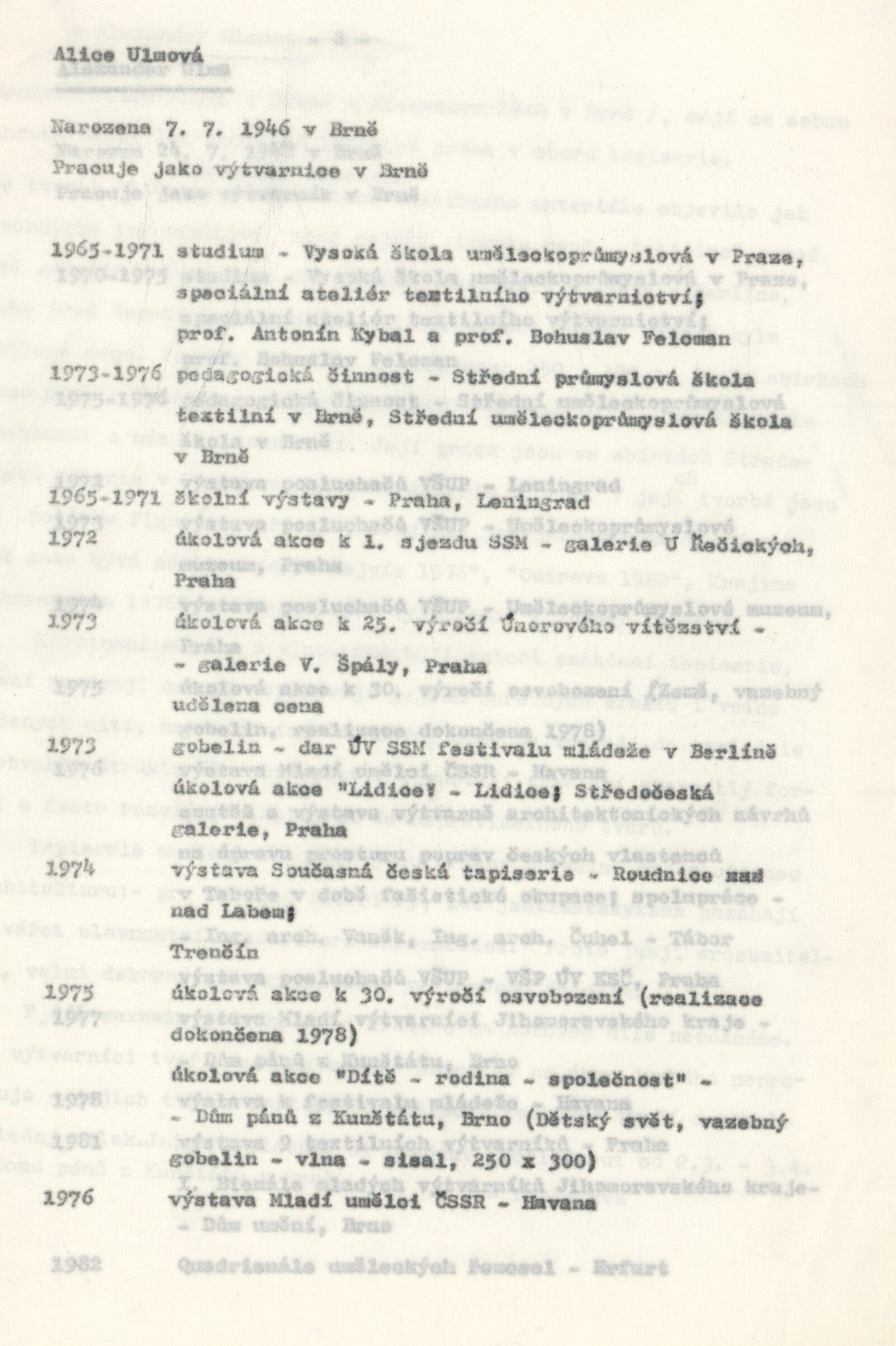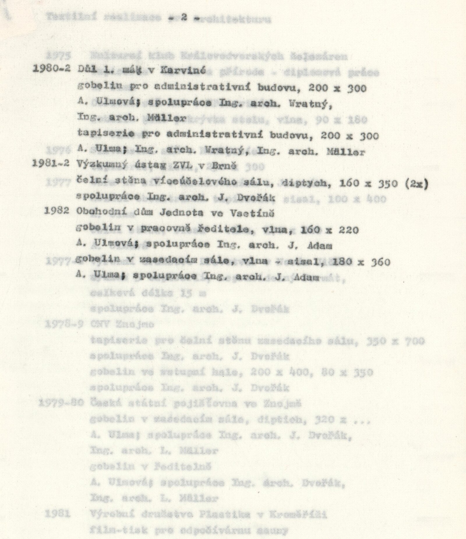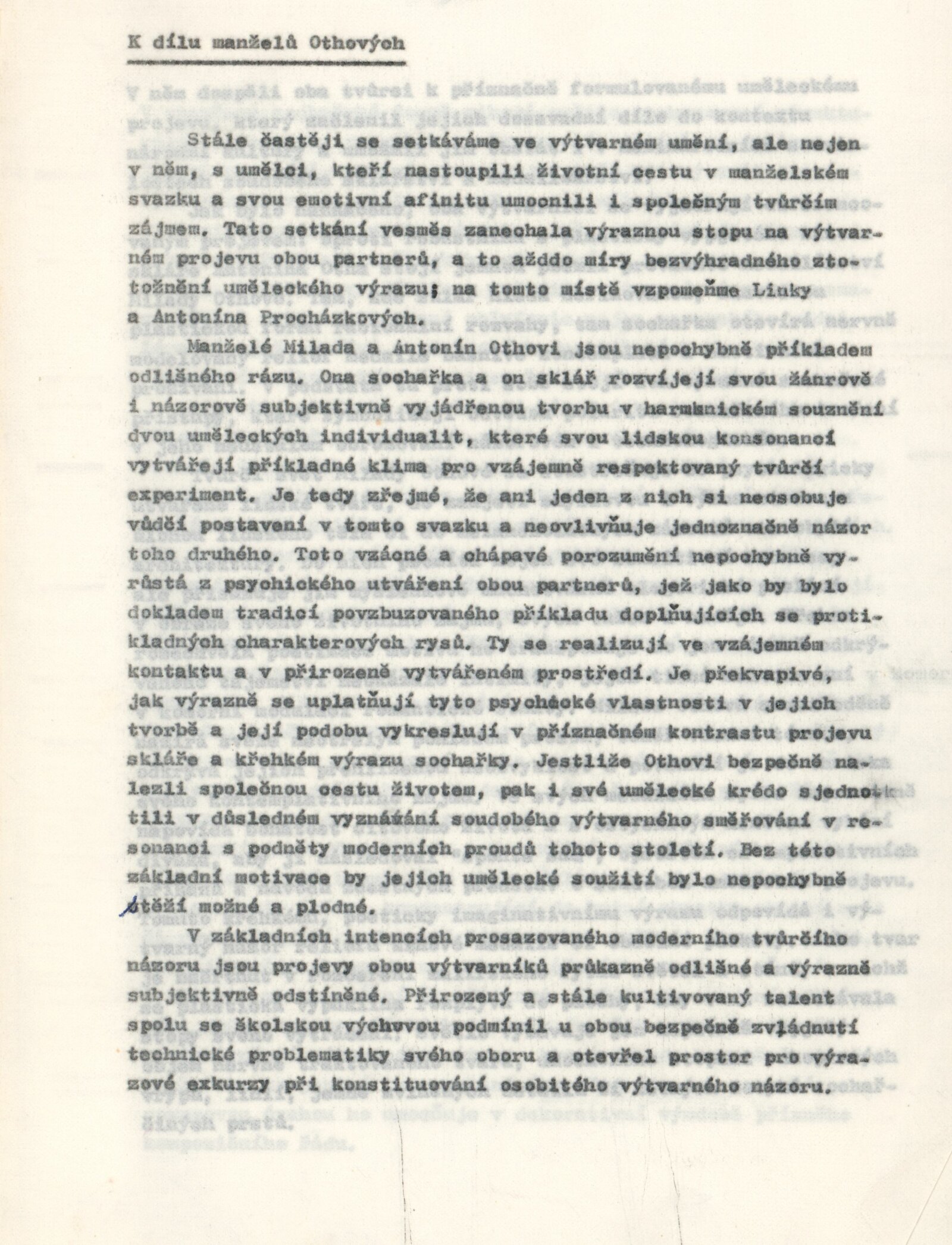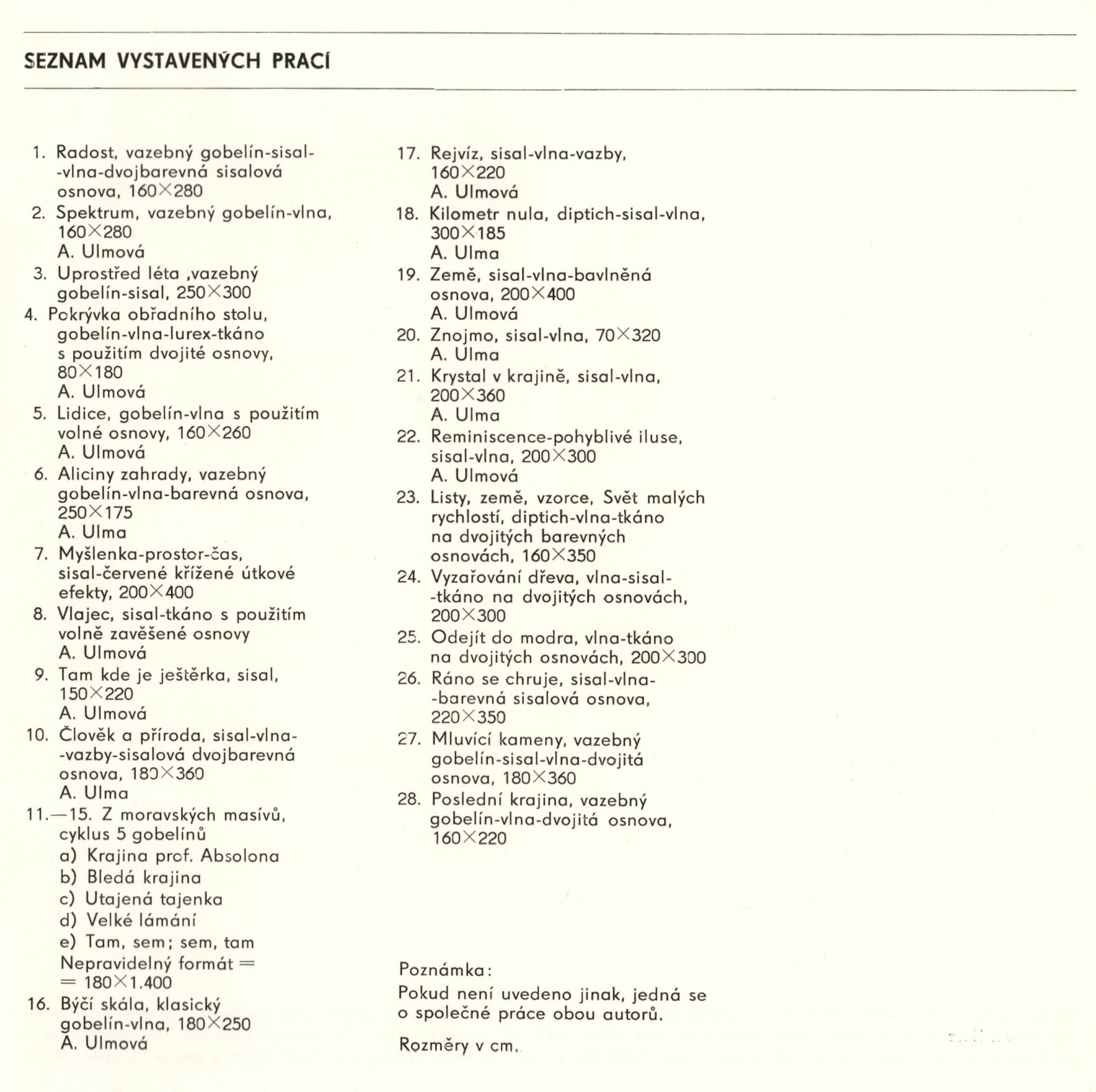 pozvánka, katalog, strojopis, počet vystavených děl, pojistný seznam, provozní korespondence, dopis z Hannoveru – Textilkunst, text Ludmily Kybalové (NJ), žádosti o zapůjčení, potvrzení převzetí vystavených děl, žádost o výstavu manželů Othových a Ulmových, text Evy Dobšíkové o Miladě a Antonínovi Othových, recenze v tisku