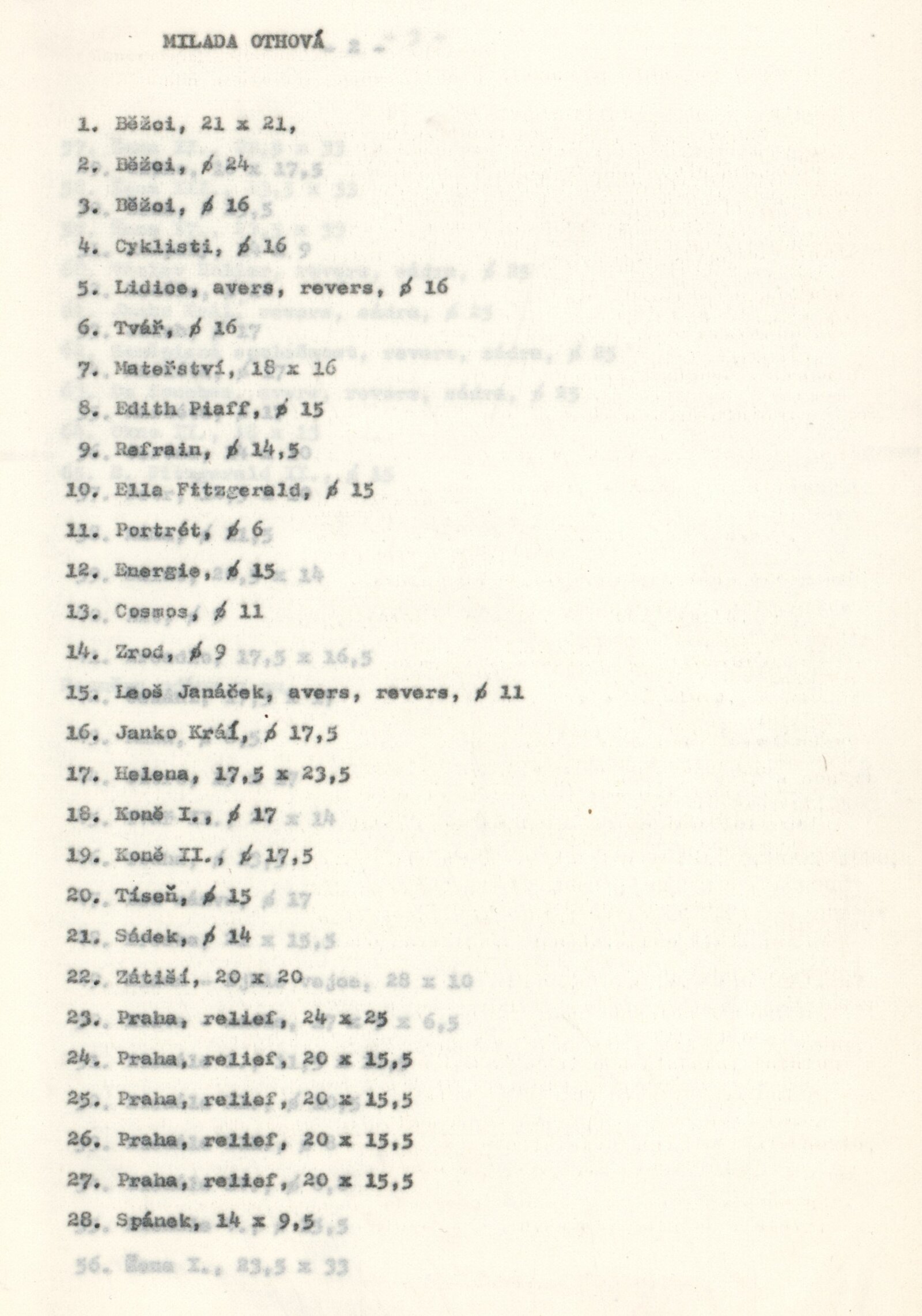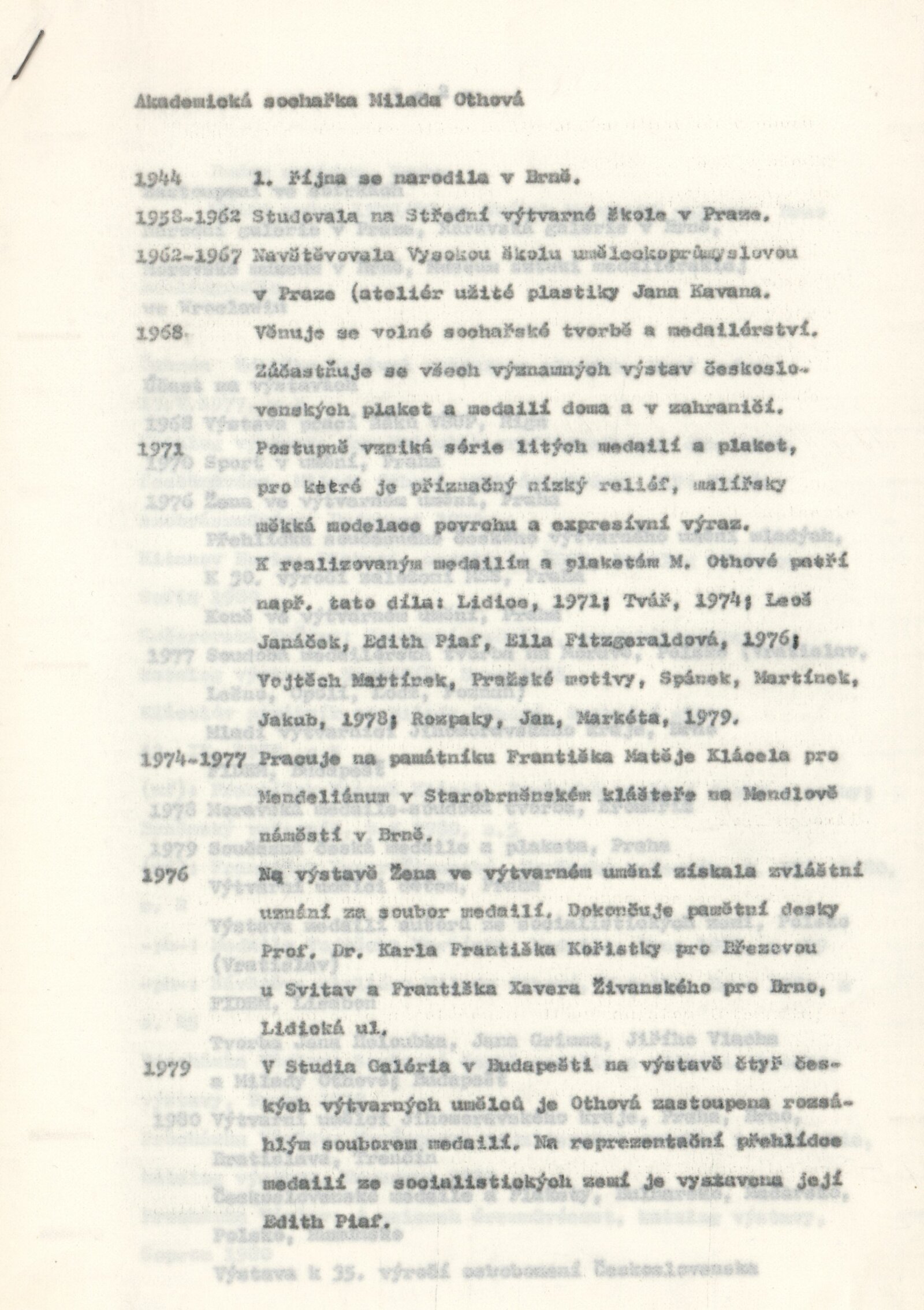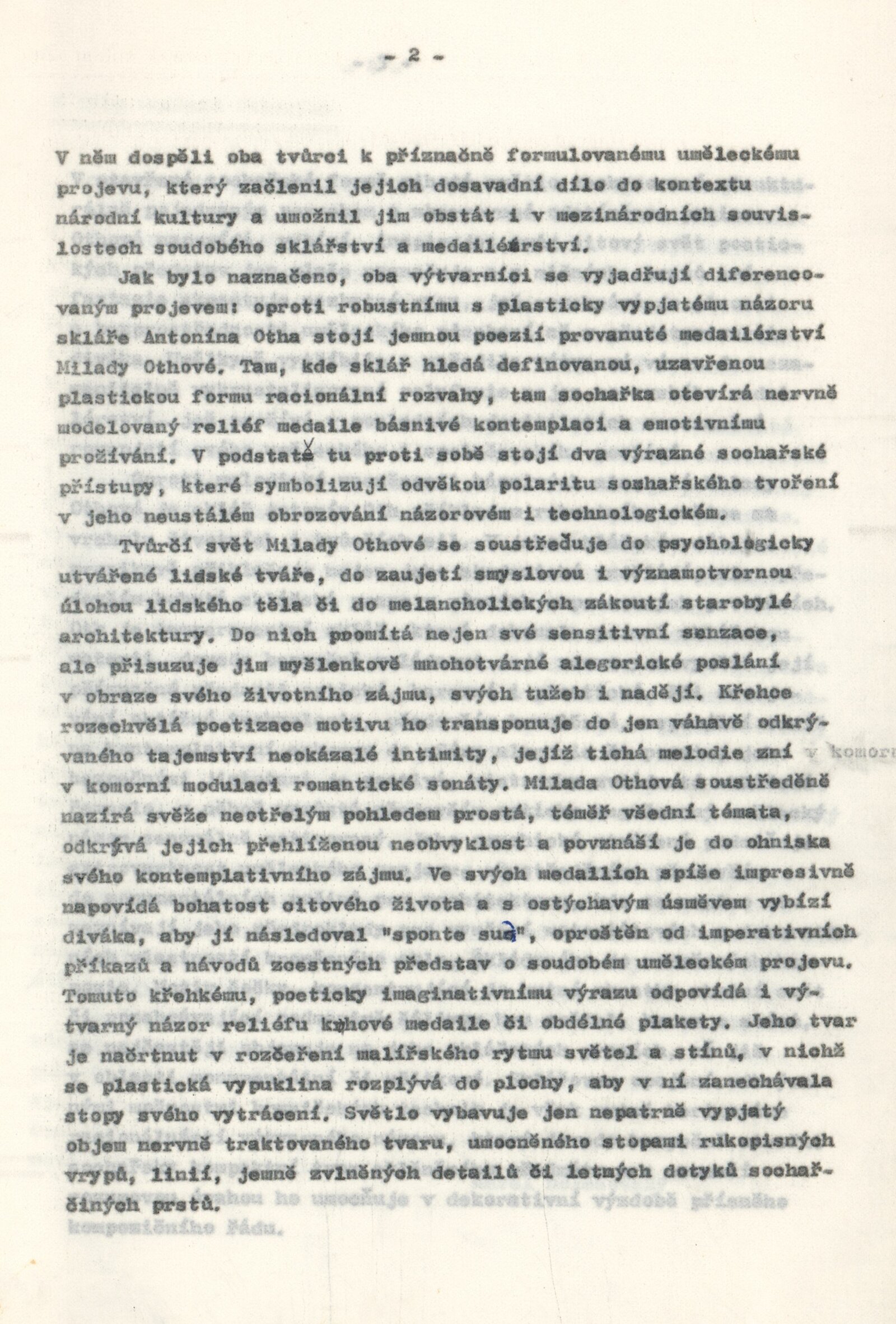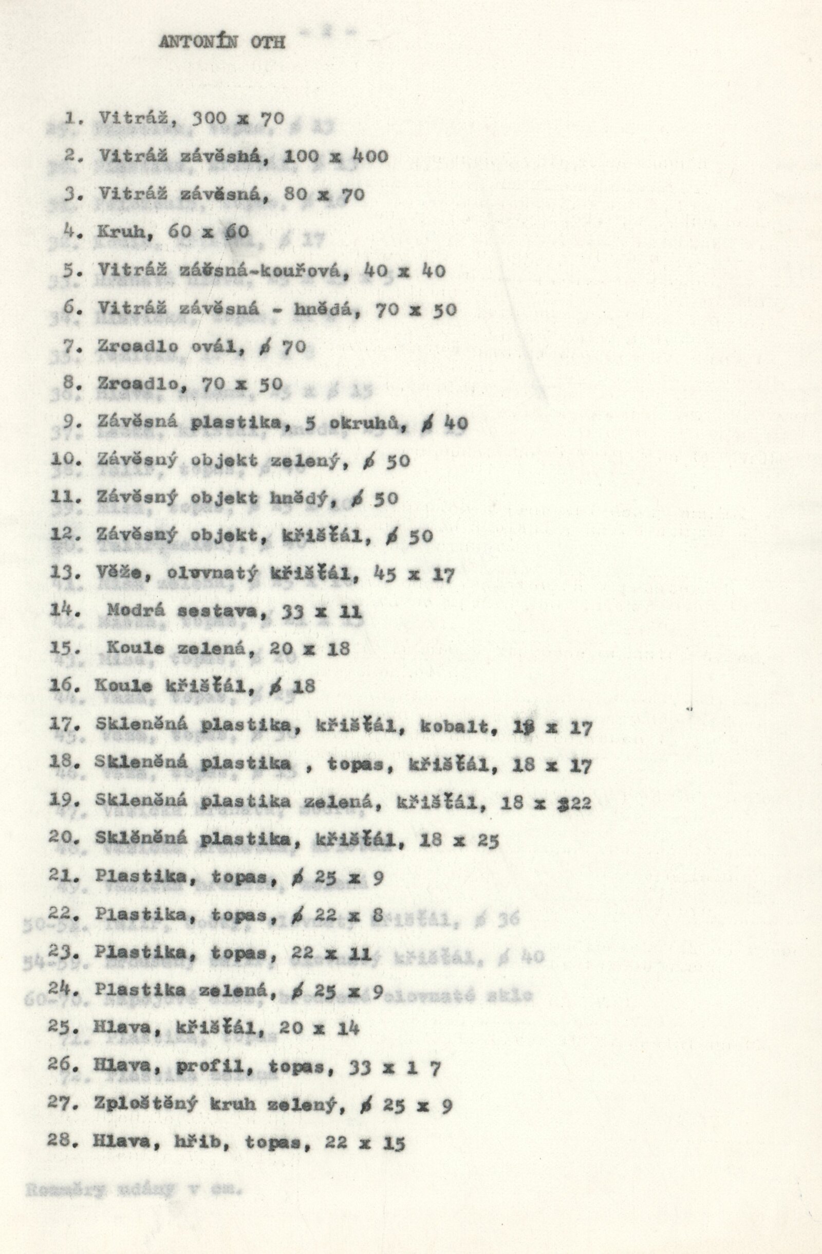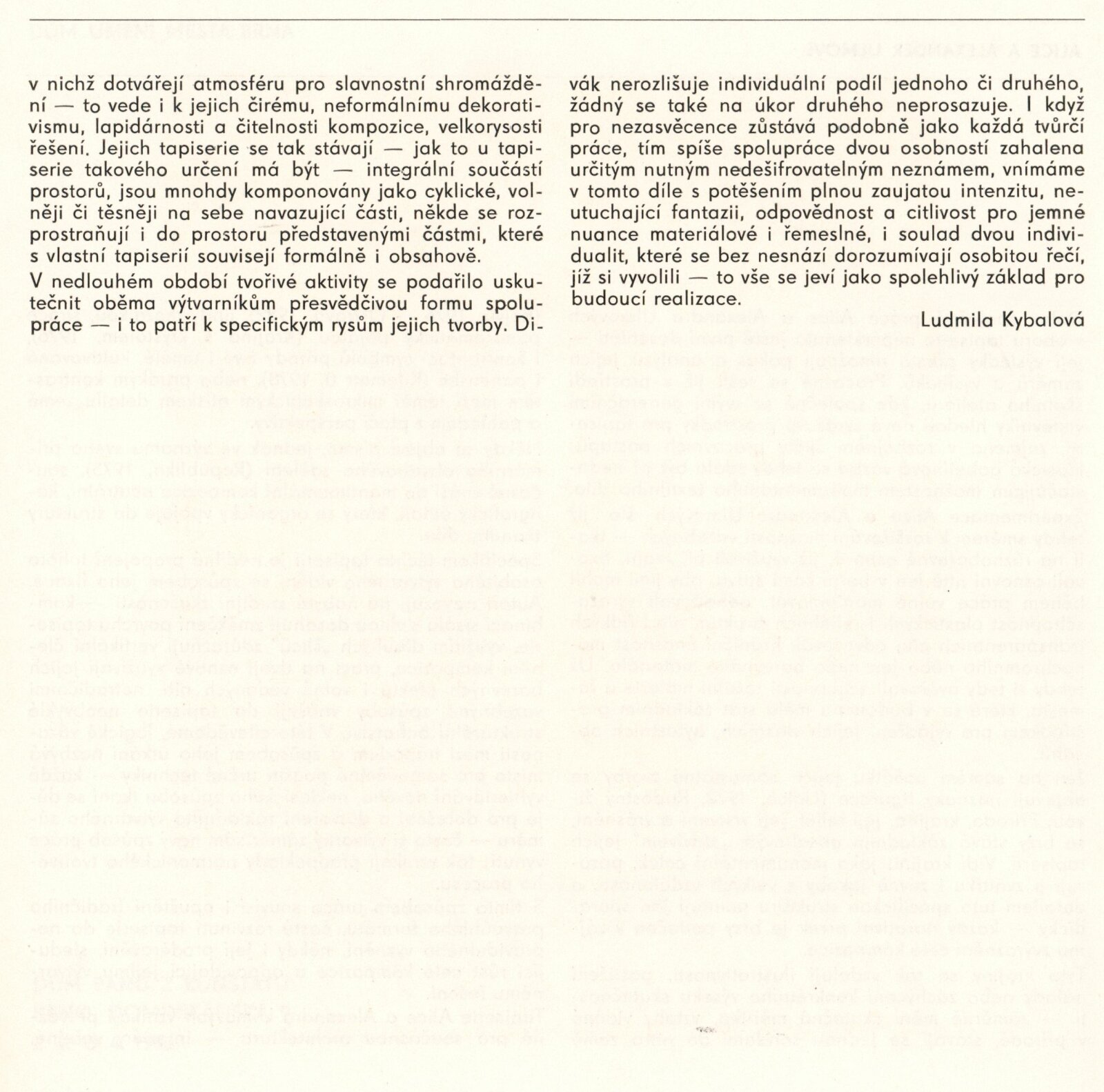 pozvánka, katalog, strojopis, počet vystavených děl, pojistný seznam, provozní korespondence, dopis z Hannoveru – Textilkunst, text Ludmily Kybalové (NJ), žádosti o zapůjčení, potvrzení převzetí vystavených děl, žádost o výstavu manželů Othových a Ulmových, text Evy Dobšíkové o Miladě a Antonínovi Othových, recenze v tisku