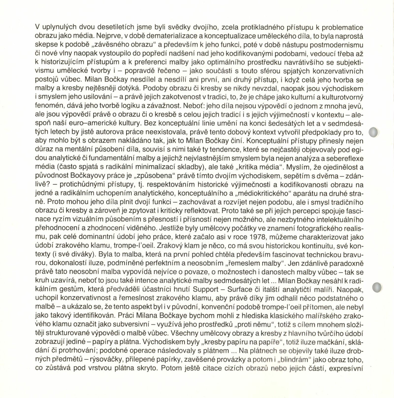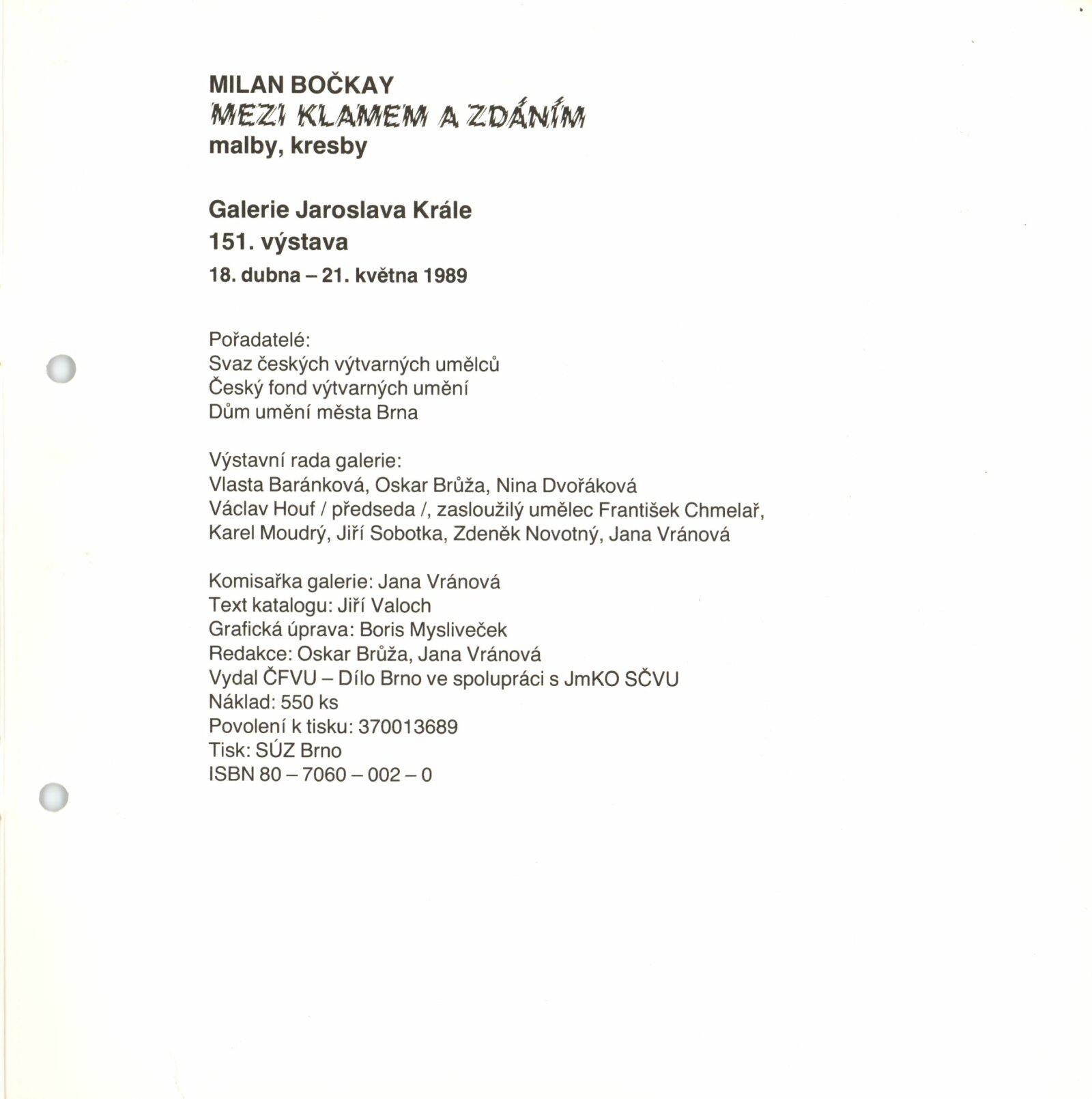 Milan Bočkay. Mezi klamem a zdáním. Malby, kresby: Dům umění, 151. výstava v Galerii Jaroslava Krále, 18. 4. – 21. 5. 1989 / Text: Jiří Valoch. – Brno: ČFVU-Dílo, 1989. – [16] s., obr., životní data, výstavy, DU 868. – MZK; MG; MMB