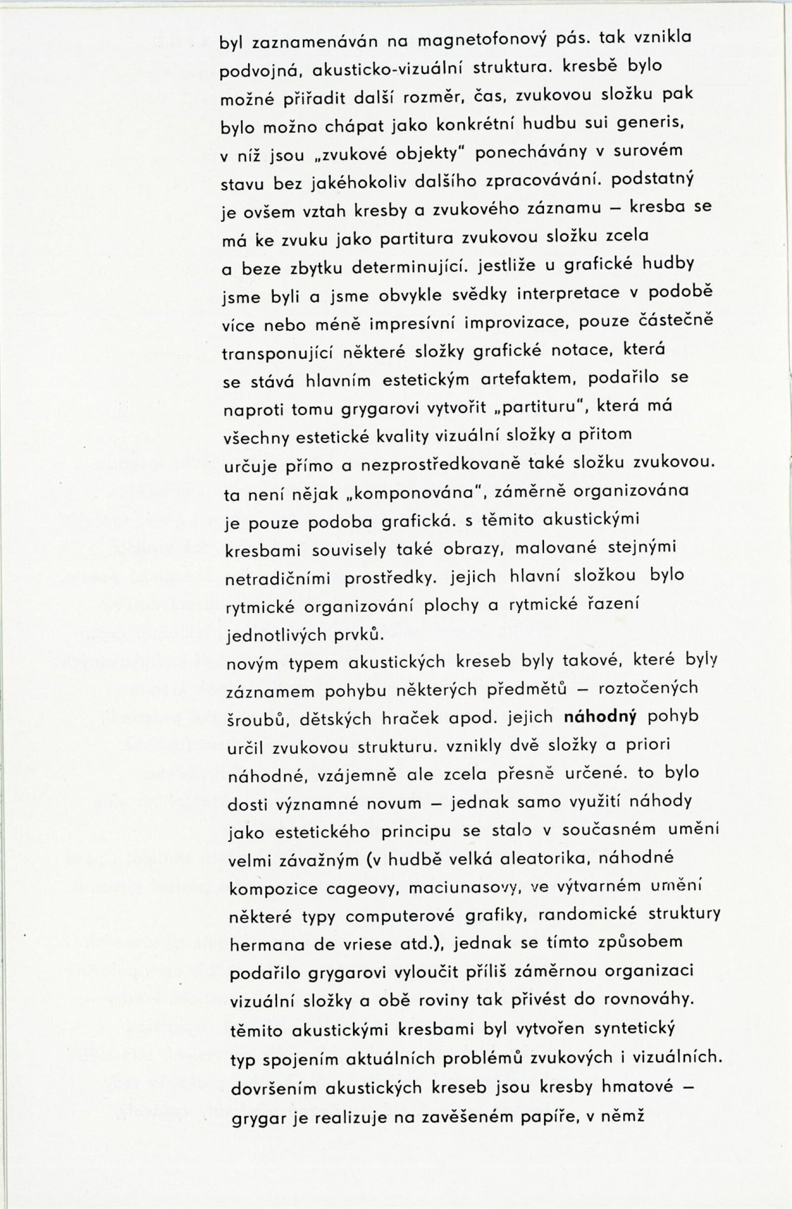 pozvánka, katalog, fotografie z vernisáže, zprávy o výstavě z DU, recenze v tisku, leták k večeru akustických kreseb Milana Grygara v Malém divadle hudby a poezie (26. 1. 1968) – text a báseň Jiřího Valocha, leták k pořadům „Akustické kresby a partitury“ a „Hmatové kresby a hmatové akce“ Milana Grygara v DU (15. 6. a 16. 6. 1973), pozvánka na večer interpretovaných kreseb a partitur Milana Grygara v Malém divadle hudby (16. 11. 1981)