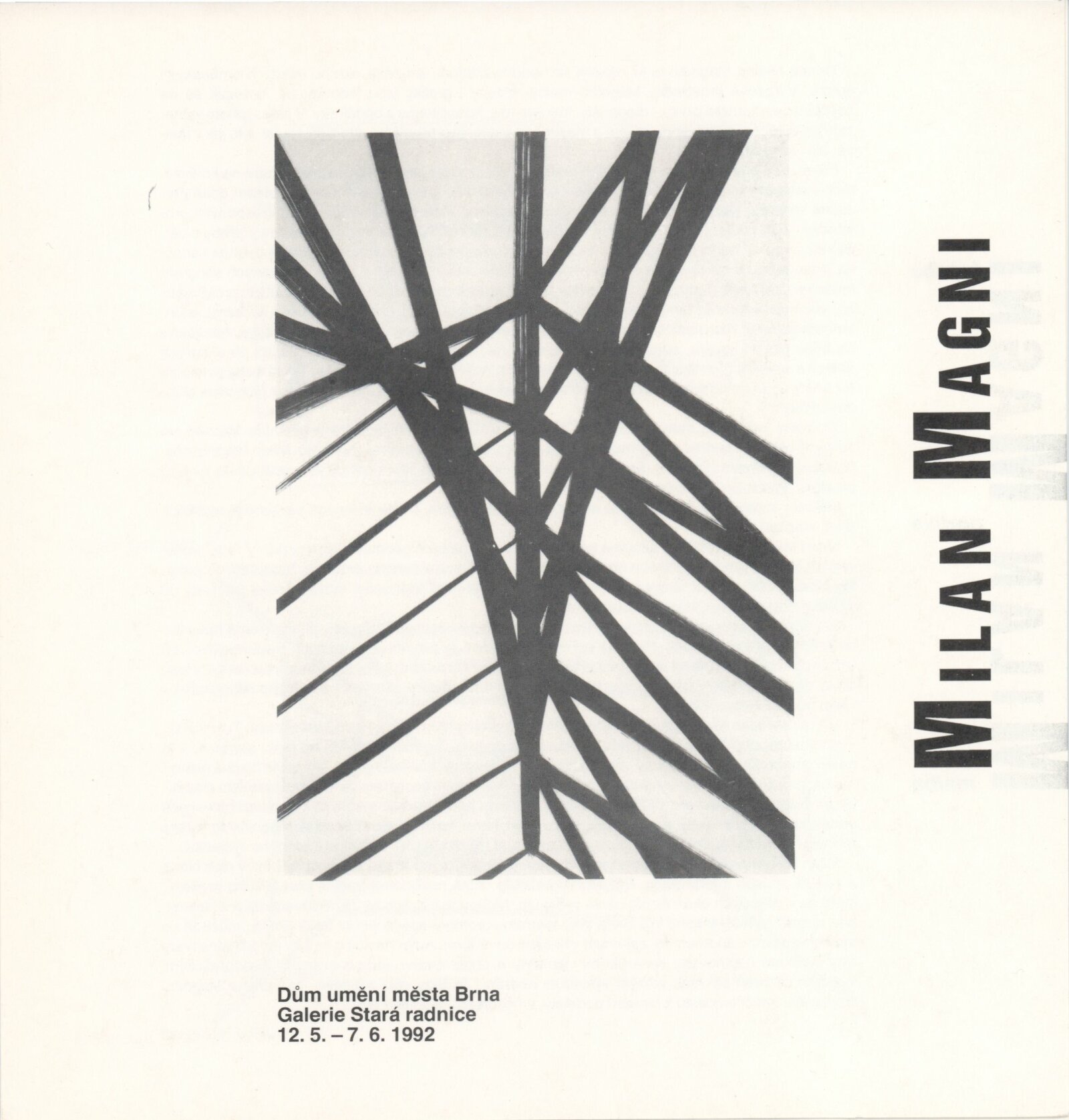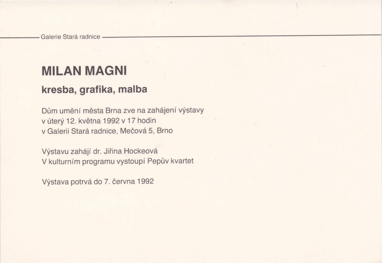 Milan Magni. Kresba, grafika, malba: Galerie Stará radnice 12. 5. – 7. 6. 1992 / Text Jiřina Hockeová. - Brno: DUmB, - 1 list obr. příl. v obalu Životní data, výstavy GSR 124; MG