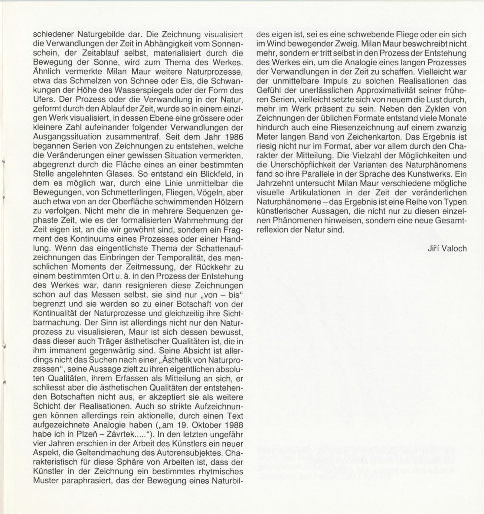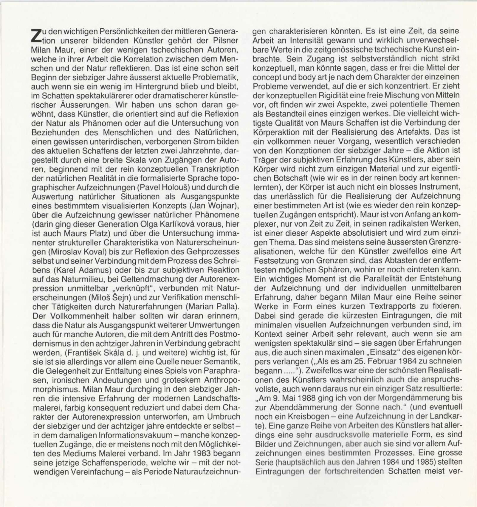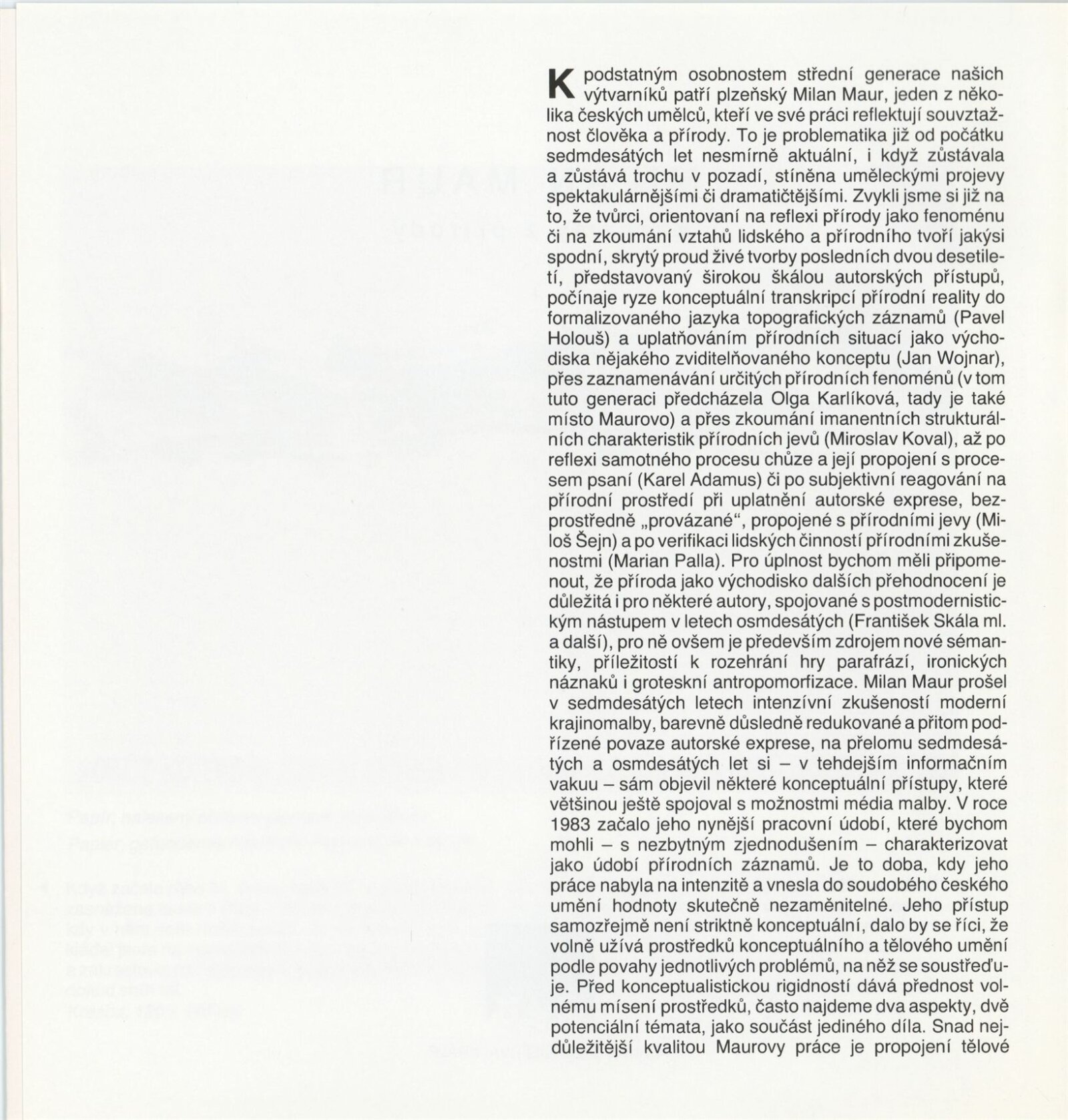 Milan Maur. Záznamy z přírody: Dům umění města Brna, 170. výstava v Galerii Jaroslava Krále, 15. 7. – 30. 8. 1992 / Text: Jiří Valoch. – Brno: Unie výtvarných umělců, 1992. – [16] s., obr., vlastní životopis, DU 927. – MG