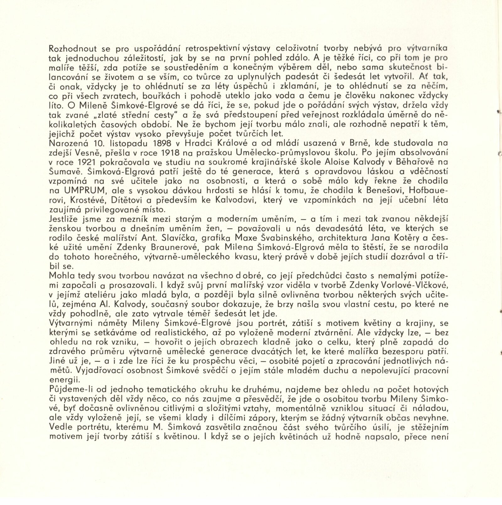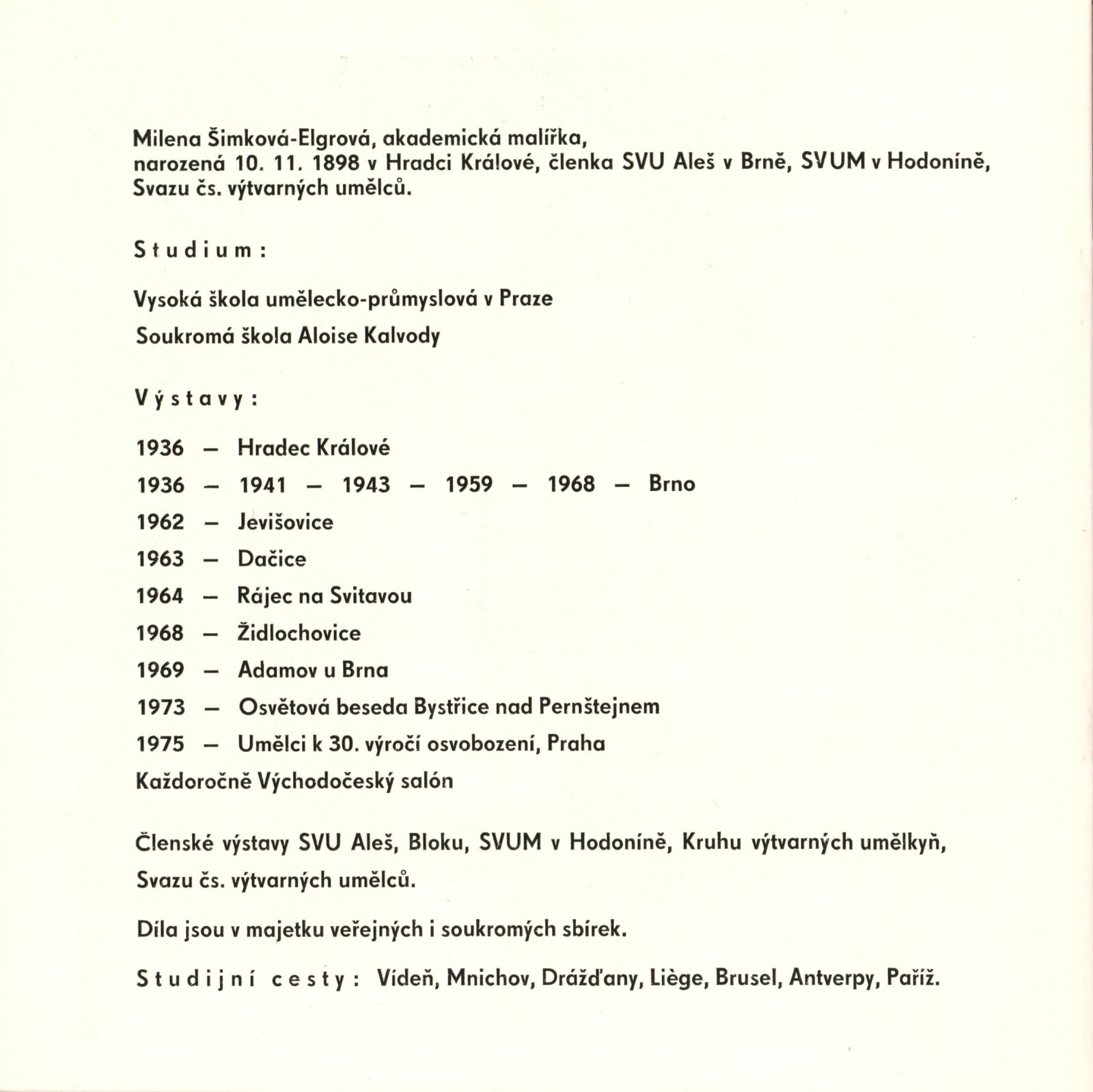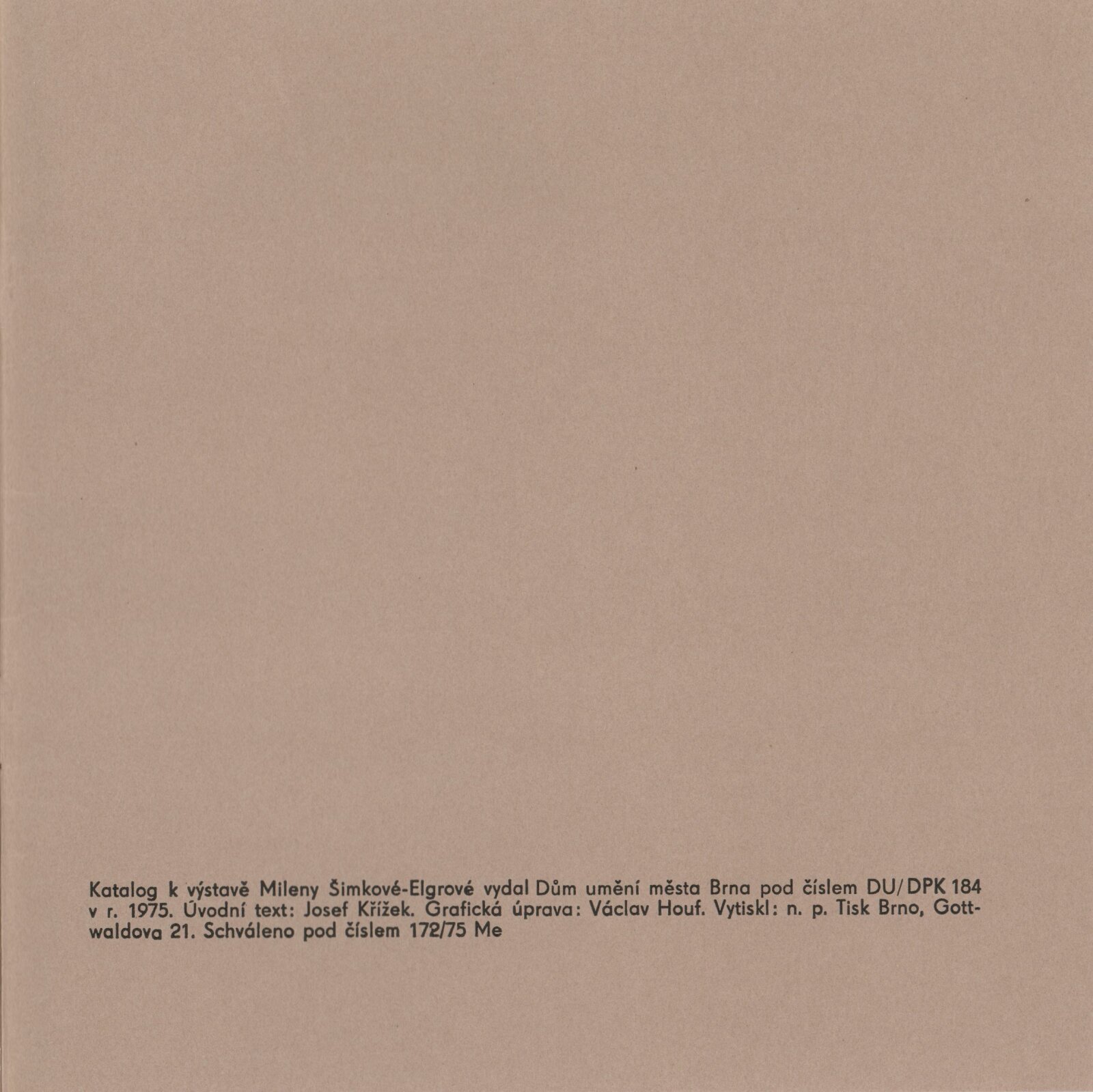 Milena Šimková-Elgrová: Dům umění / Dům pánů z Kunštátu, 7. 12. 1975 – 4. 1. 1976 / Text: Josef Křížek. – Brno: DUmB, 1975. – 16 s., obr., životní data DPK 615; MZK; MMB
