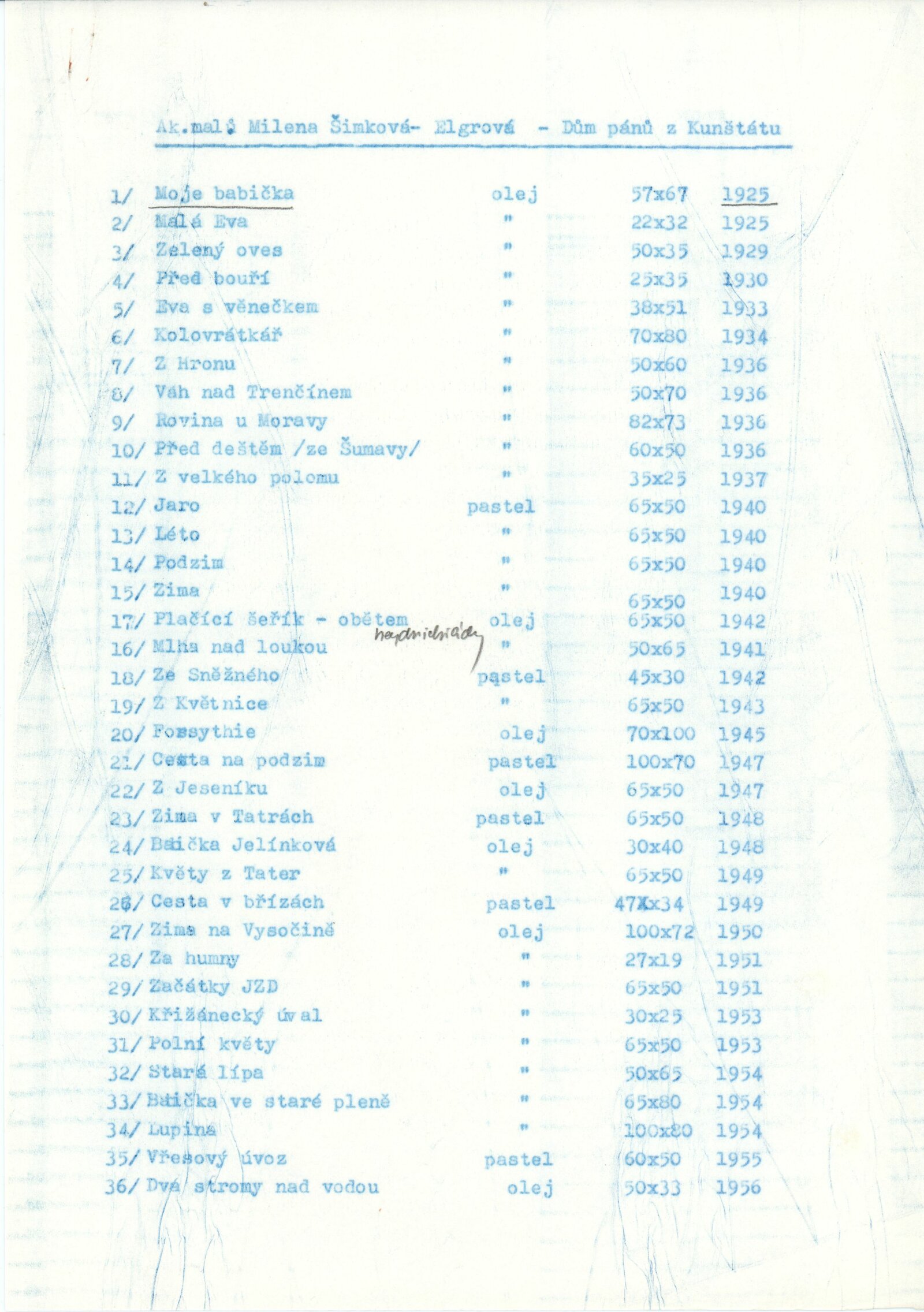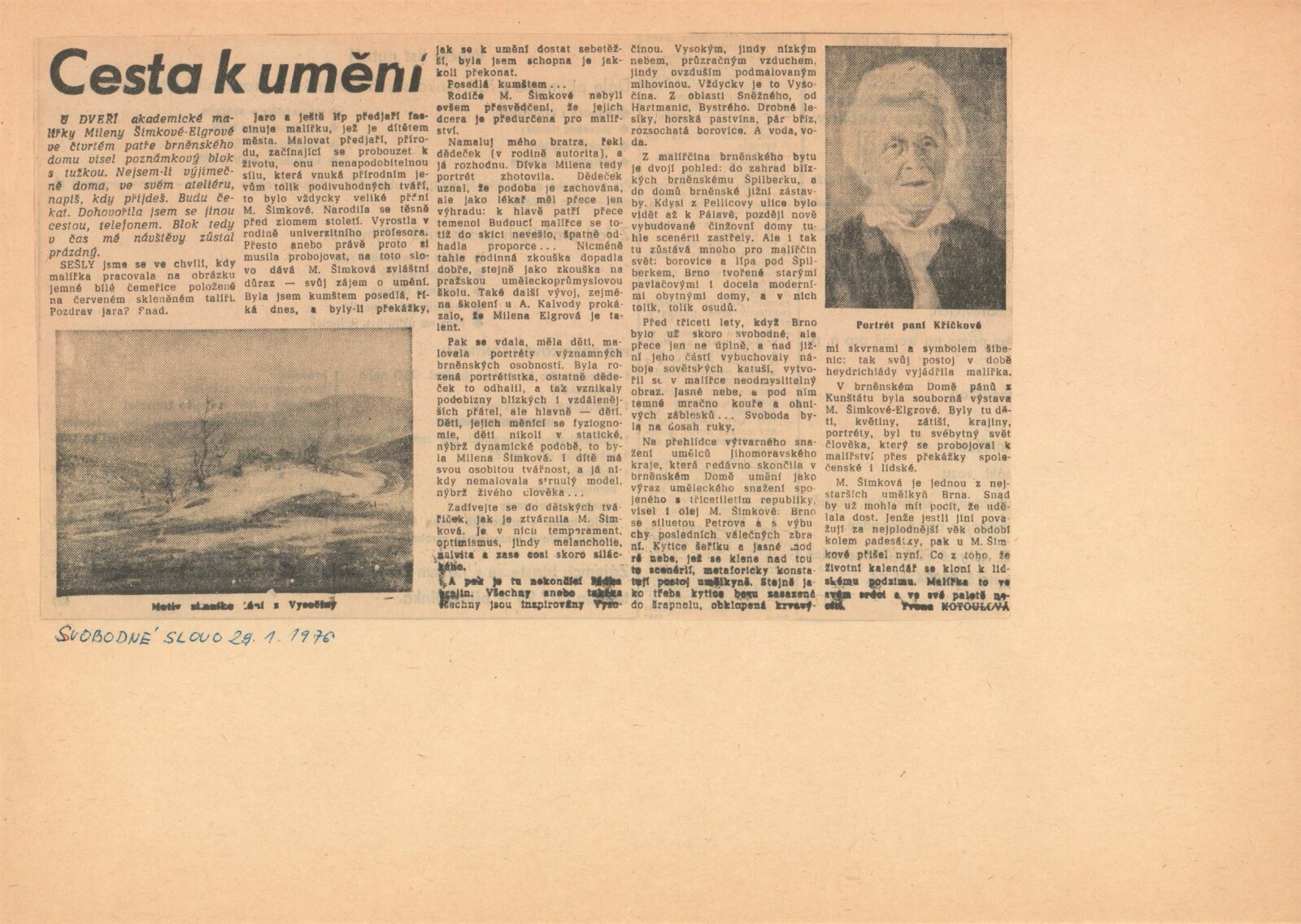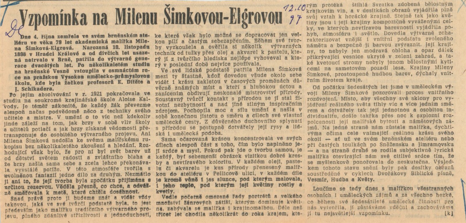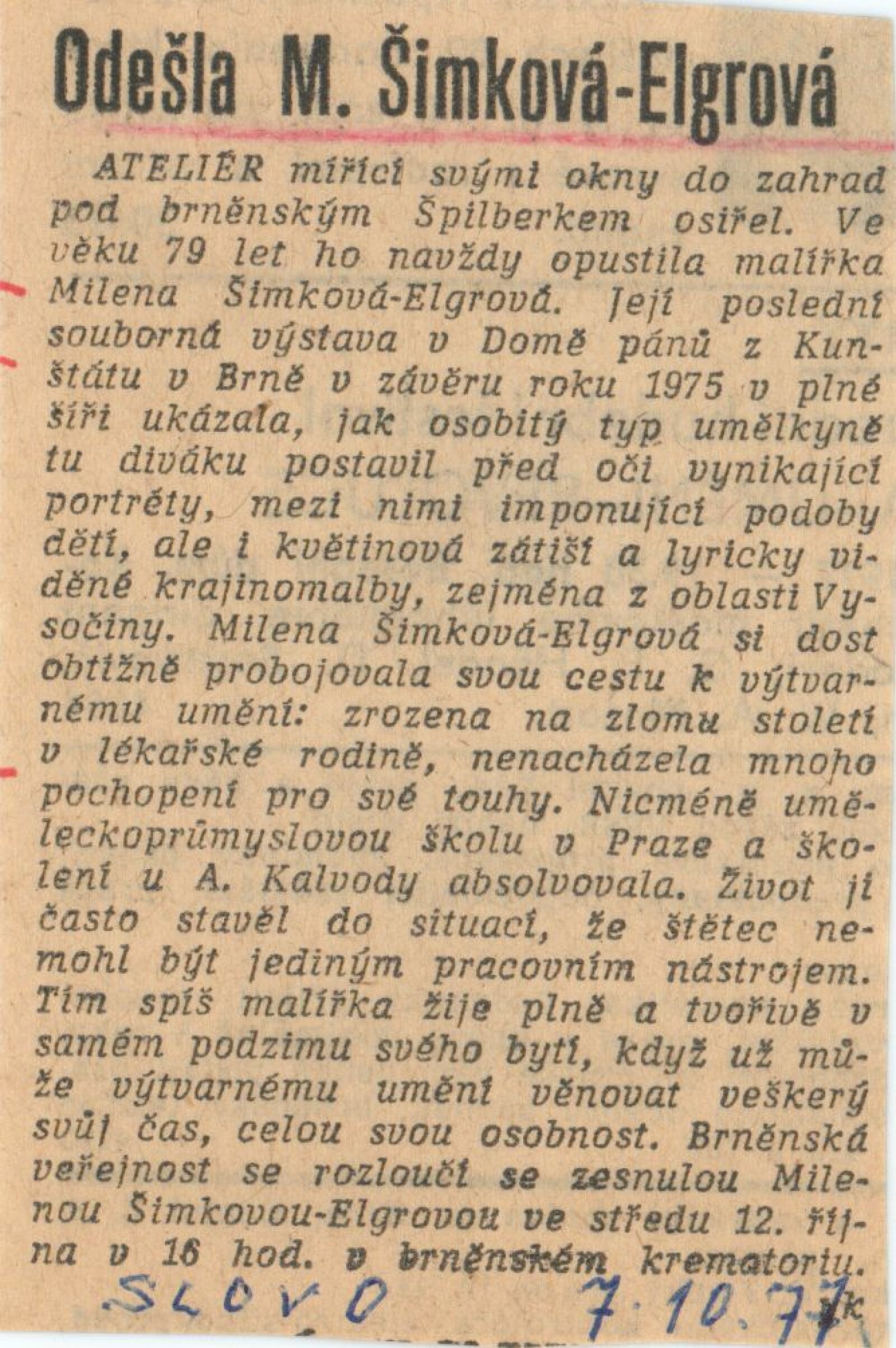 Milena Šimková-Elgrová: Dům umění / Dům pánů z Kunštátu, 7. 12. 1975 – 4. 1. 1976 / Text: Josef Křížek. – Brno: DUmB, 1975. – 16 s., obr., životní data DPK 615; MZK; MMB
