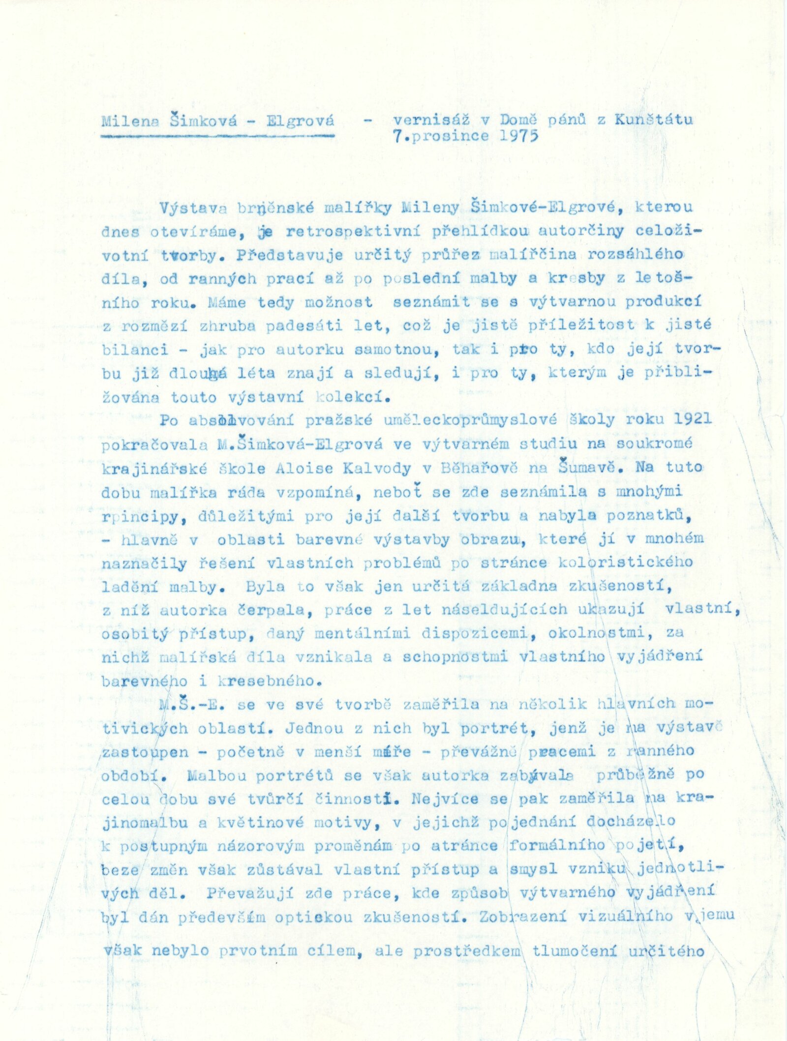 pozvánka, katalog, strojopis textu, text o výstavě od Jany Vránové, fotografie výstavy, text katalogu, seznam vystavených děl, zpráva o vernisáži, hospodářská smlouva s autorkou, korespondence (vyjádření výboru KO SČVU k plánu výstav a dopis autorce o tomto vyjádření), žádost o povolení výstavy, recenze v tisku, pozvánka na výstavu Mileny Šimkové-Elgrové v Malé galerii knihkupectví Čs. spisovatel v Brně (1975)