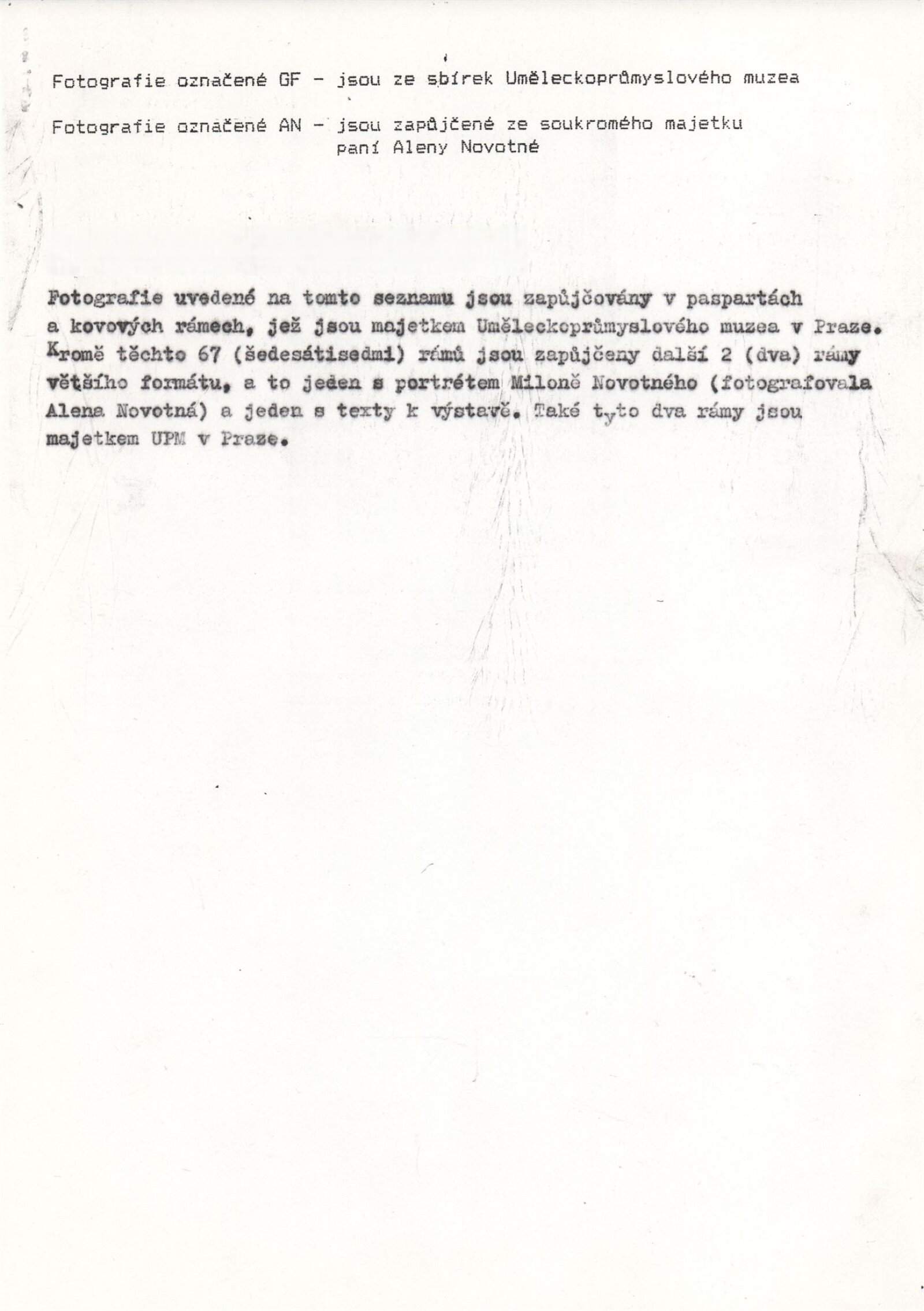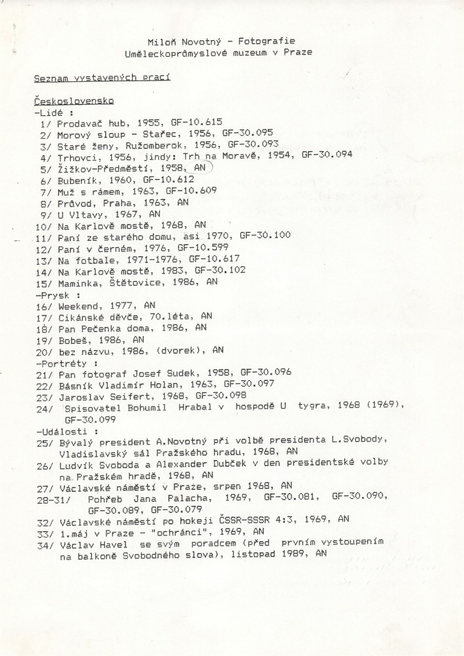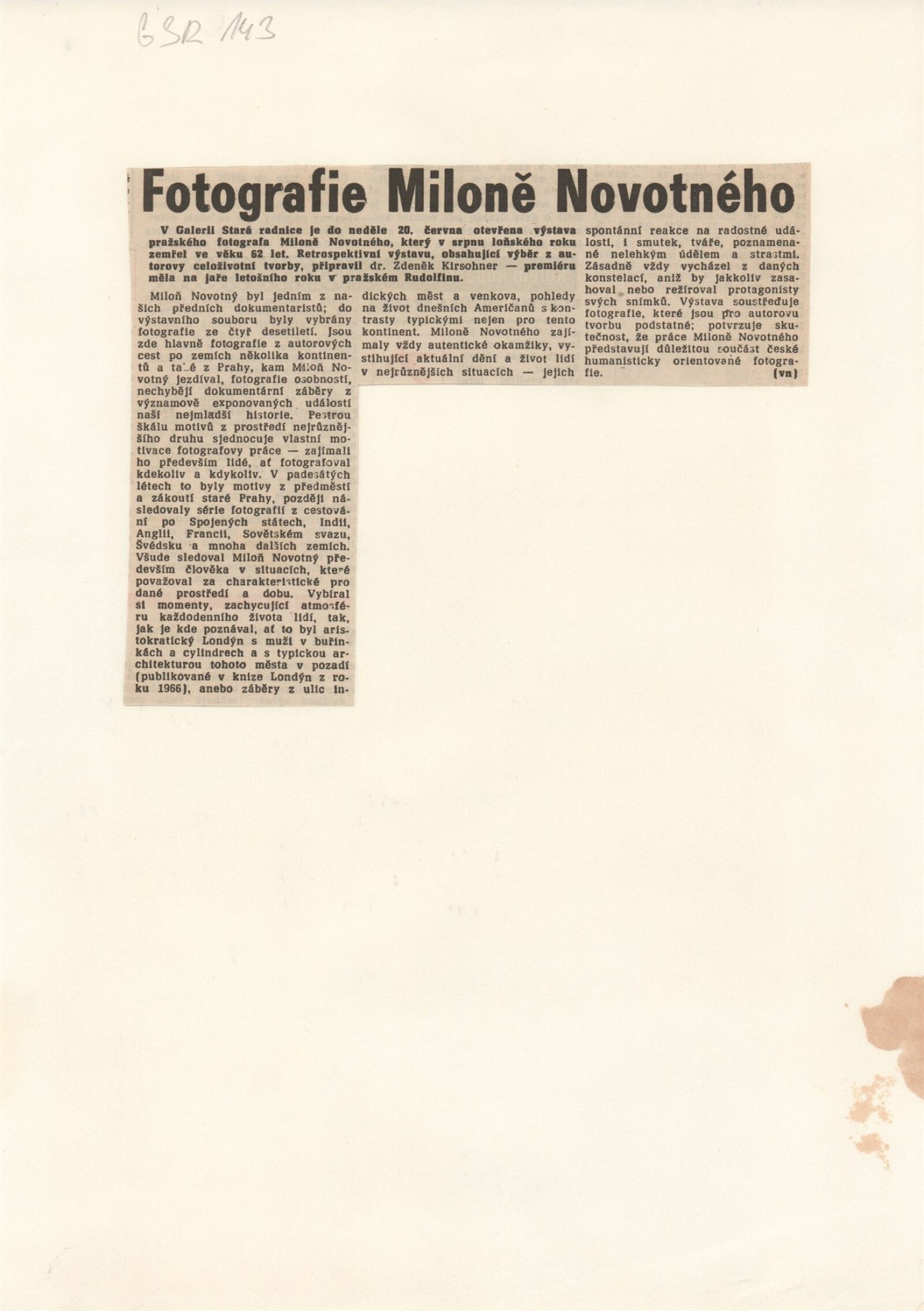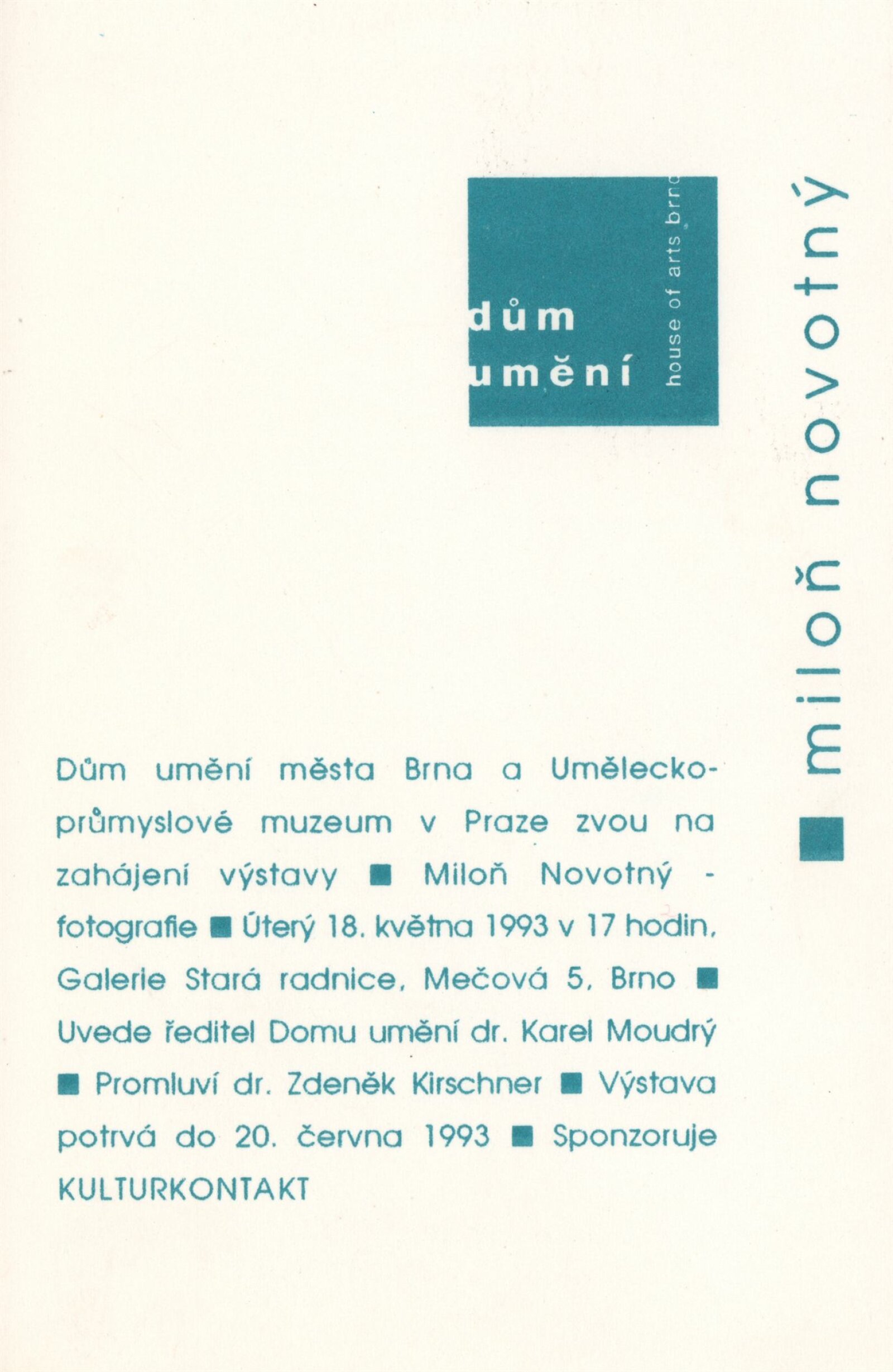 Miloň Novotný. Fotografie: Galerie Stará radnice 18. 5. – 20. 6. 1993 Převzatý katalog Miloň Novotný. Fotografie: Uměleckoprůmyslové muzeum v Praze ve výstavních sálech Rudolfina 18. 2. – 11. 4. 1993 / Text Zdeněk Kirschner. - Praha: Uměleckoprůmyslové muzeum, - [24] s., obr. Portrét, vlastní životopis GSR 143; MG