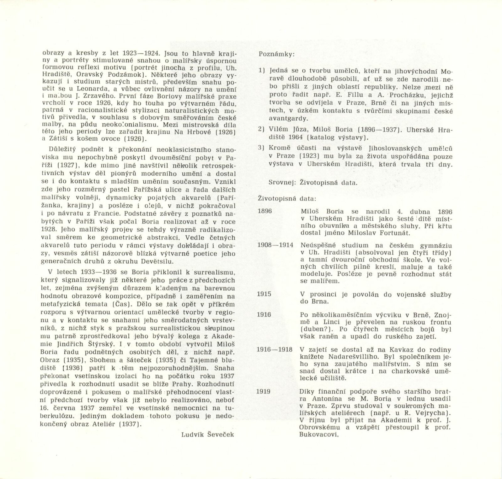 Miloš Boria 1896–1937: Dům pánů z Kunštátu v Brně [spr. Galerie Stará radnice], 19. 5. – 2. 8. 1987 / Text: Ludvik Ševeček. – Gottwaldov: Oblastní galerie výtvarného umění, 1987. – [8] s., obr., životní data, GSR 4. – MZK; MG; MMB