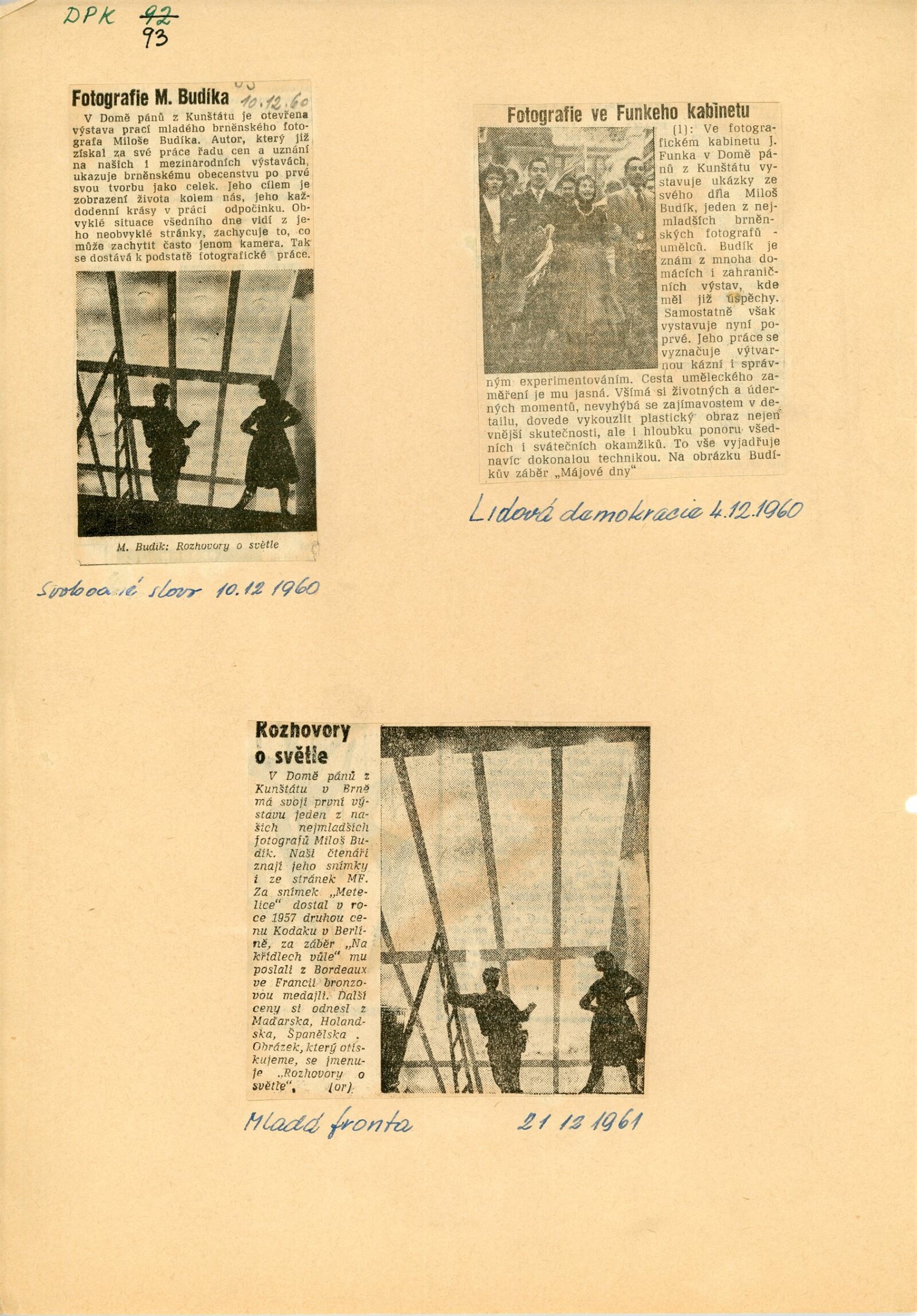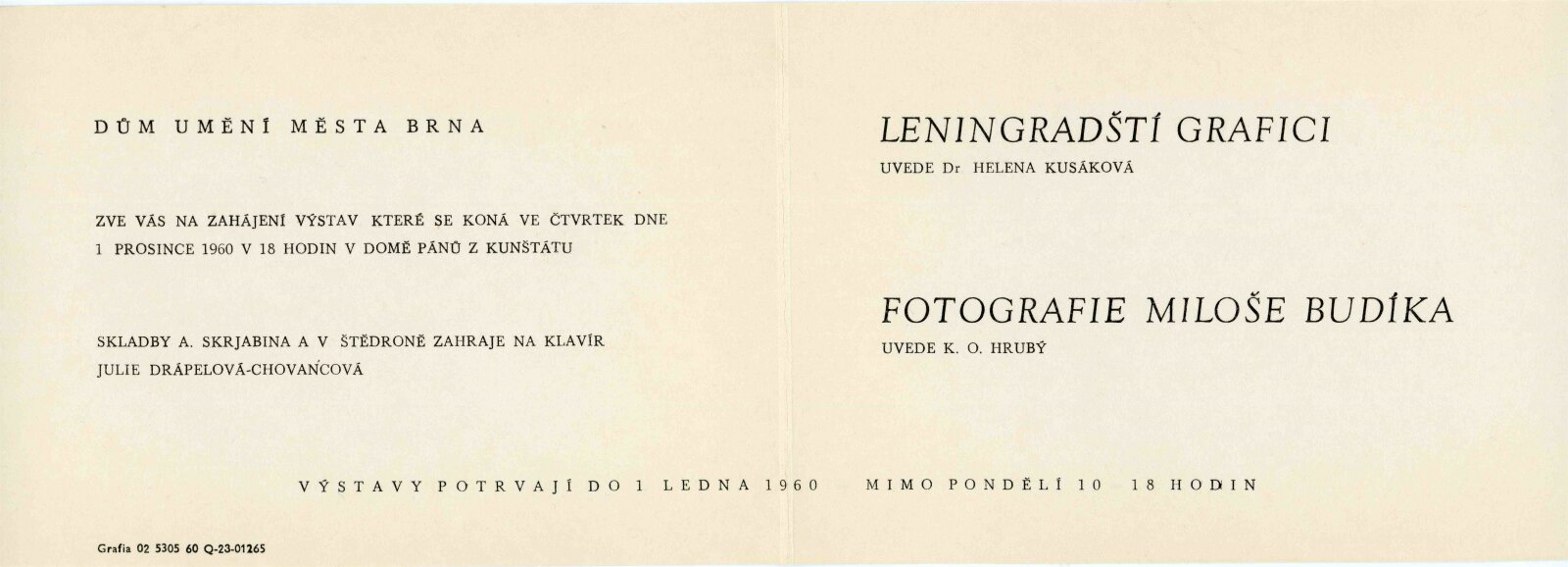 Miloš Budík: Dům umění města Brna / Dům pánů z Kunštátu, 18. výstava Kabinetu fotografie Jaromíra Funka, 1. 12. 1960 – 1. 1. 1961 / Text: Karel O. Hrubý. – Brno: DUmB, 1960. – skládačka, 6 s., obr., DPK 93. – MG