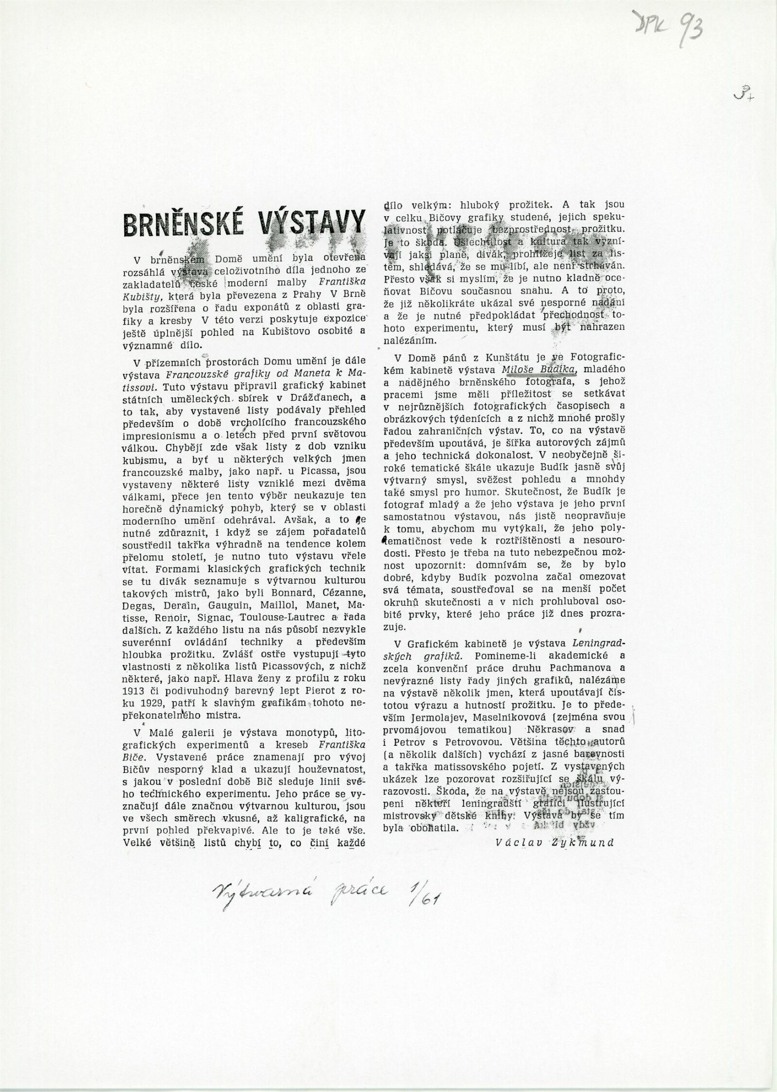 pozvánka, text (Karel Otto Hrubý), korespondence (Miloš Budík s DU), recenze v tisku