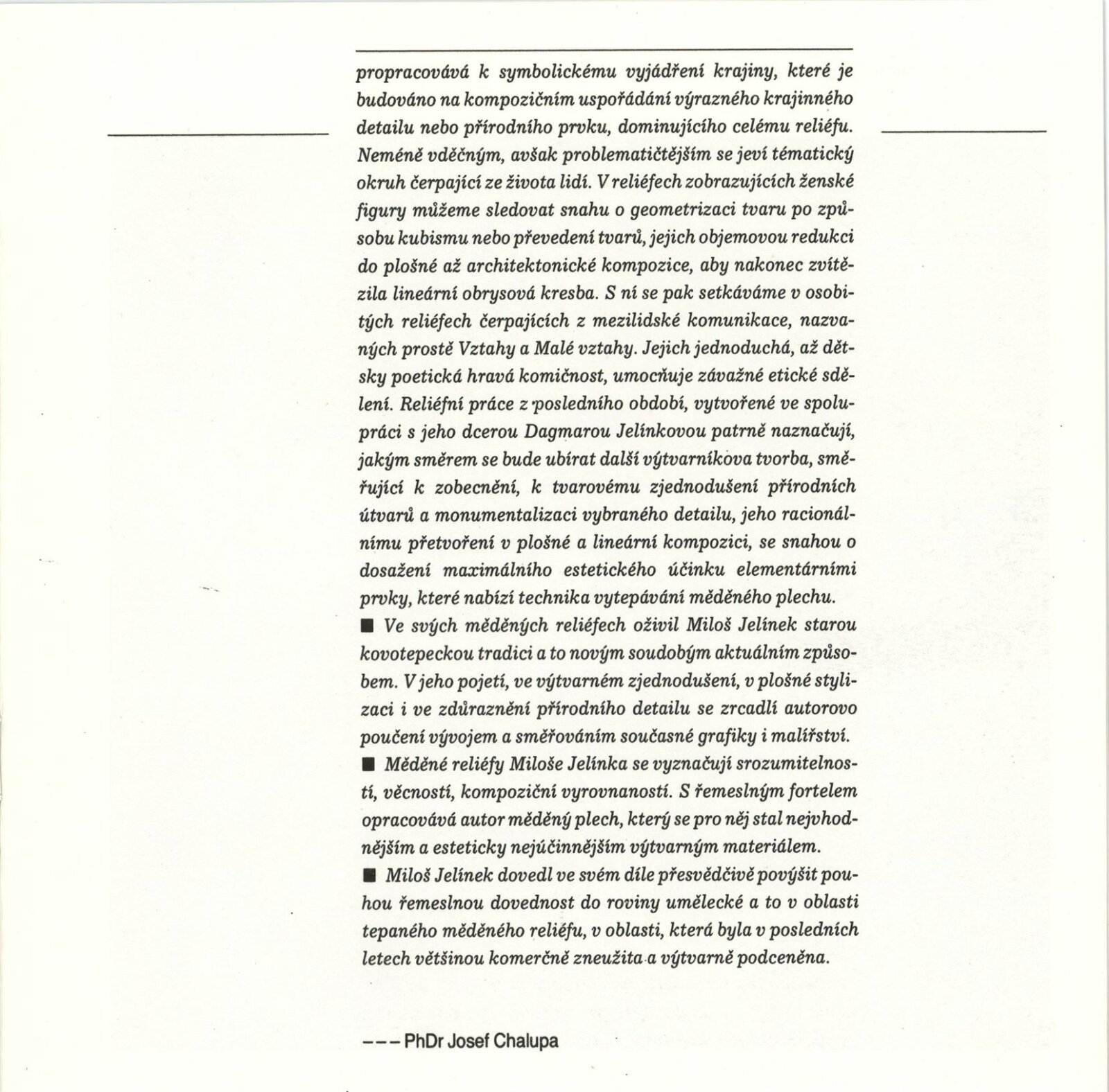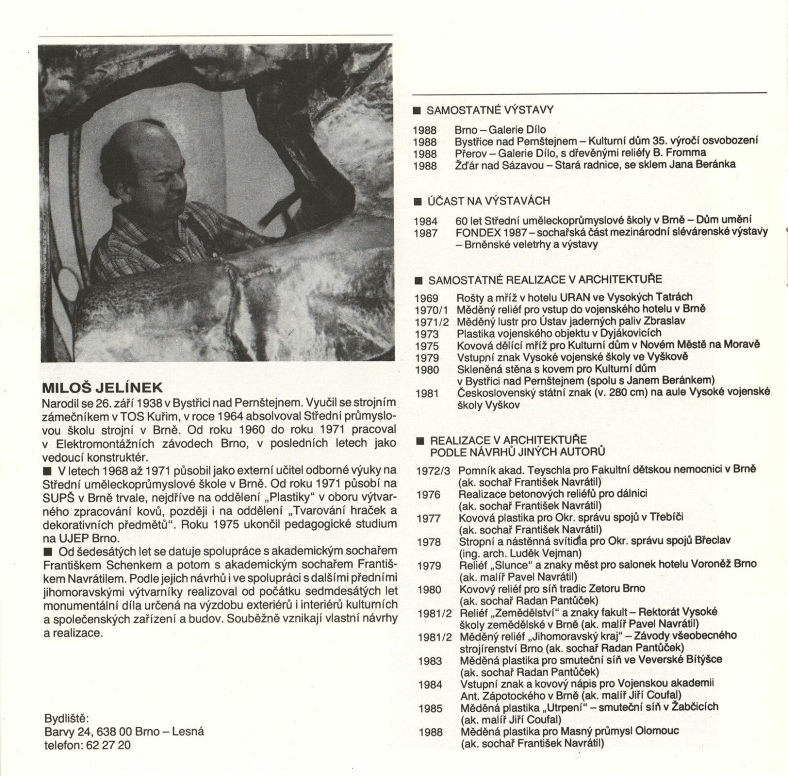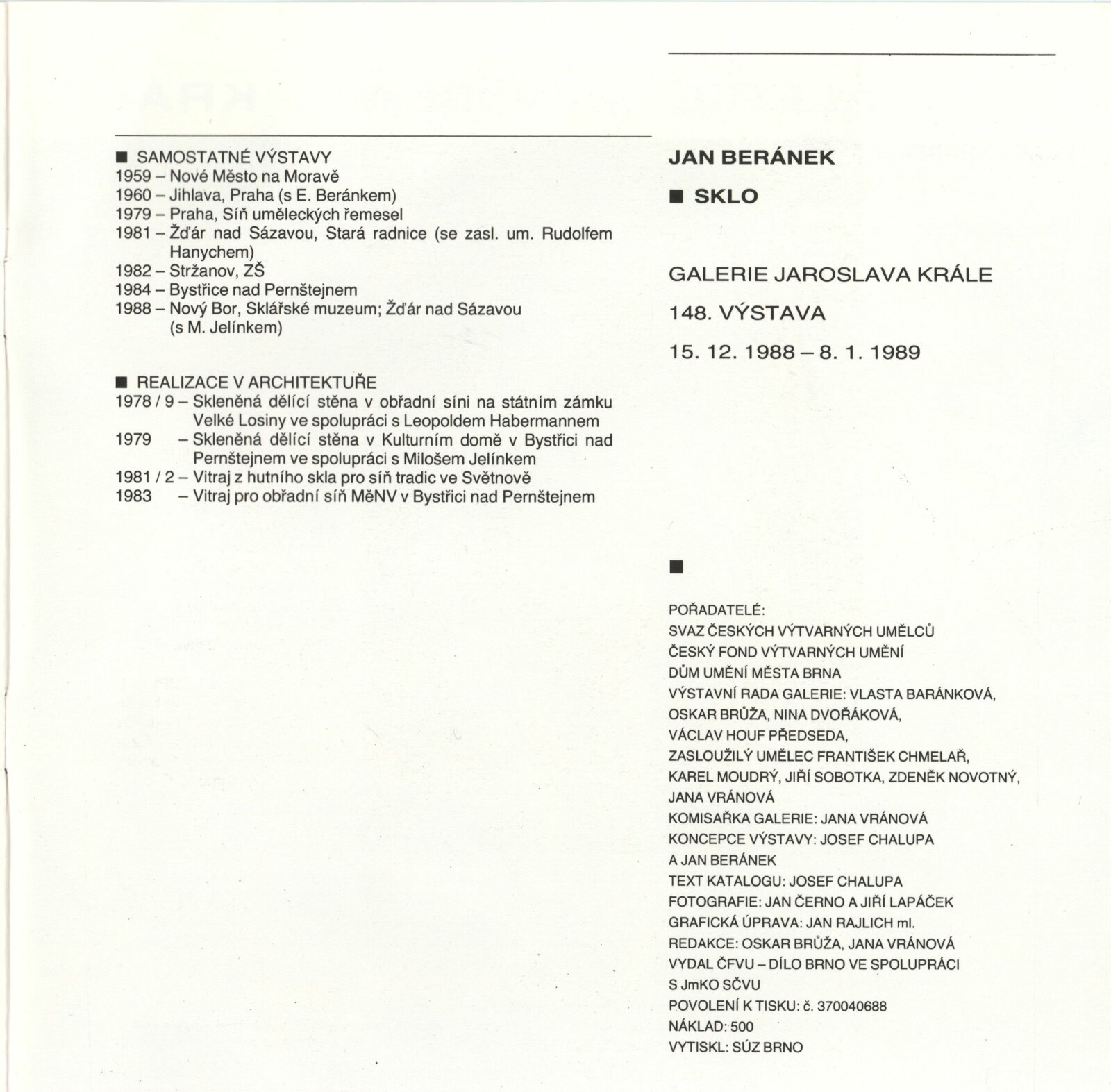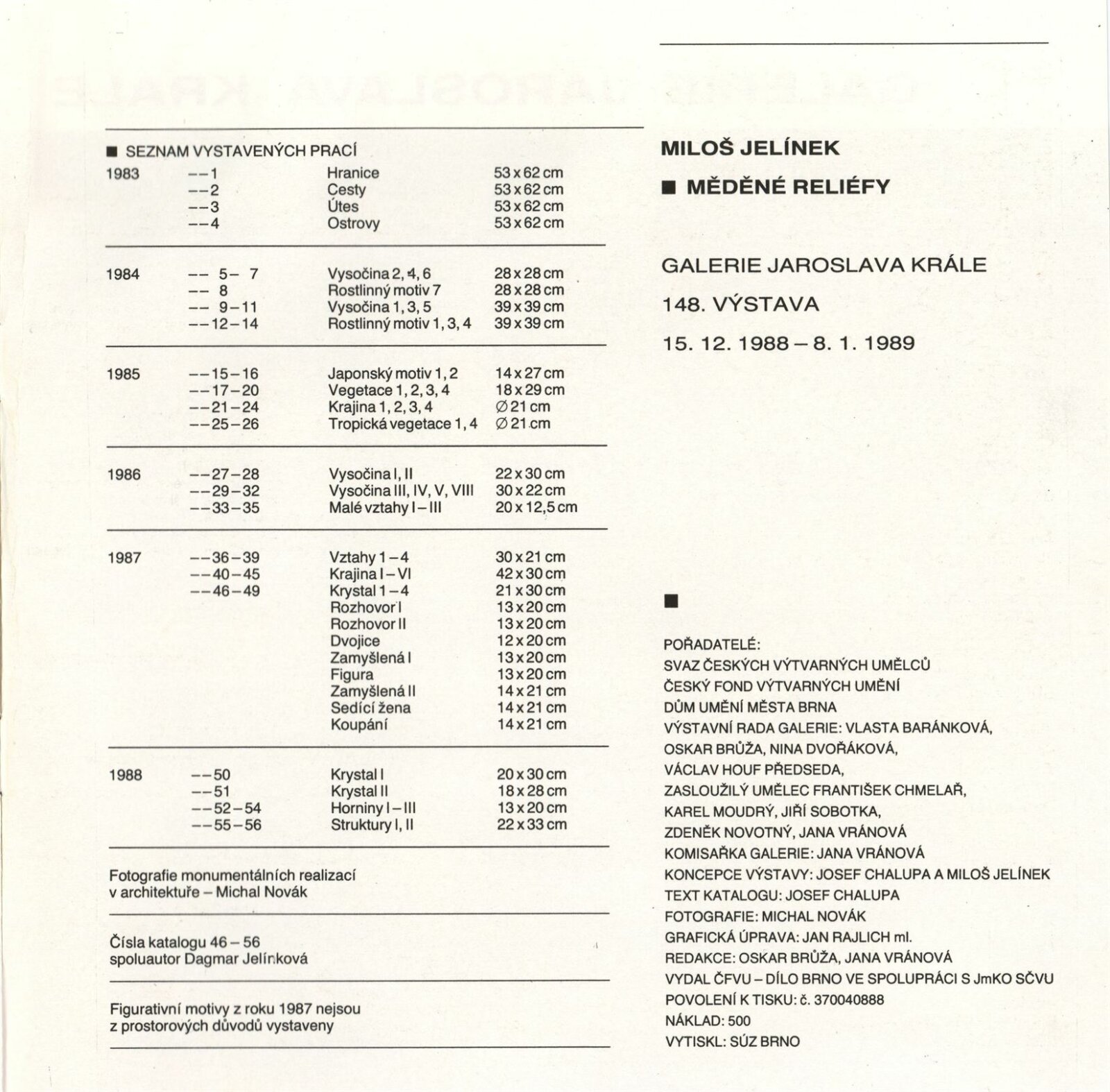 Jan Beránek. Sklo: Dům umění, 148. výstava v Galerii Jaroslava Krále, 15. 12. 1988 – 8. 1. 1889 / Text: Josef Chalupa. – Brno: ČFVU-Dílo, 1988. – [12] s., obr., portrét, životopis, seznam výstav a realizací v architektuře, DU 859. – MZK; MG; MMB / Miloš Jelínek. Měděné reliéfy: Dům umění, 148. výstava v Galerii Jaroslava Krále, 15. 12. 1988 – 8. 1. 1989 / Text: Josef Chalupa. – Brno: ČFVU-Dílo, 1988. – [12] s., obr., portrét, životopis, realizace v architektuře, výstavy, DU 859. – MZK; MG
