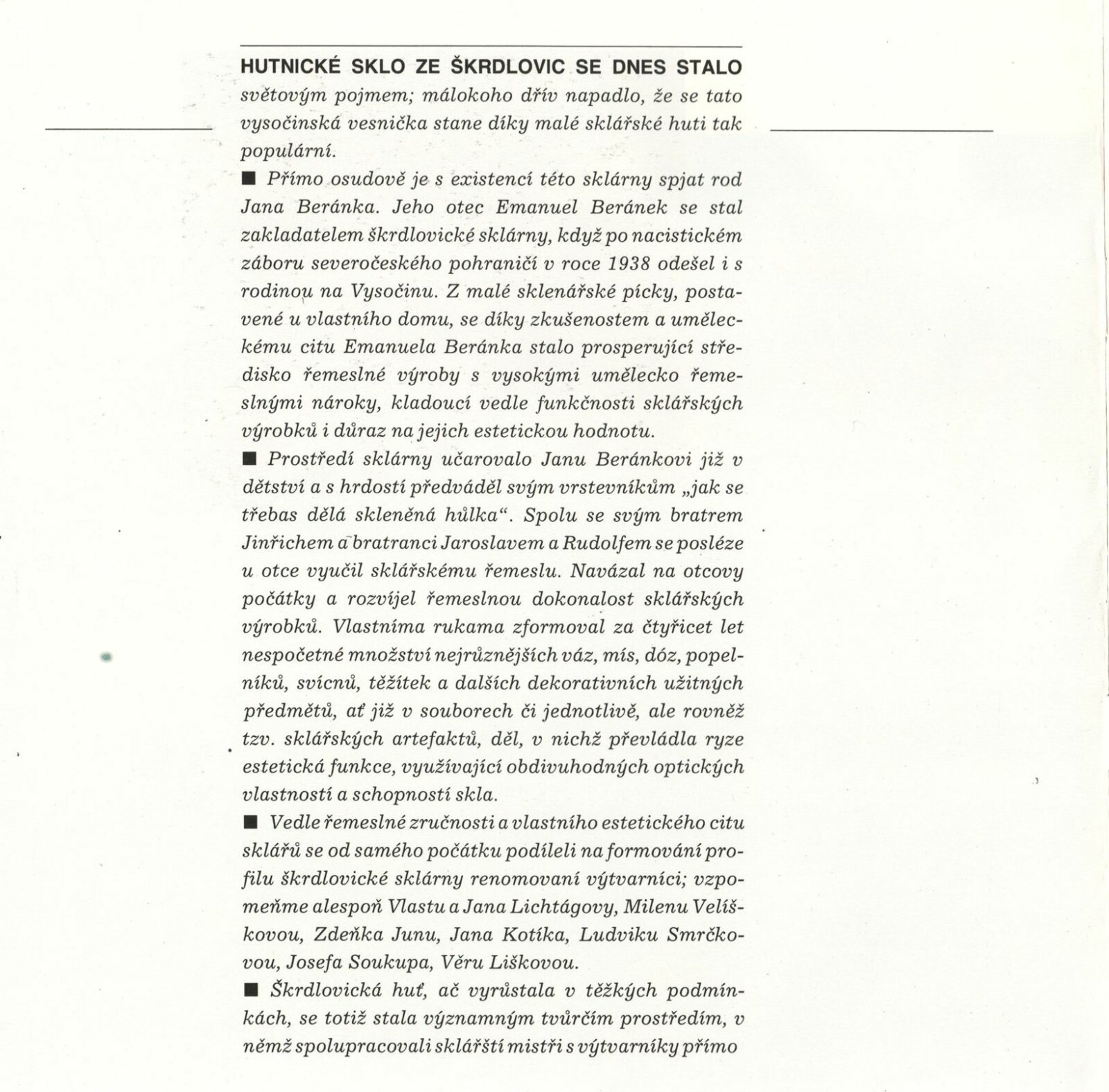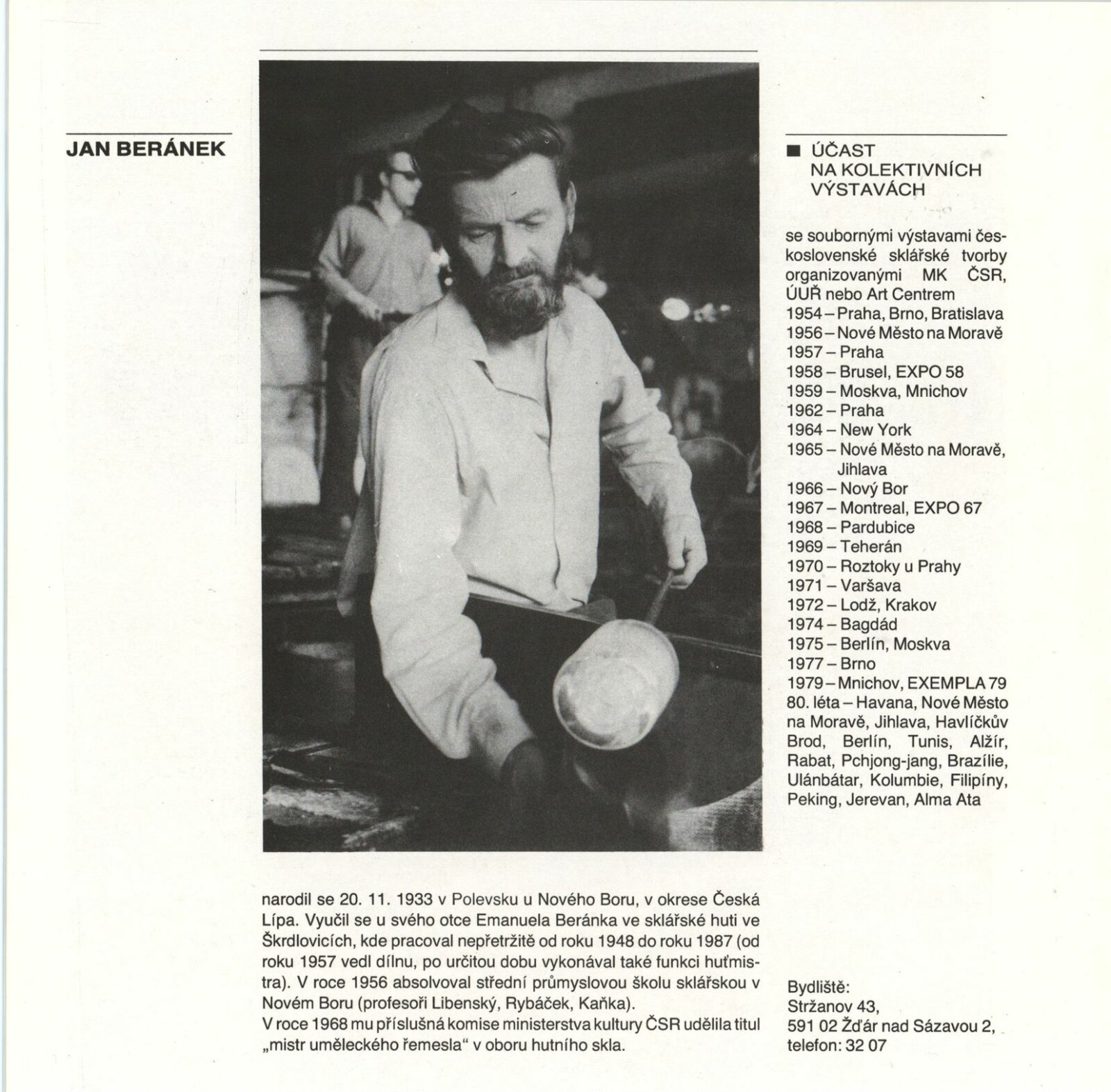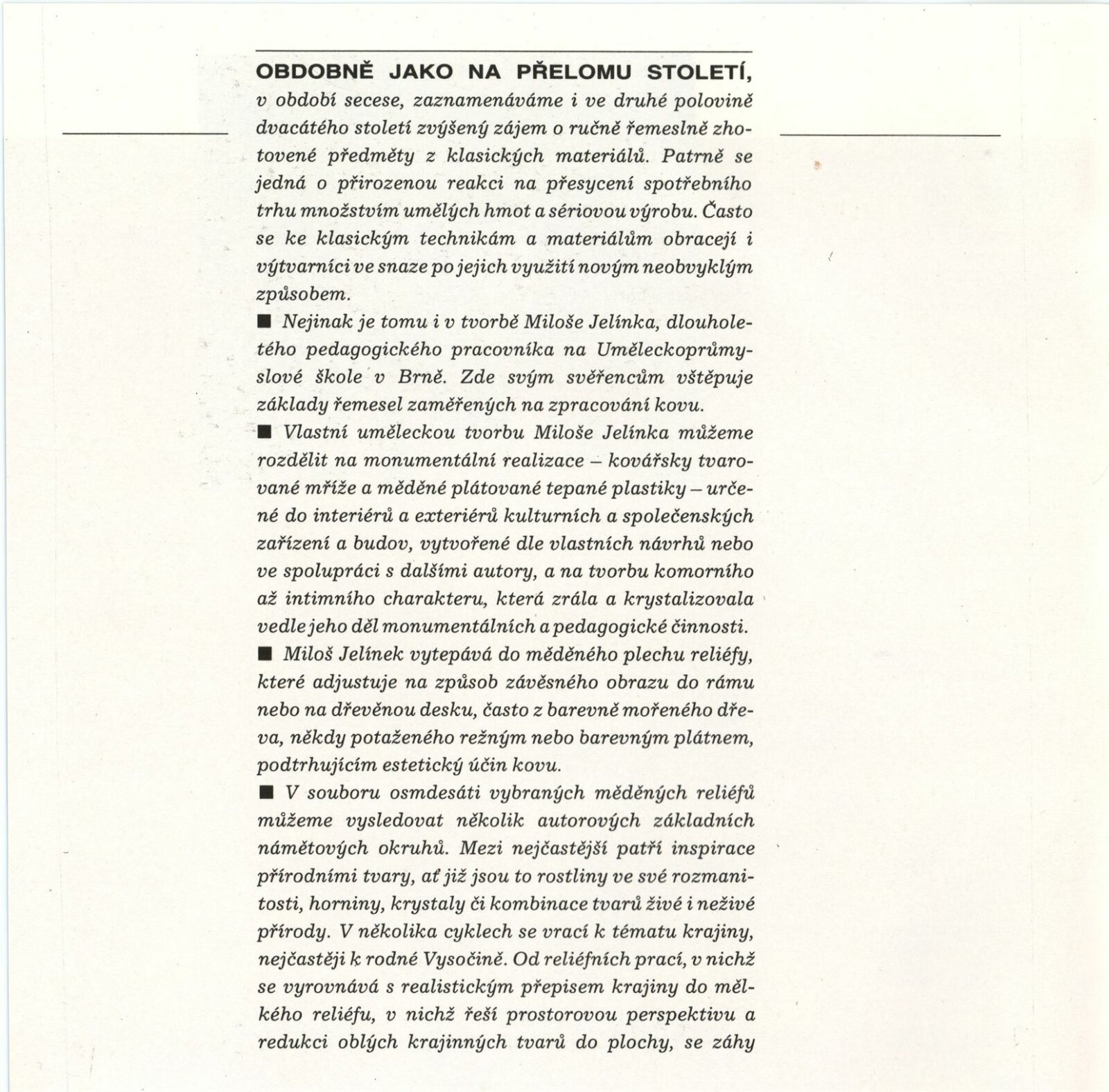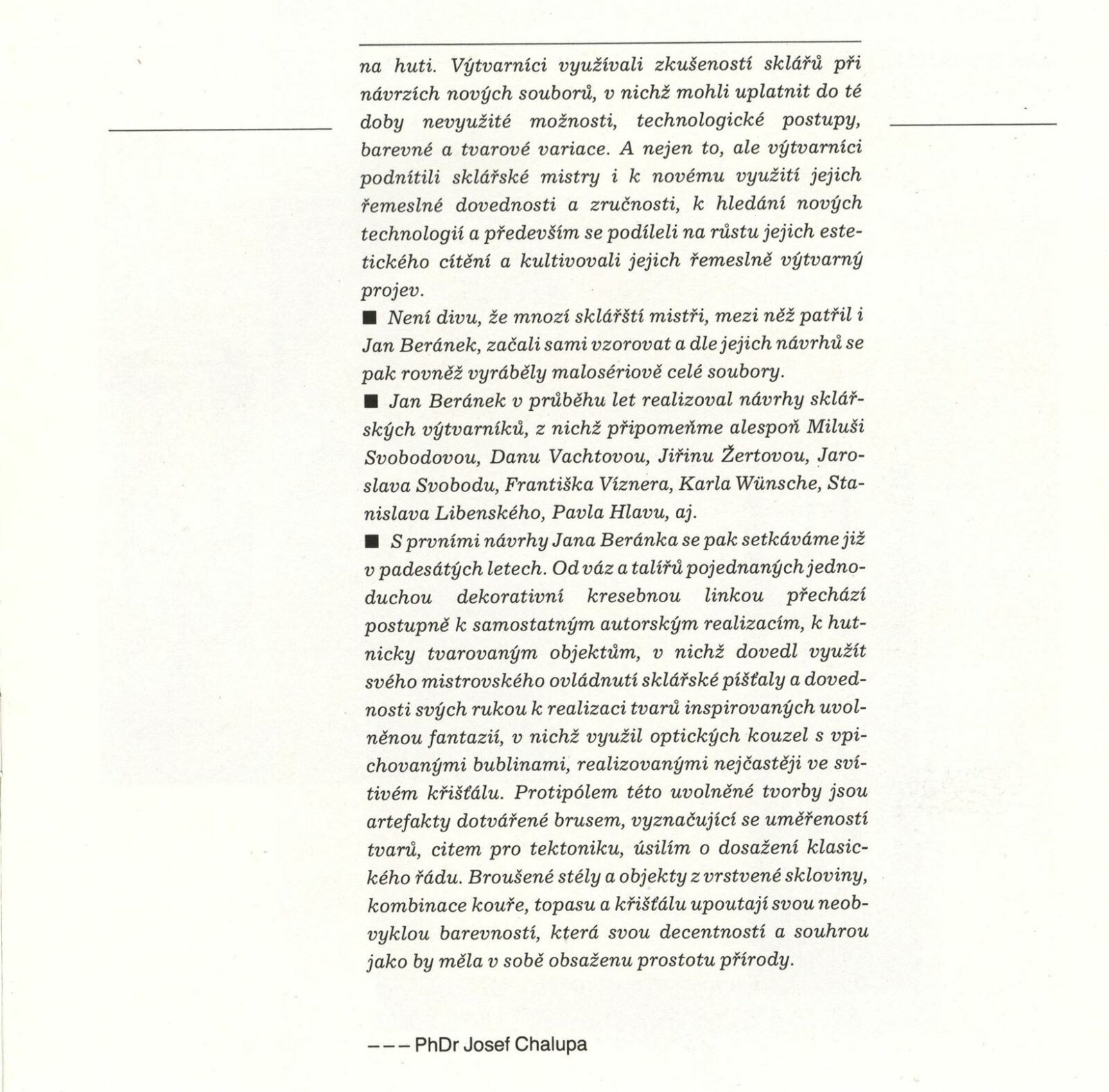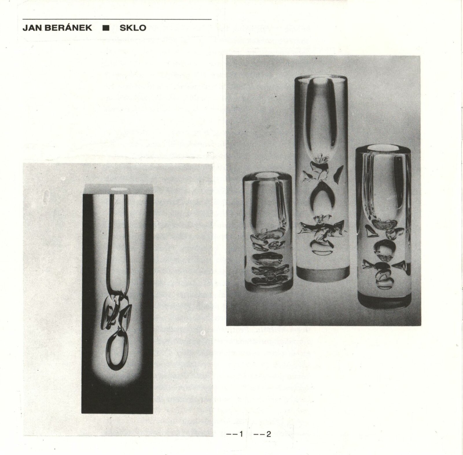 Jan Beránek. Sklo: Dům umění, 148. výstava v Galerii Jaroslava Krále, 15. 12. 1988 – 8. 1. 1889 / Text: Josef Chalupa. – Brno: ČFVU-Dílo, 1988. – [12] s., obr., portrét, životopis, seznam výstav a realizací v architektuře, DU 859. – MZK; MG; MMB / Miloš Jelínek. Měděné reliéfy: Dům umění, 148. výstava v Galerii Jaroslava Krále, 15. 12. 1988 – 8. 1. 1989 / Text: Josef Chalupa. – Brno: ČFVU-Dílo, 1988. – [12] s., obr., portrét, životopis, realizace v architektuře, výstavy, DU 859. – MZK; MG