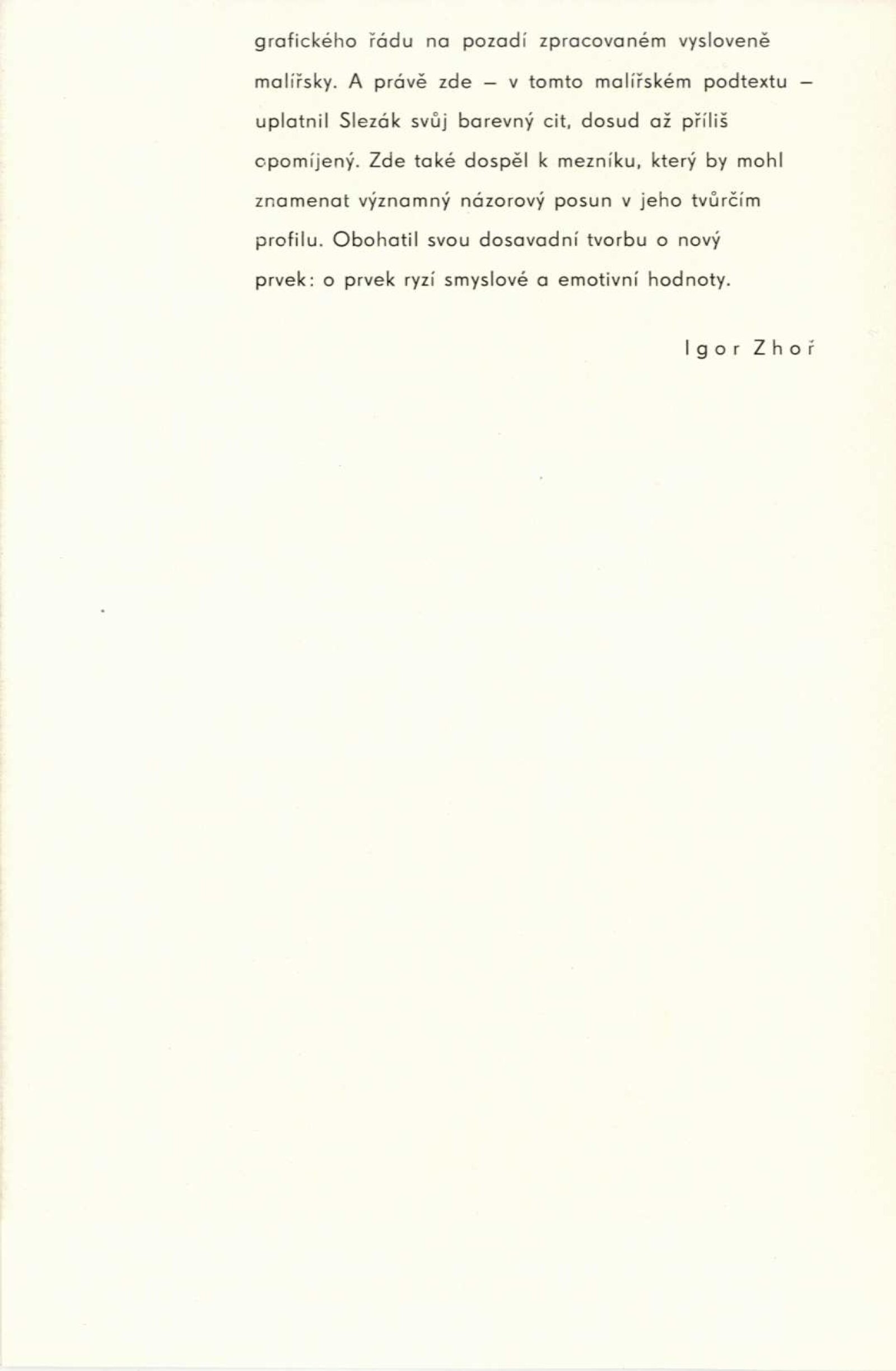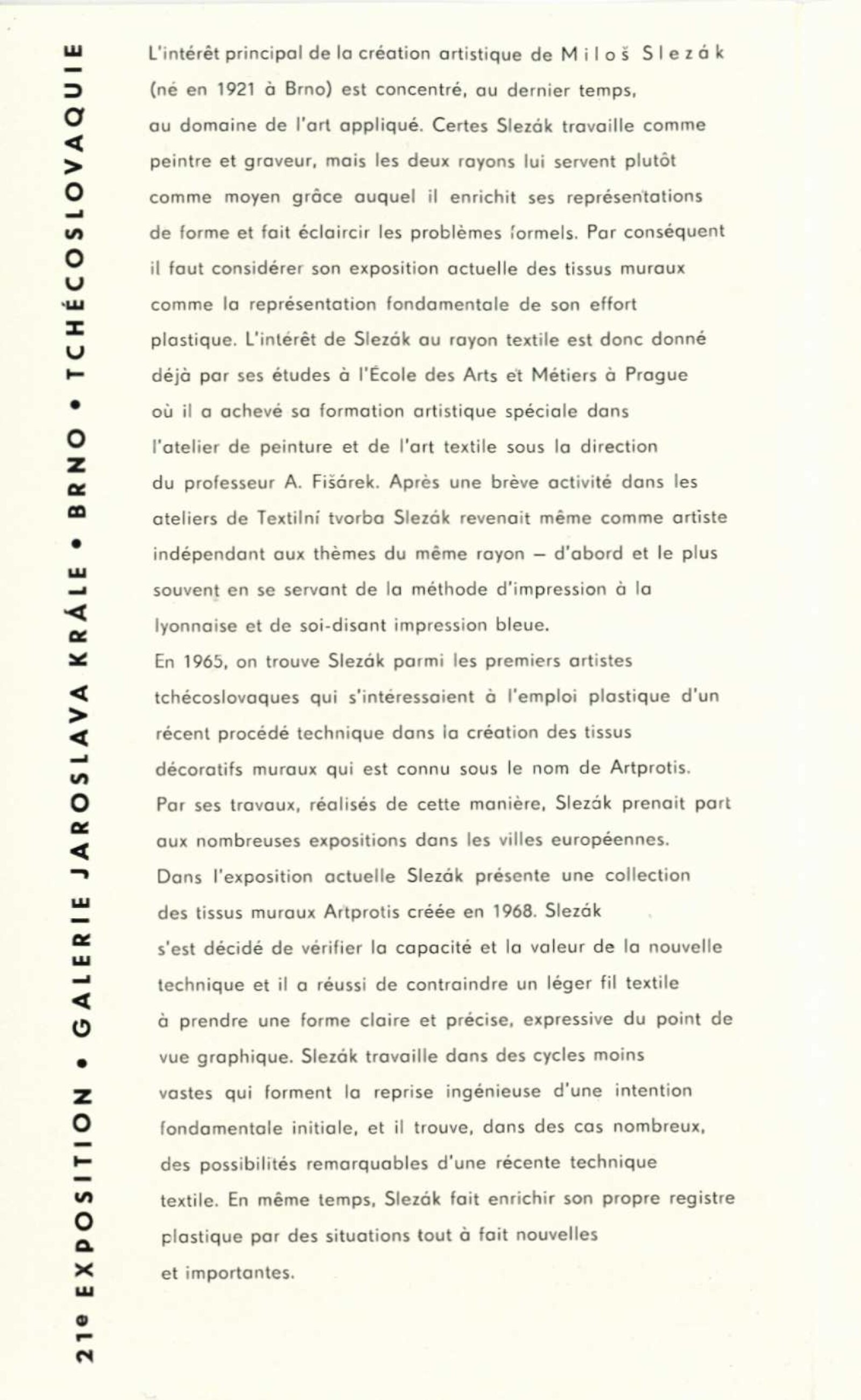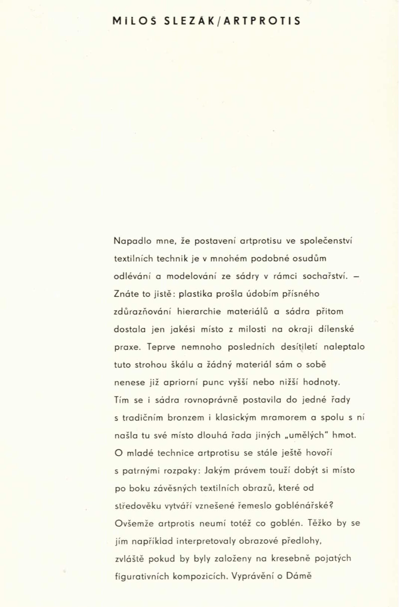 Miloš Slezák. Artprotis: Dům umění, 21. výstava v Galerii Jaroslava Krále, 14. 12. 1968 – 12. 1. 1969 / Text: Igor Zhoř. – Brno: ČFVU, 1968. – 10 s., obr., portrét, životopis, DU 512. – MZK; MG