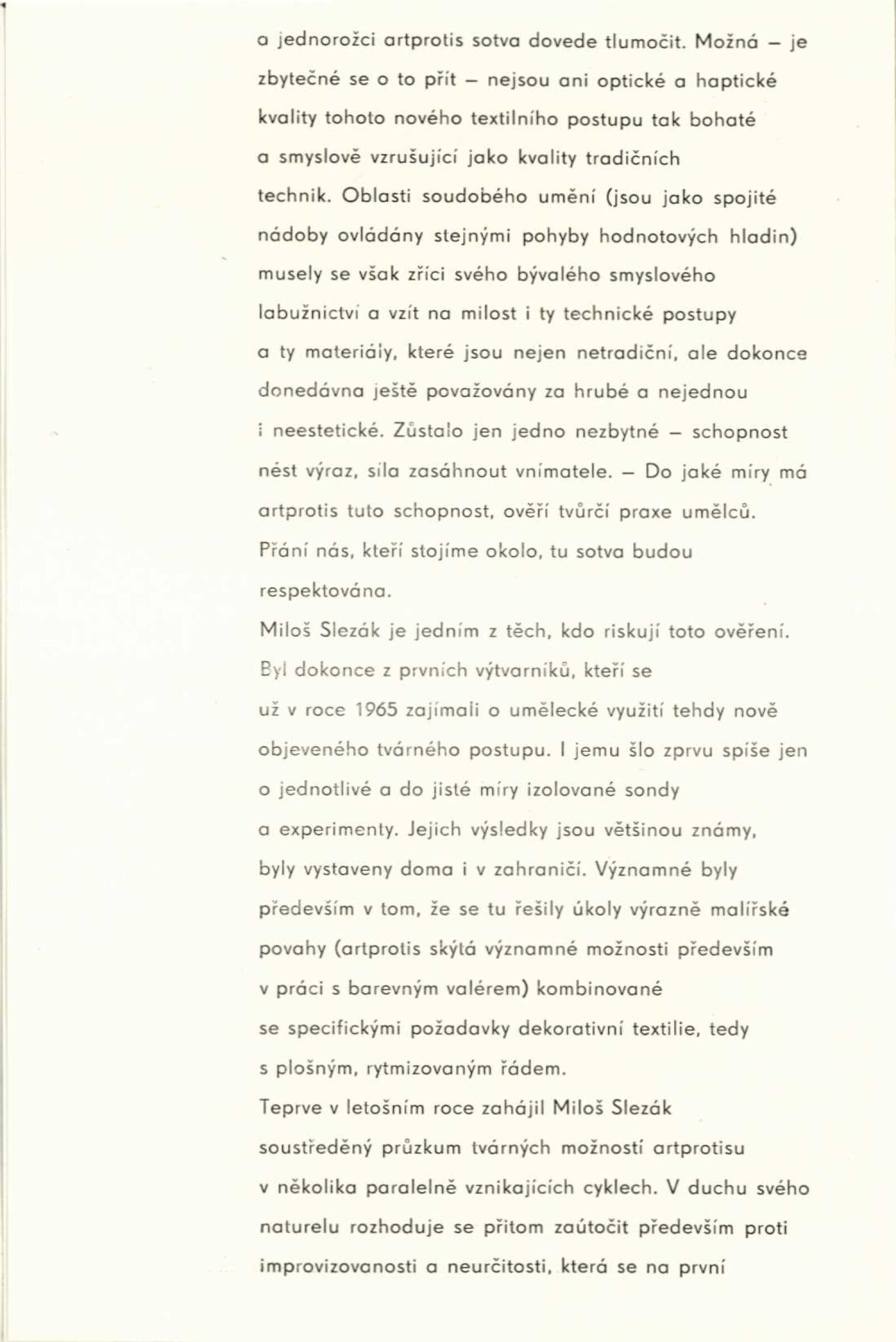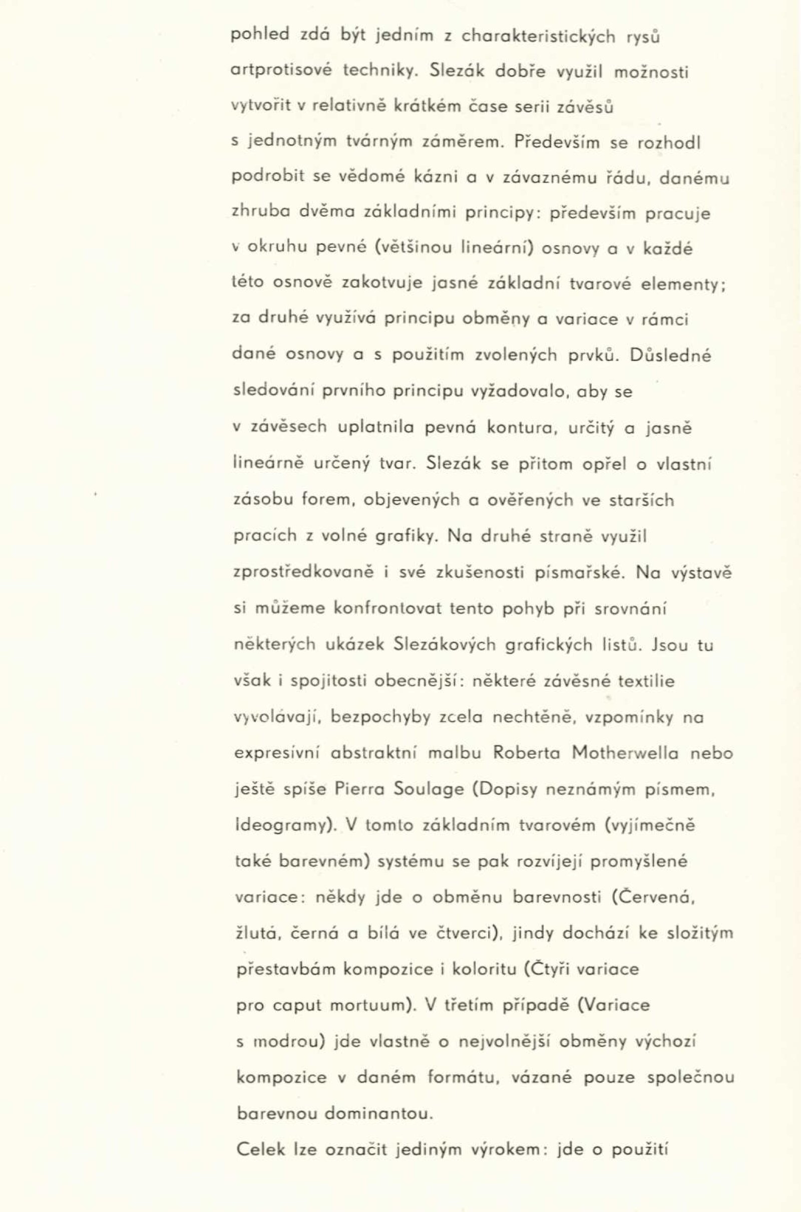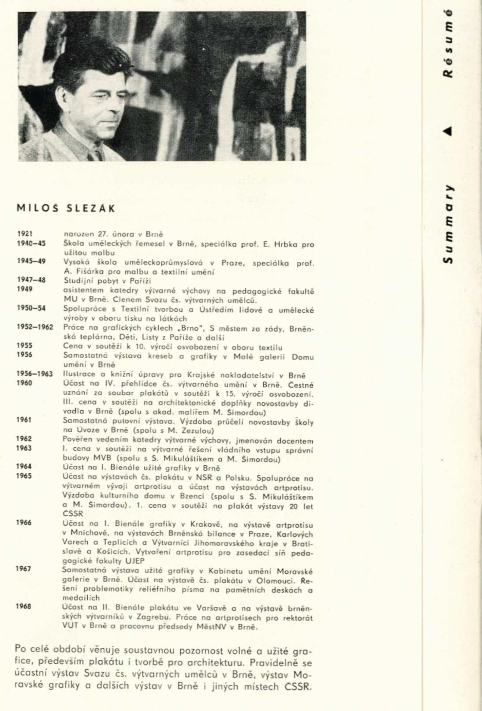 Miloš Slezák. Artprotis: Dům umění, 21. výstava v Galerii Jaroslava Krále, 14. 12. 1968 – 12. 1. 1969 / Text: Igor Zhoř. – Brno: ČFVU, 1968. – 10 s., obr., portrét, životopis, DU 512. – MZK; MG