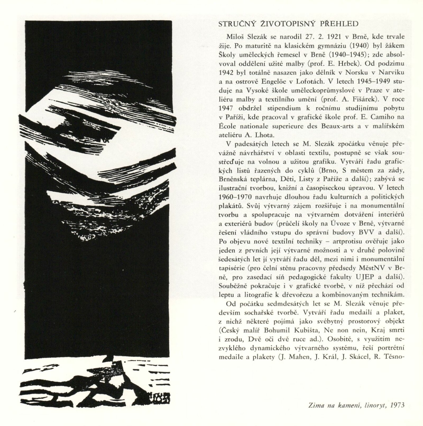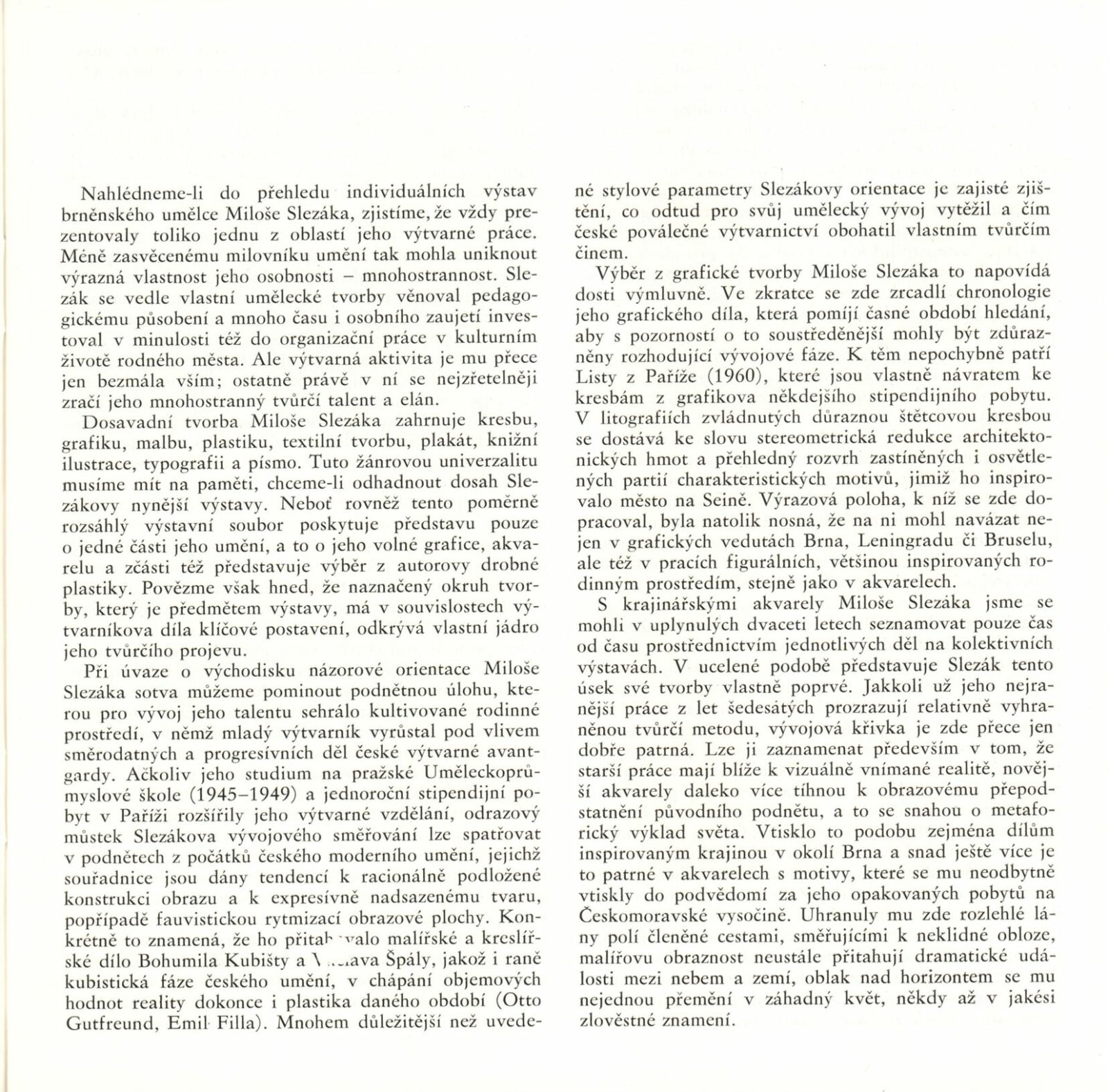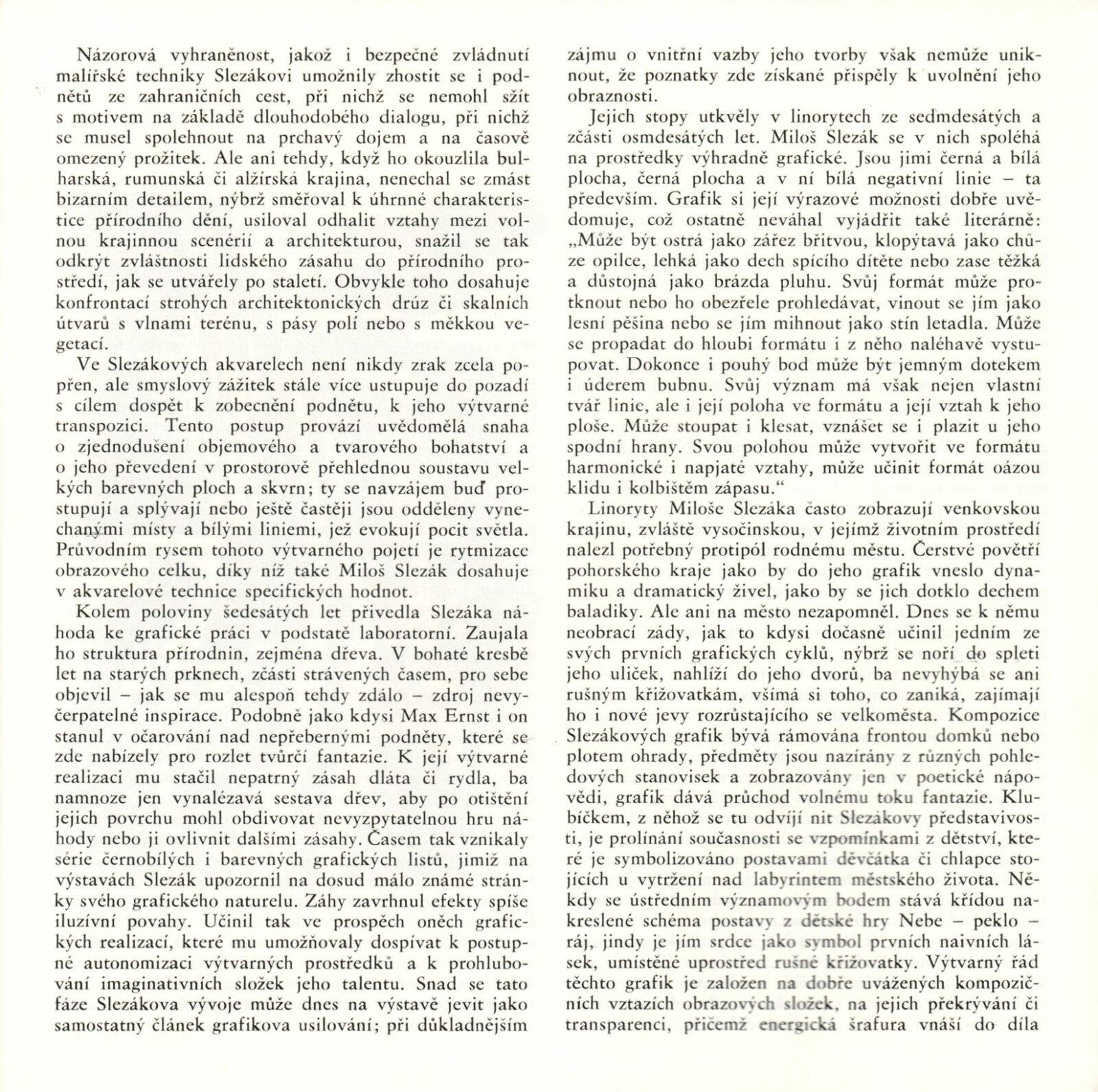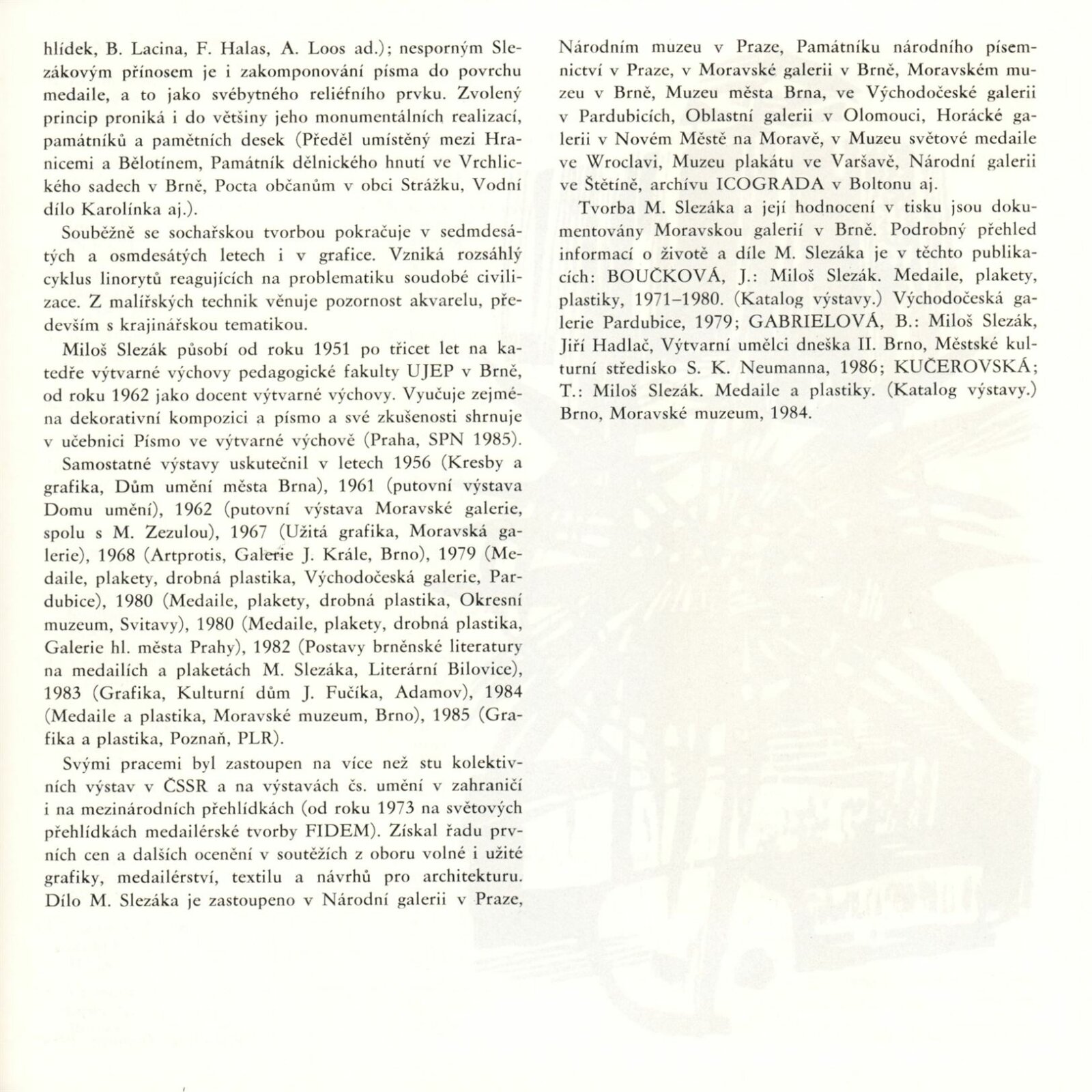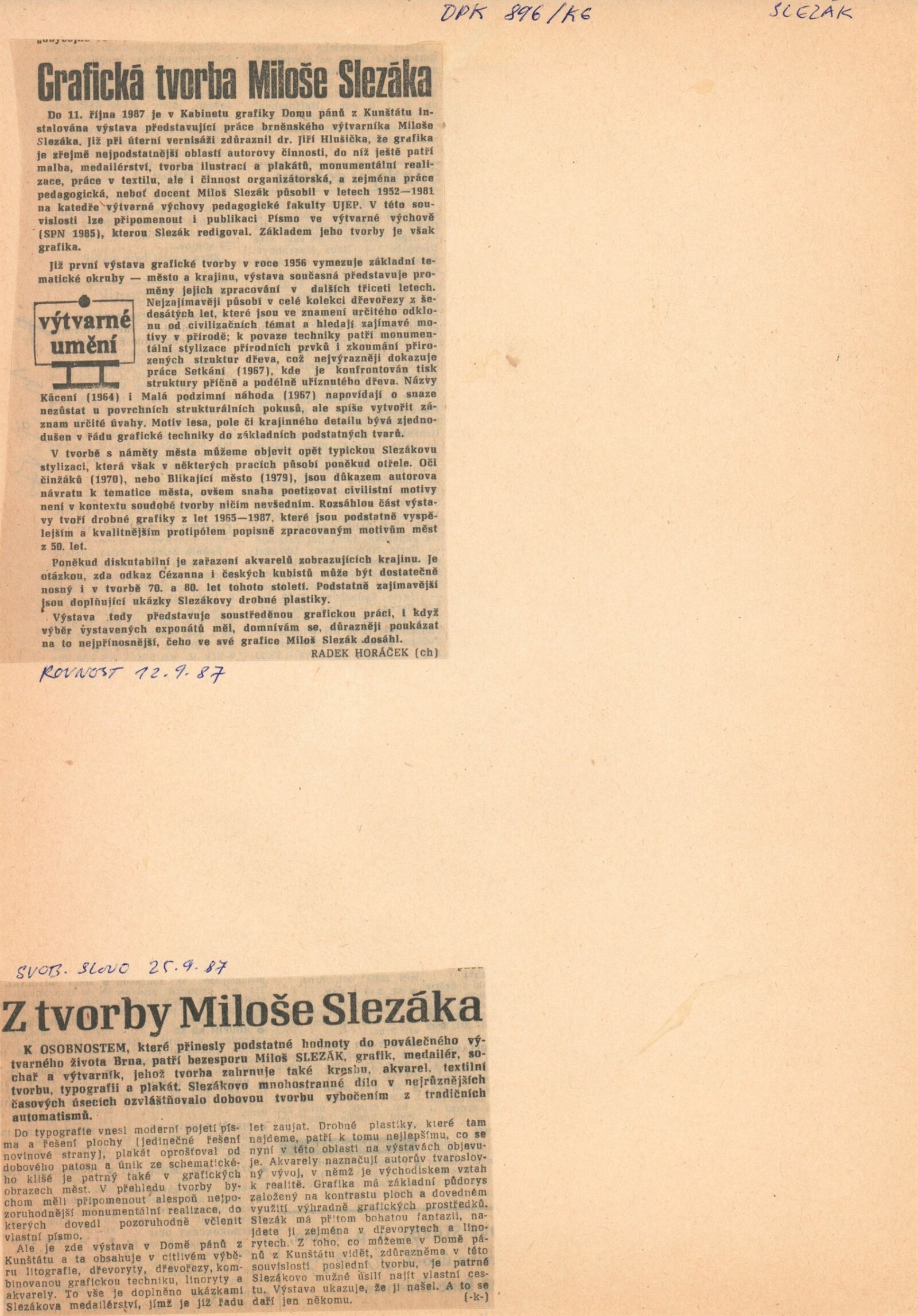 Miloš Slezák. Grafika, akvarely: Dům umění / Dům pánů z Kunštátu, Kabinety fotografie a grafiky, 8. 9. – 4. 10. 1987 / Text: Jiří Hlušička. – Brno: DUmB, 1987. – [40] s., obr., životopis, DPK 896. – MZK; MG; MMB