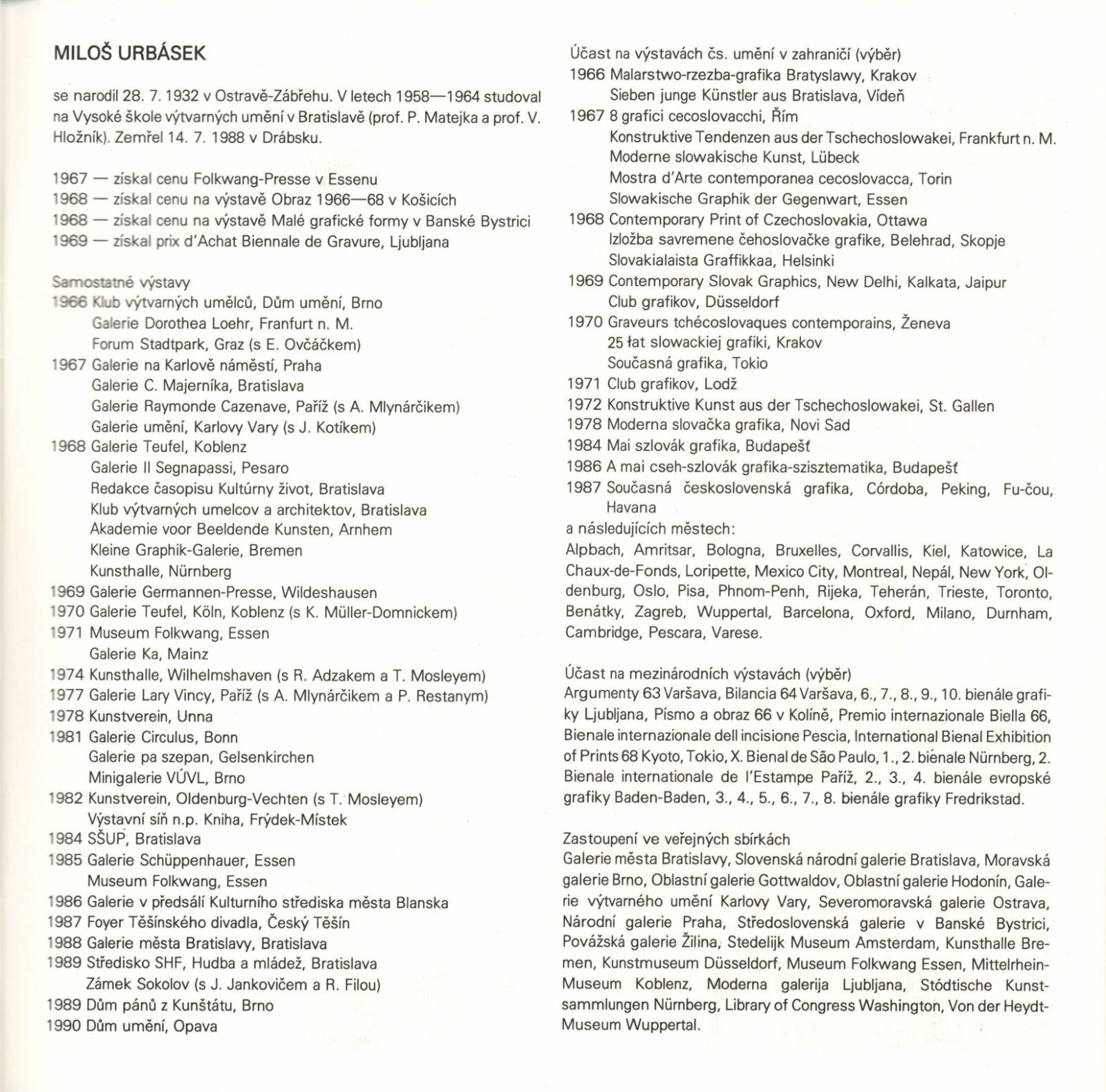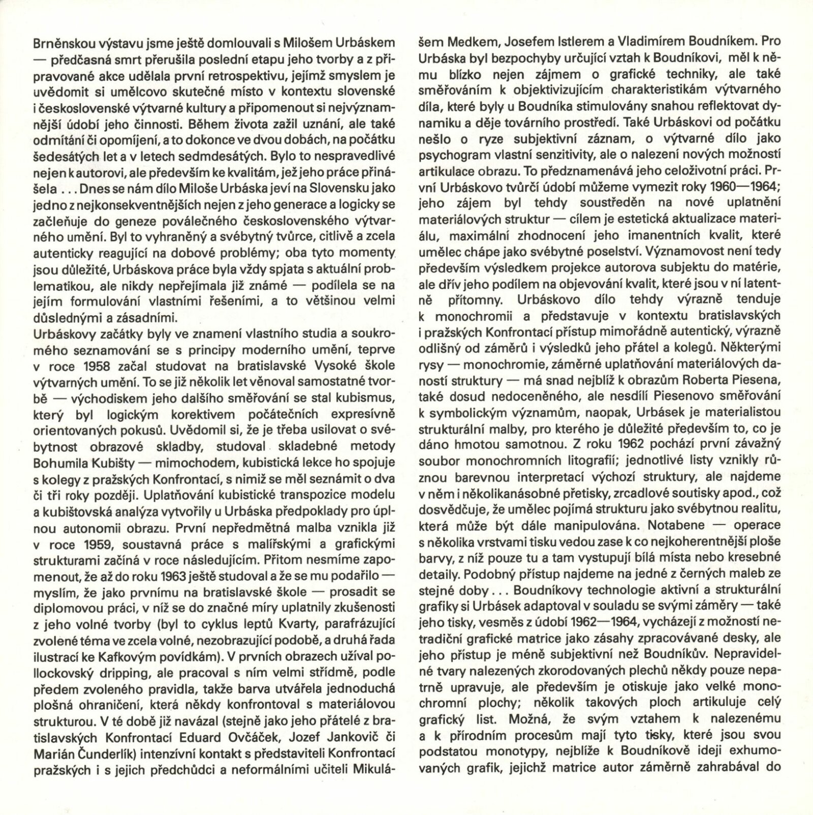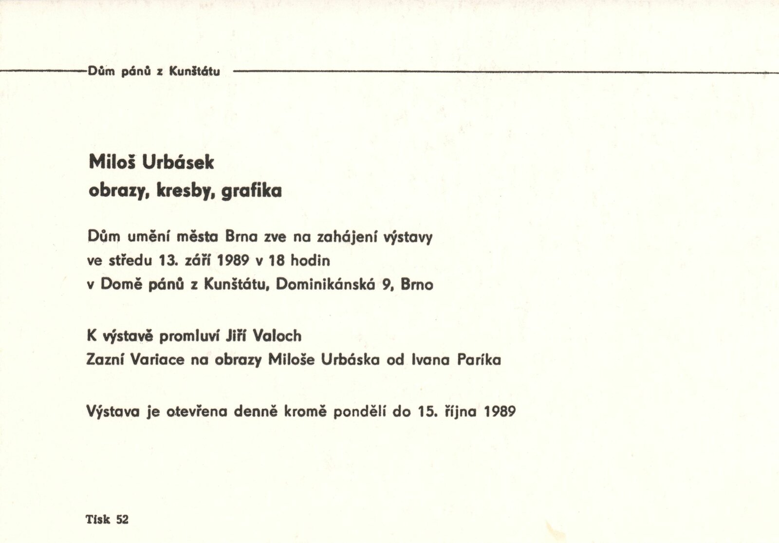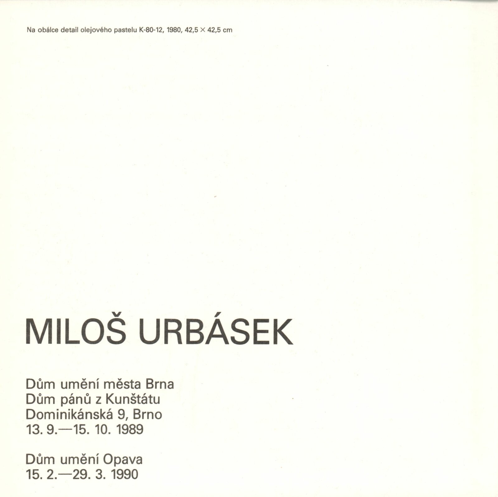 Miloš Urbásek: Dům umění / Dům pánů z Kunštátu, 1. patro, 13. 9. – 15. 10. 1989 / Text: Jiří Valoch. – Brno: DUmB, 1989. – [52 ] s., obr., portrét, životní data, výstavy, zastoupení ve sbírkách, DPK 924. – MZK; MG; MMB