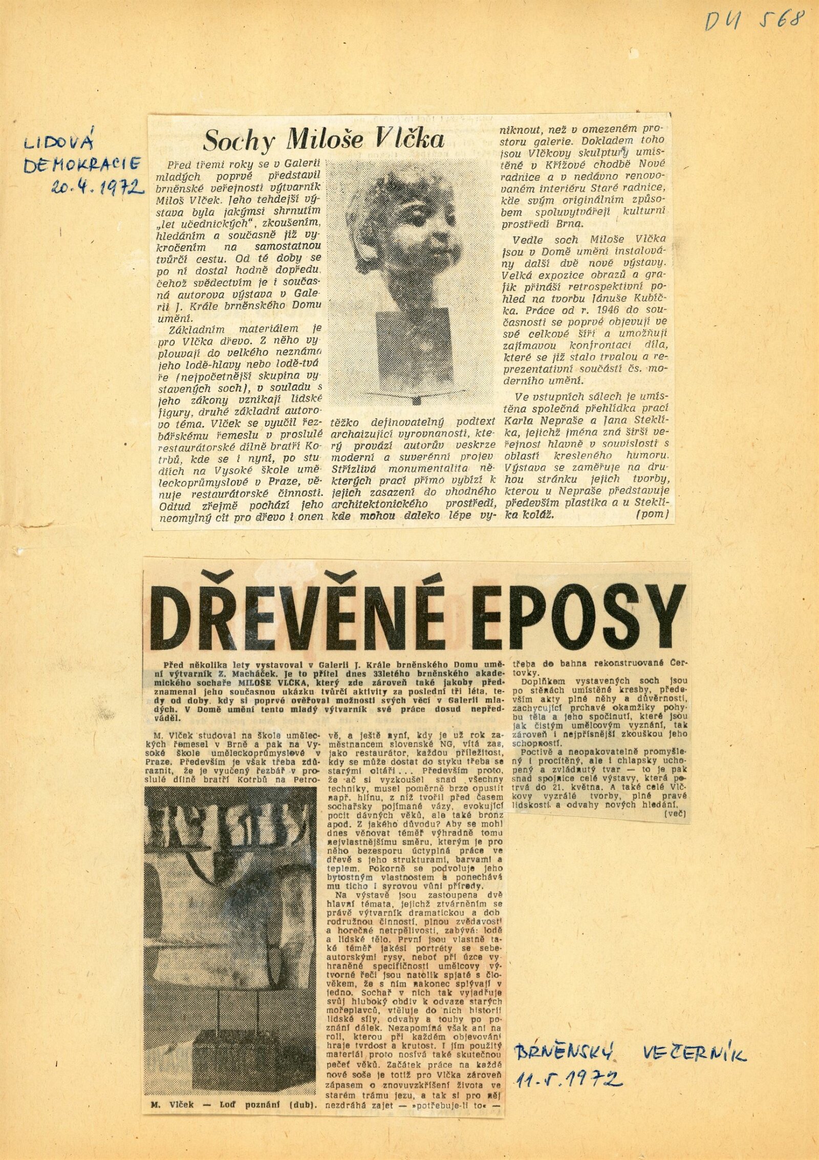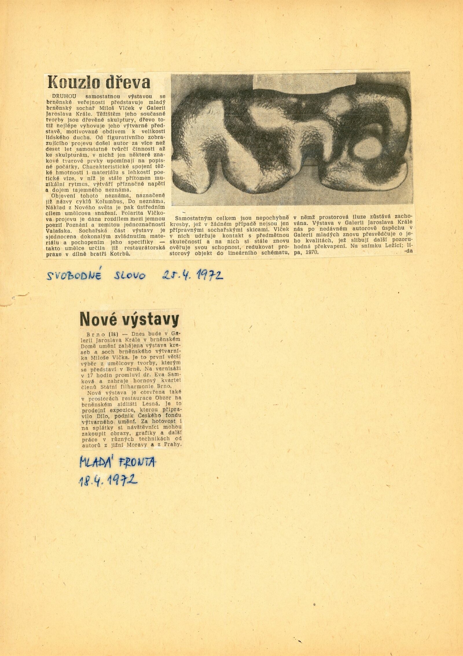 Miloš Vlček. Sochy a kresby: Dům umění, 45. výstava v Galerii Jaroslava Krále, 16. 4. – 21. 5. 1972 / Text: Eva Samková. – Brno: ČFVU, 1972. – 10 s., obr., portrét, životní data, výstavy, DU 568. – MG; MMB