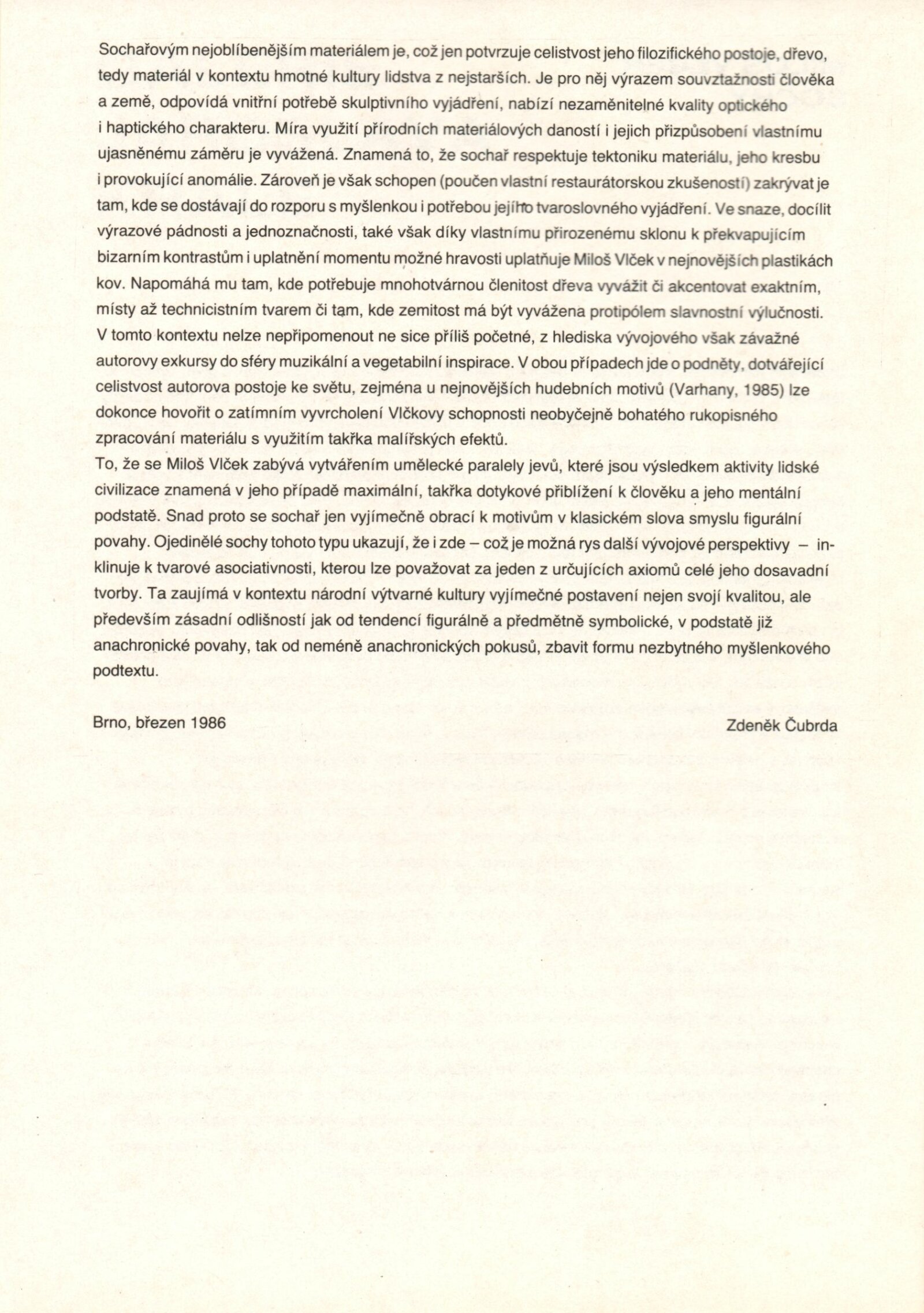 Miloš Vlček. Sochy: Dům umění, 132. výstava v Galerii Jaroslava Krále, 2. 4. – 20. 4. 1986 / Text: Zdeněk Čubrda. – Brno: SČVU, 1986. – [12] s., obr., seznam vystavených prací [1] s., portrét, životopis, DU 819