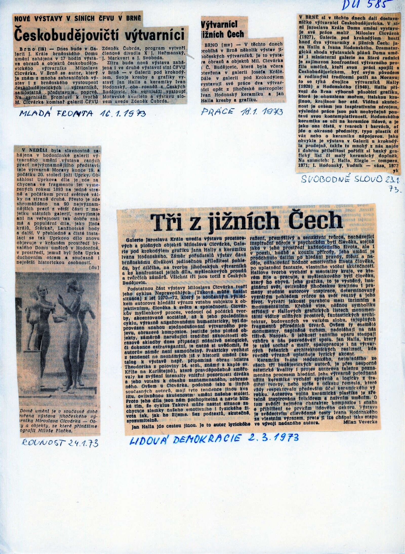 Miloslav Cicvarek. Obrazy a objekty: 51. výstava v Galerii Jaroslava Krále 16. 1. – 18. 2. 1973 / Text: Zdeněk Čubrda. – Brno: ČFVU, 1973. – 10 s., obr. Portrét, životní data, výstavy, ceny. – DU 585; MG