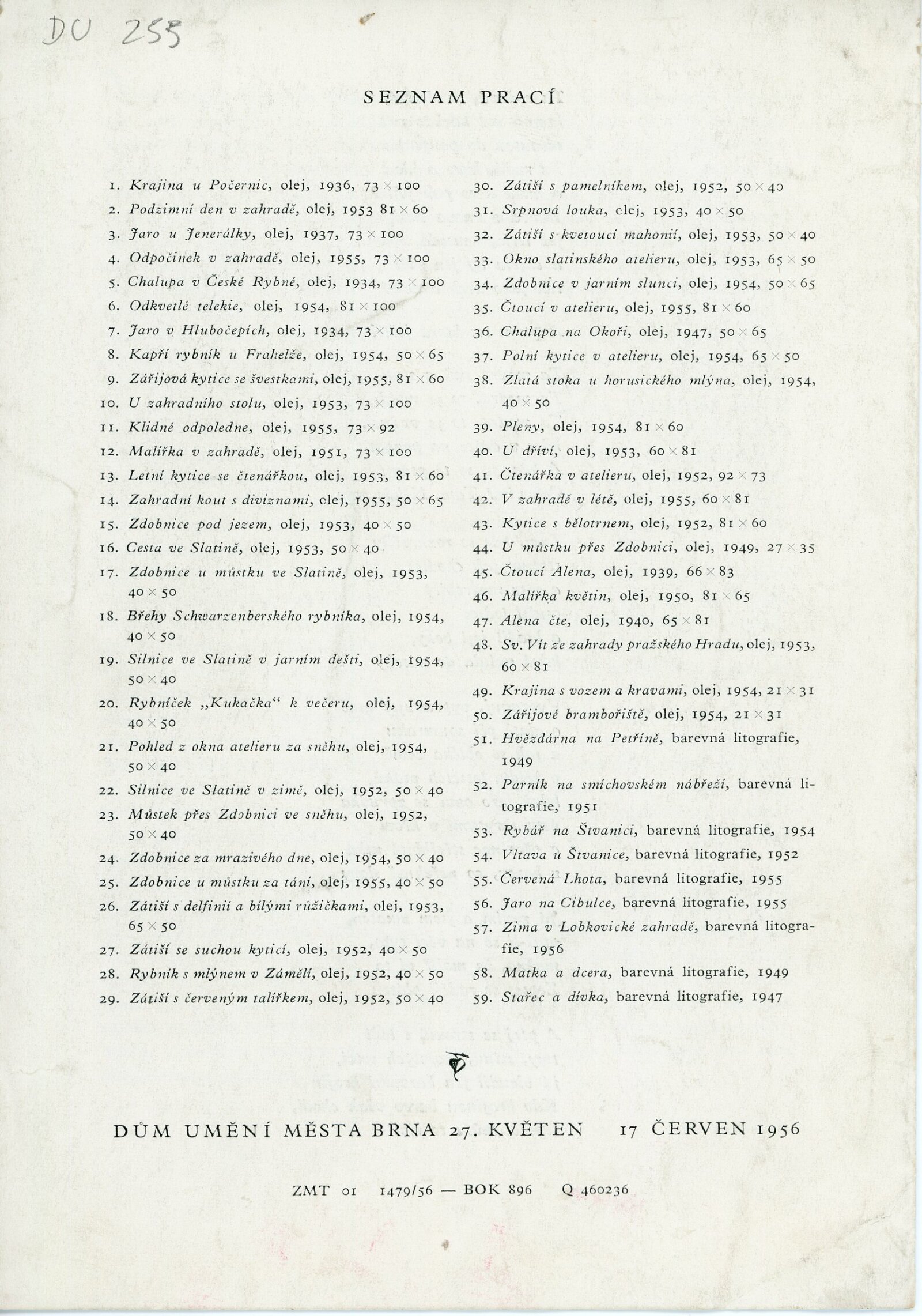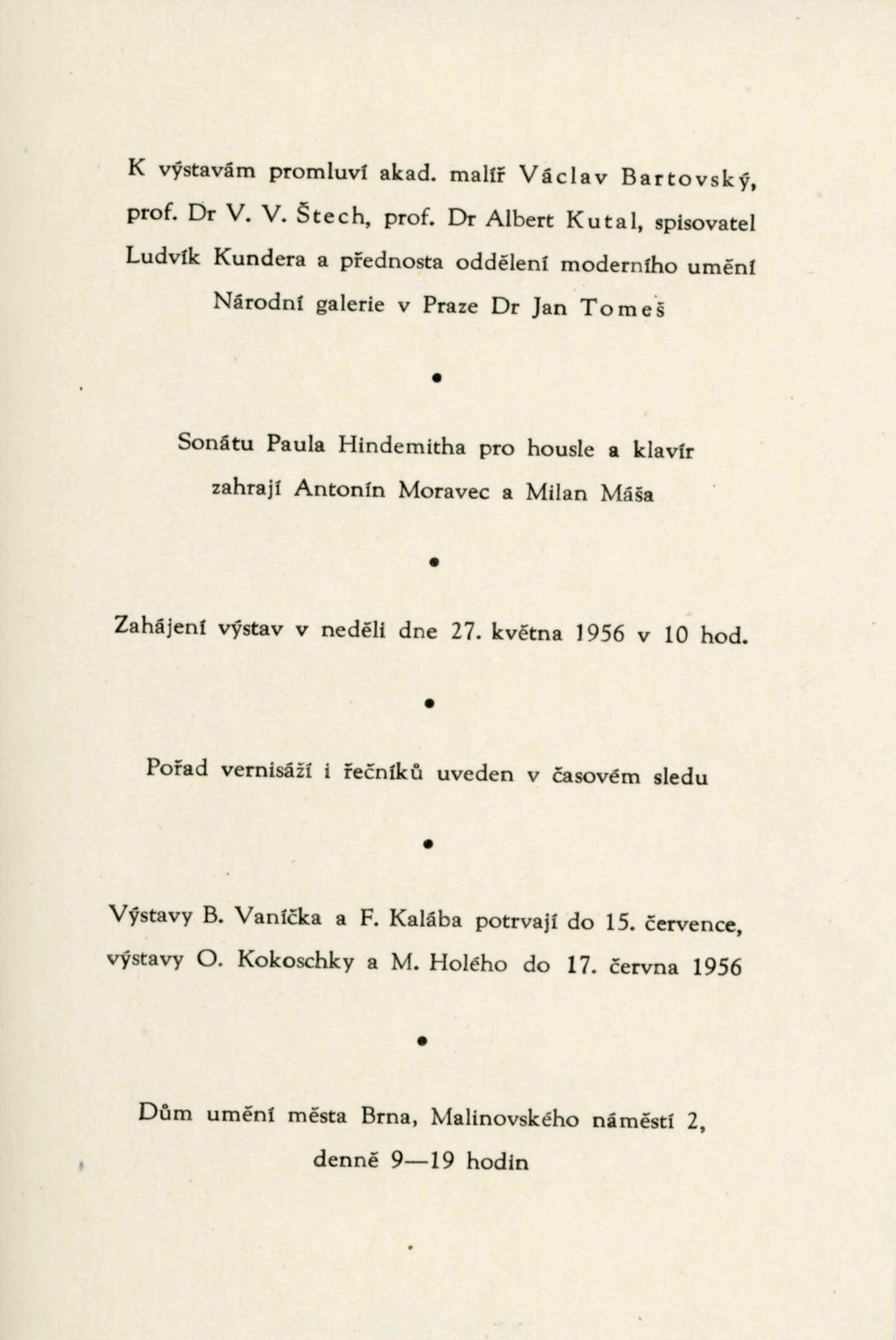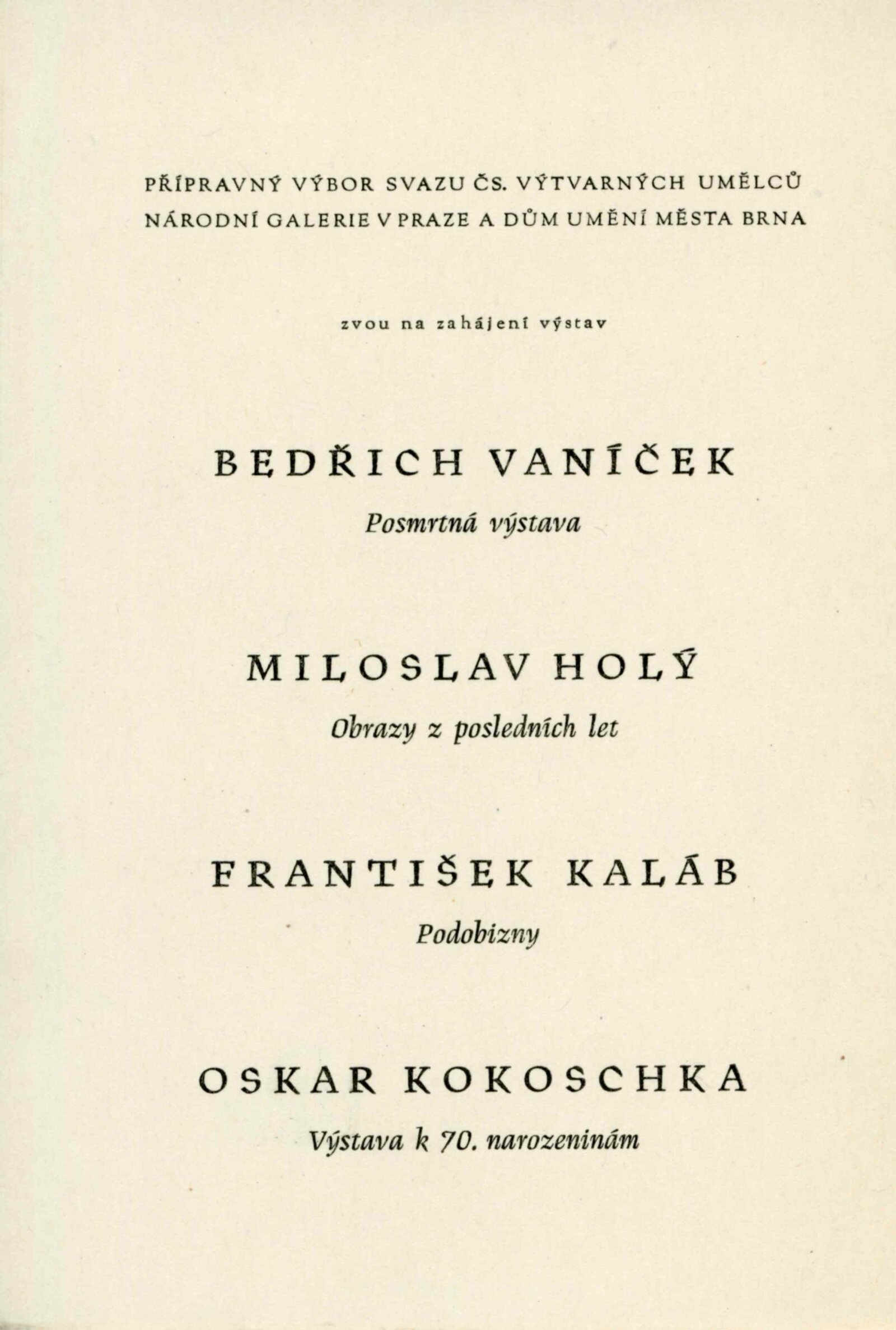 pozvánka, katalog, text pro rozhlas (Helena Motalová), krátký životopis umělce, seznam obrazů, báseň (Jaroslav Seifert), korespondence (s Václavem Bartovským a Miloslavem Holým z května a června 1956)