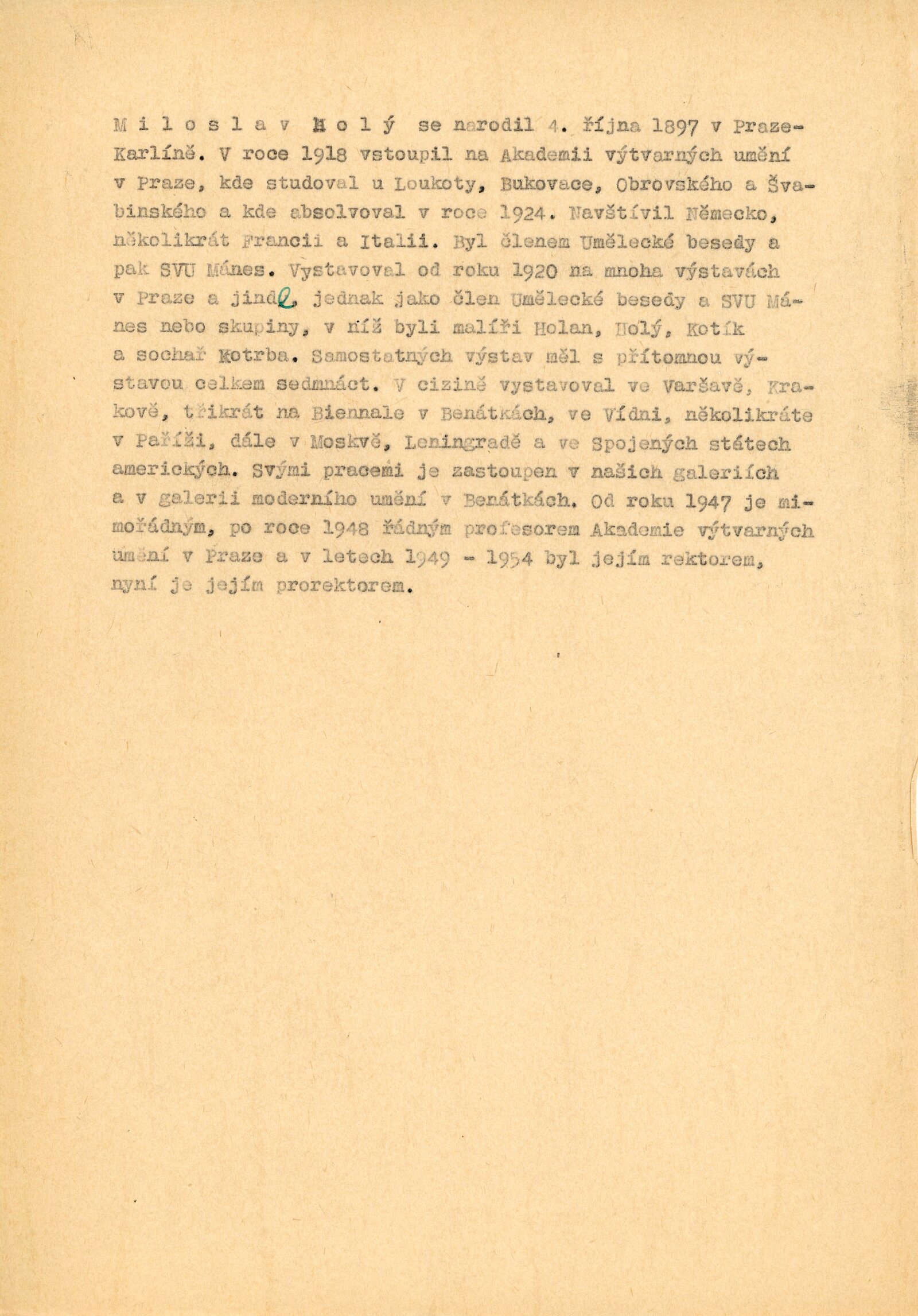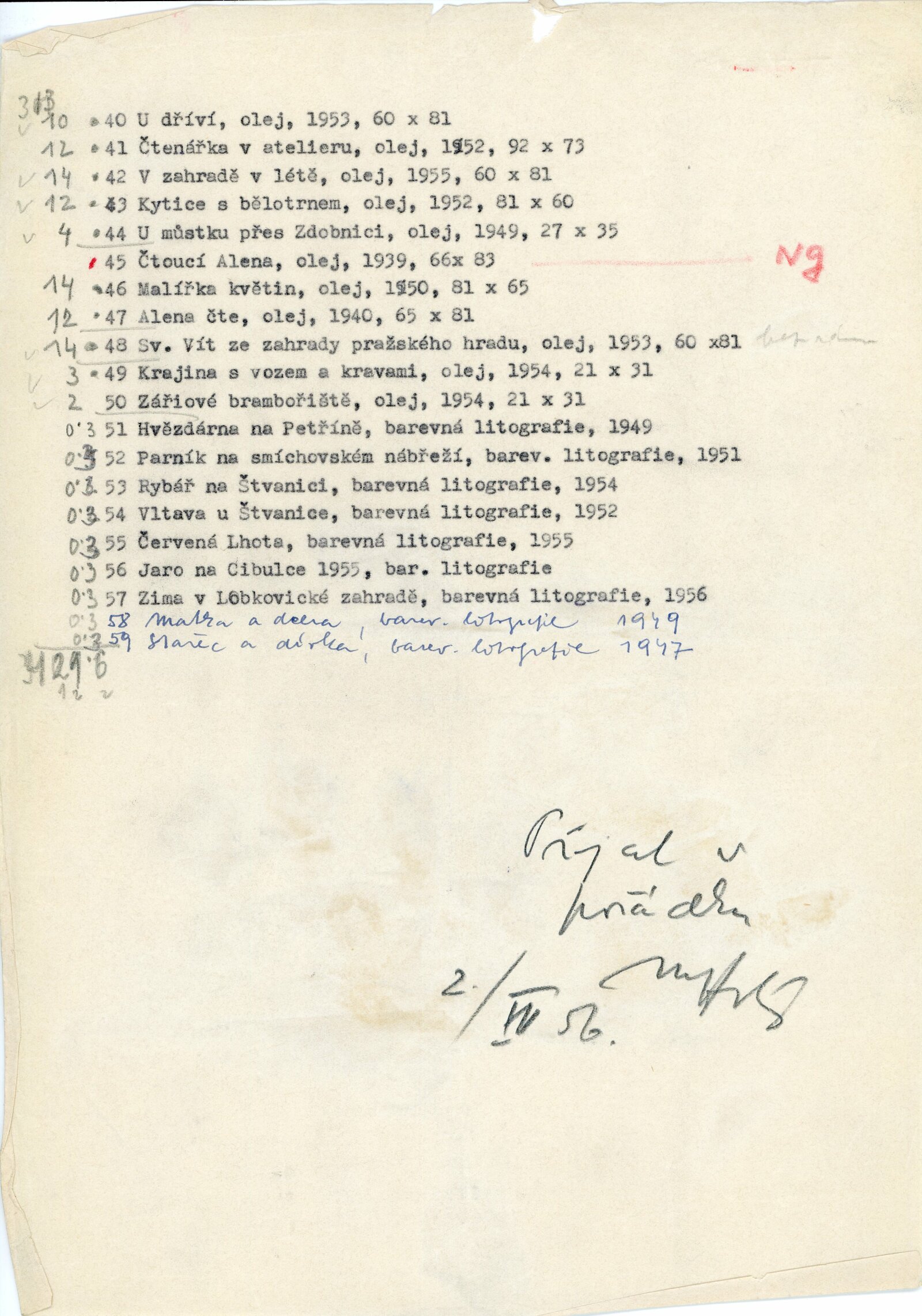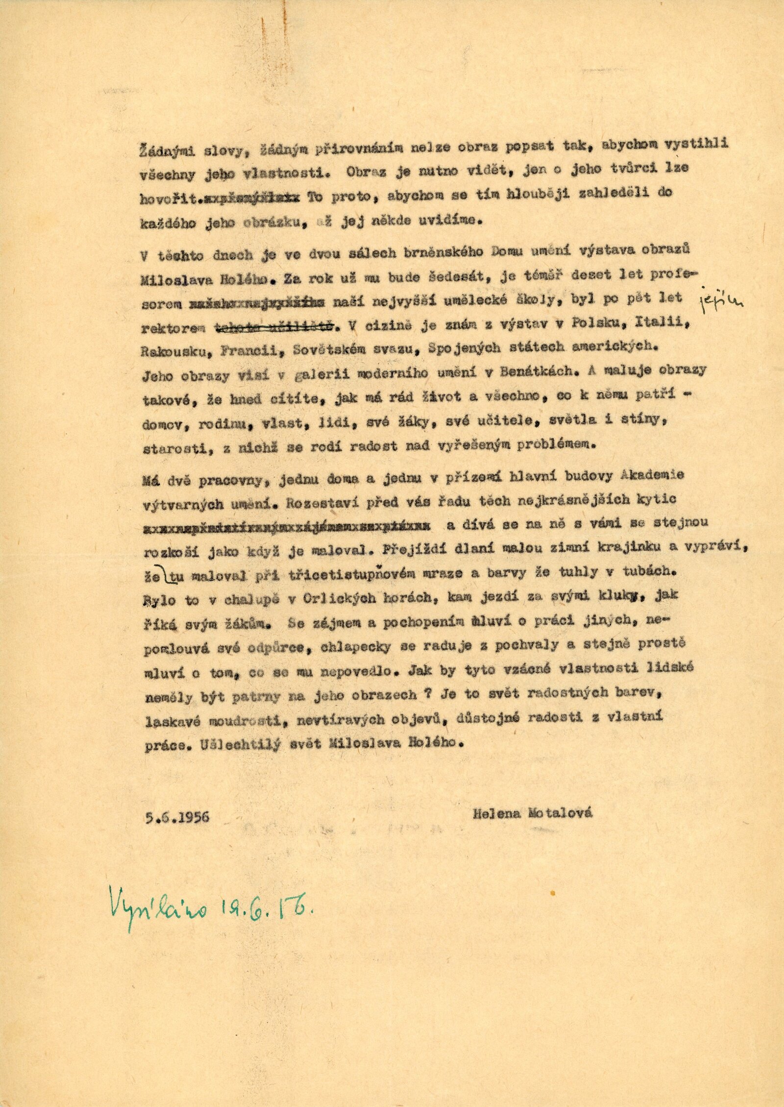 pozvánka, katalog, text pro rozhlas (Helena Motalová), krátký životopis umělce, seznam obrazů, báseň (Jaroslav Seifert), korespondence (s Václavem Bartovským a Miloslavem Holým z května a června 1956)