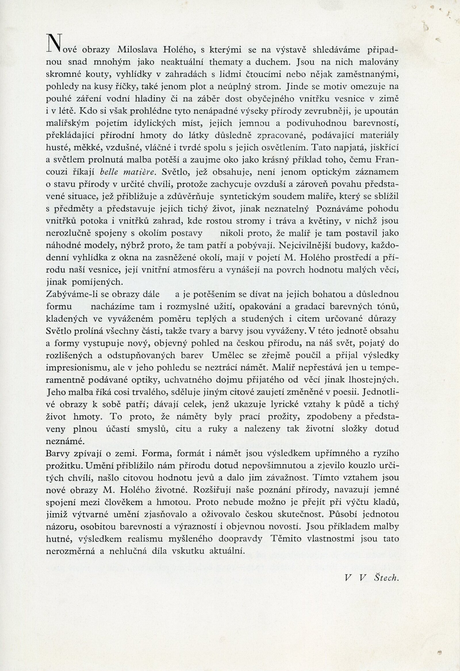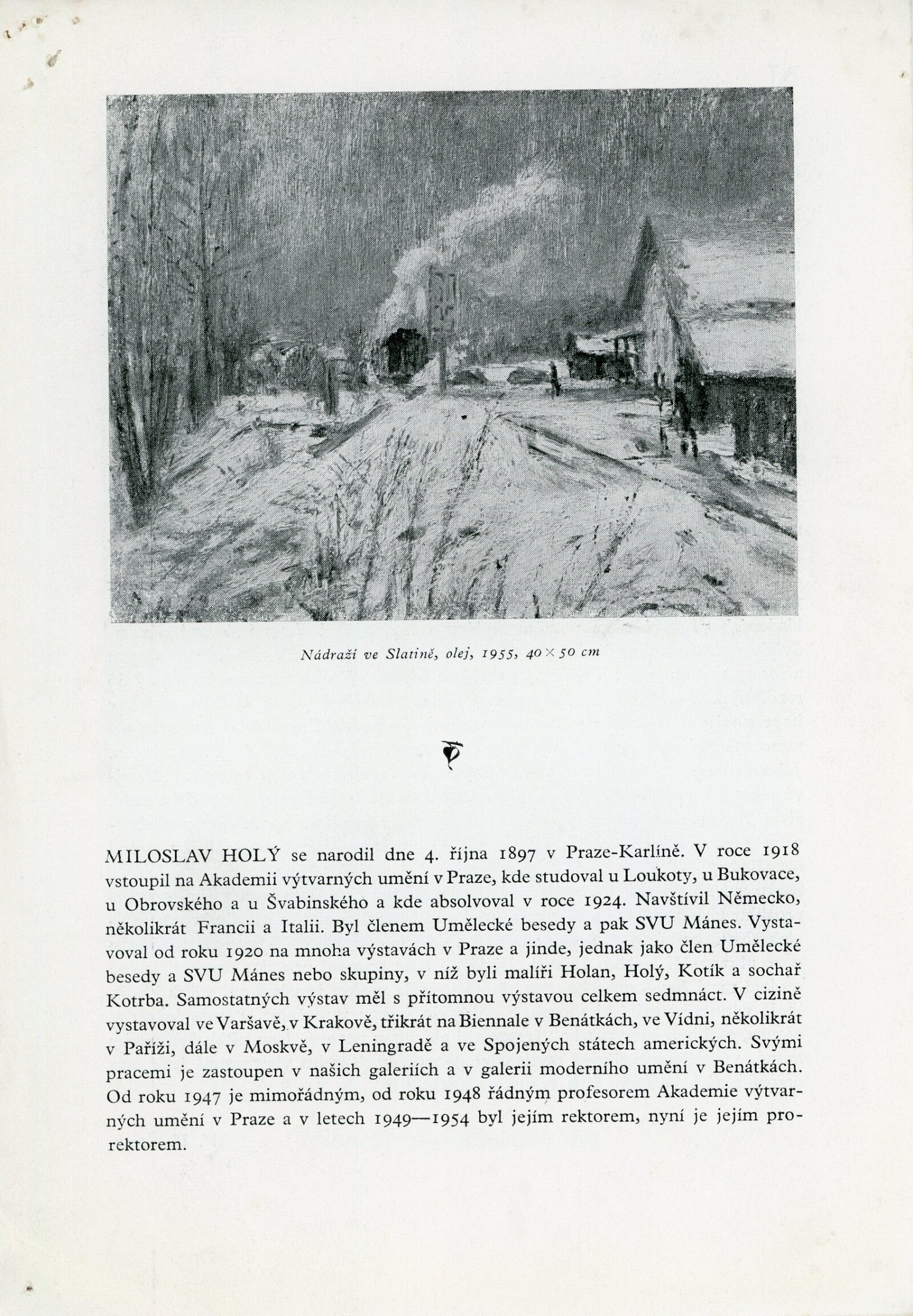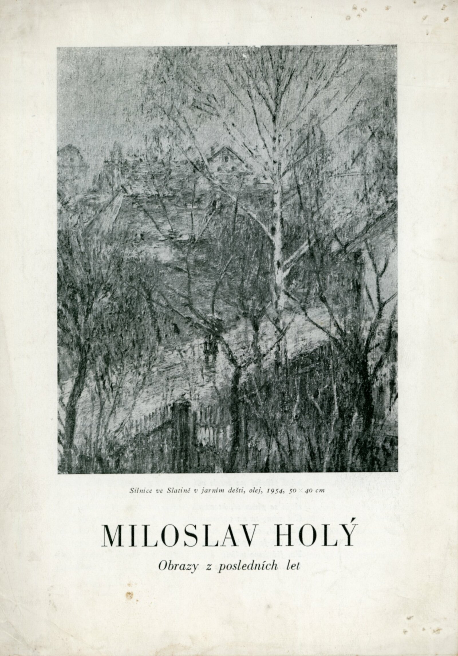 Miloslav Holý. Obrazy z posledních let: Dům umění města Brna, 27. 5. – 17. 6. 1956 / Text: V. V. Štech. – Brno: DUmB, 1956. – skládačka, 6 s., obr., báseň Jaroslava Seiferta, životopis, DU 255. – MG; MMB