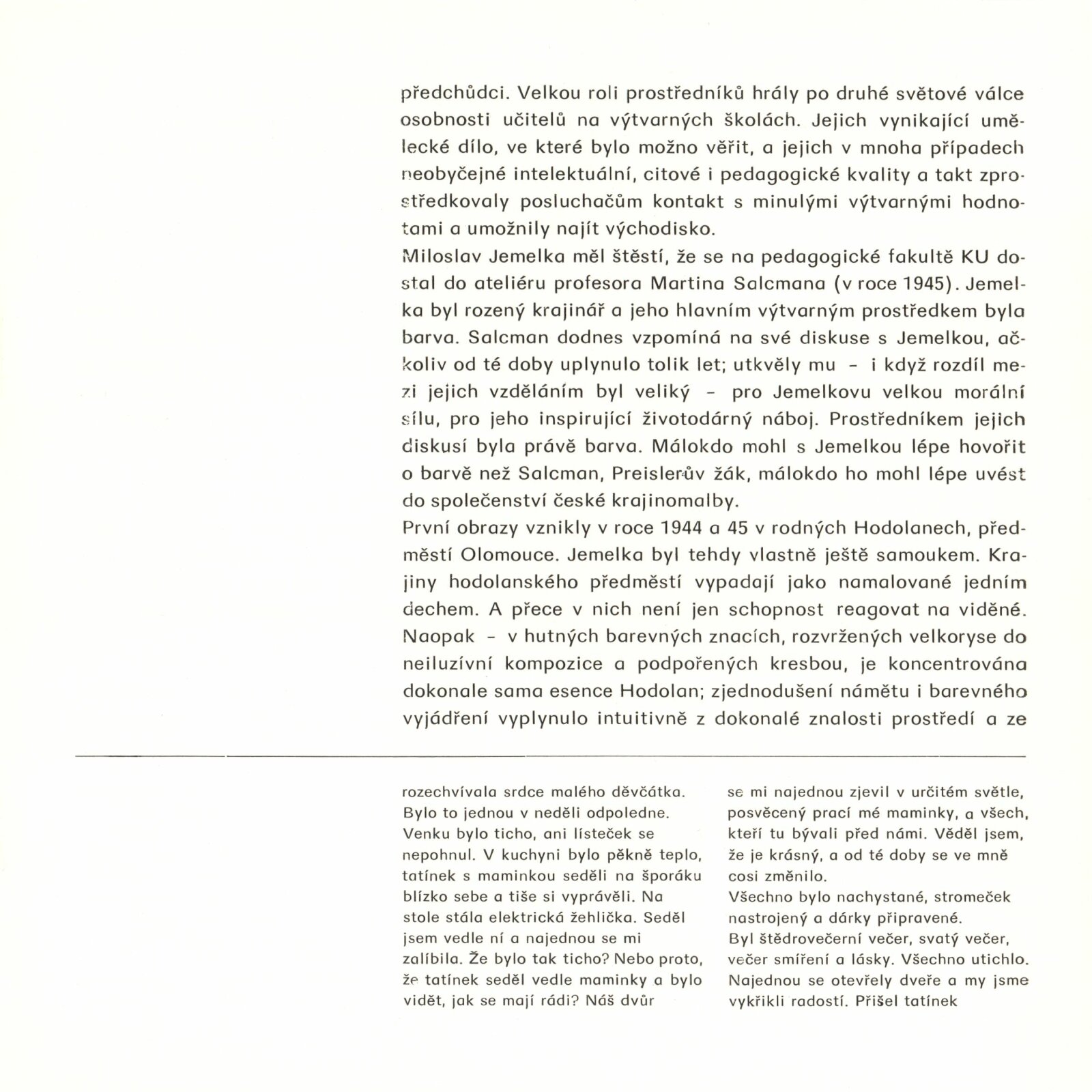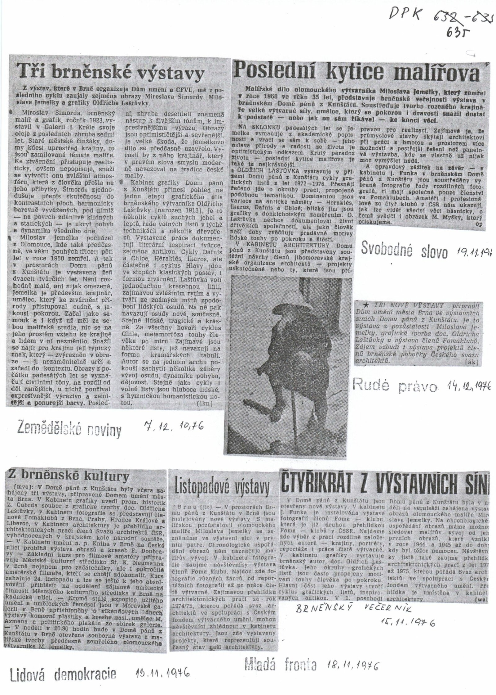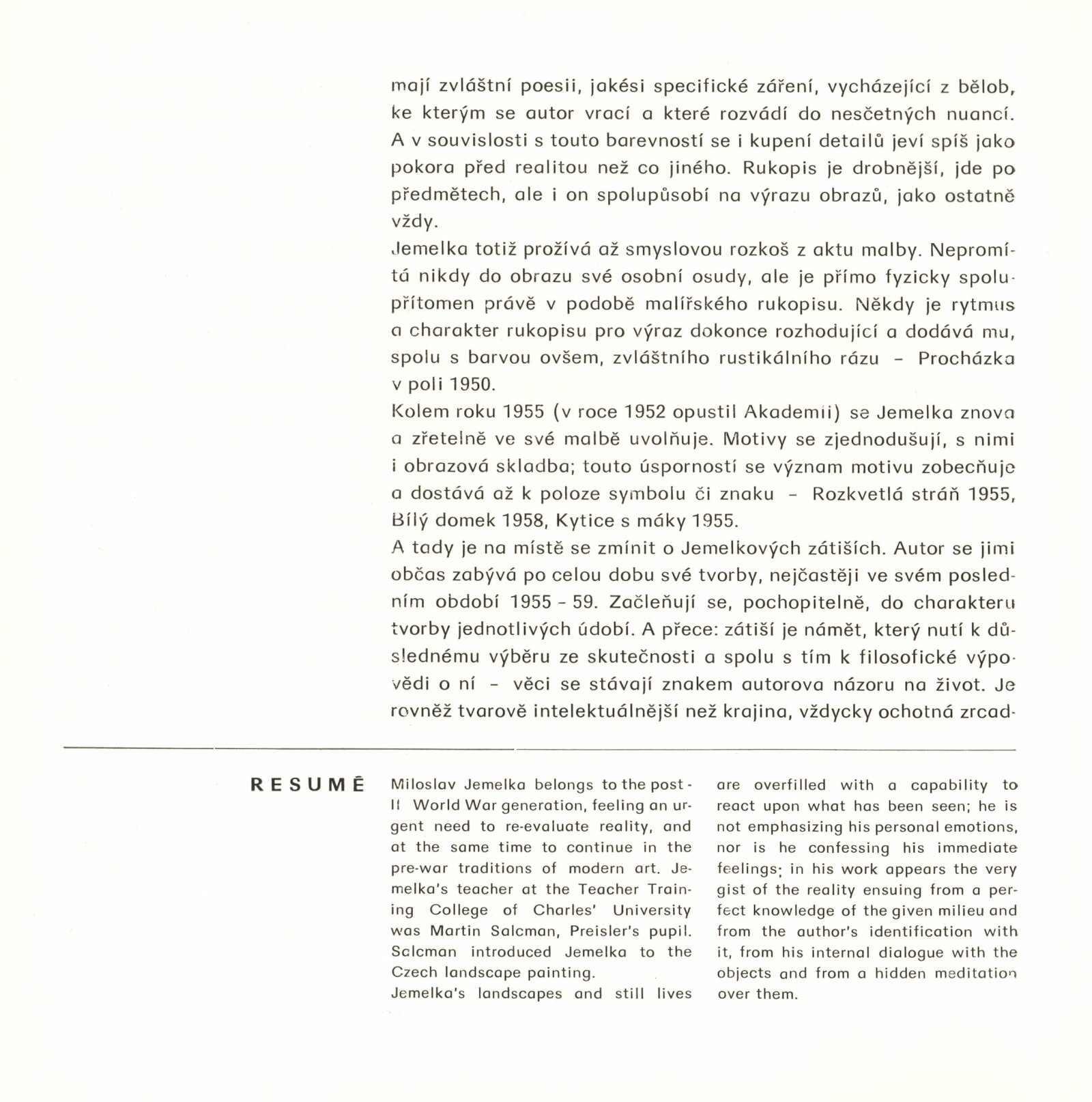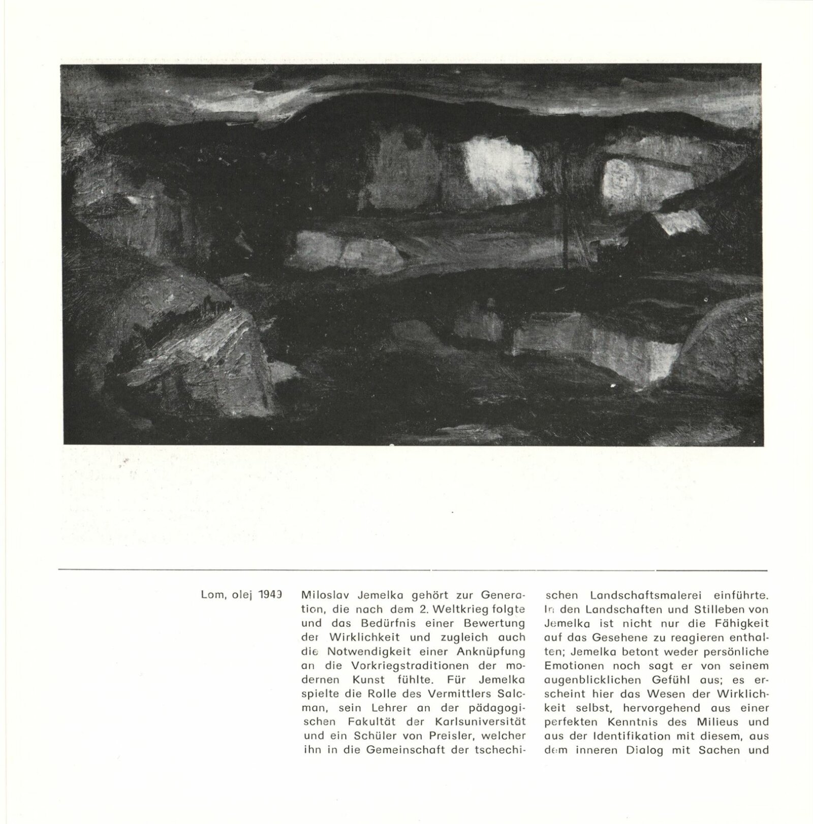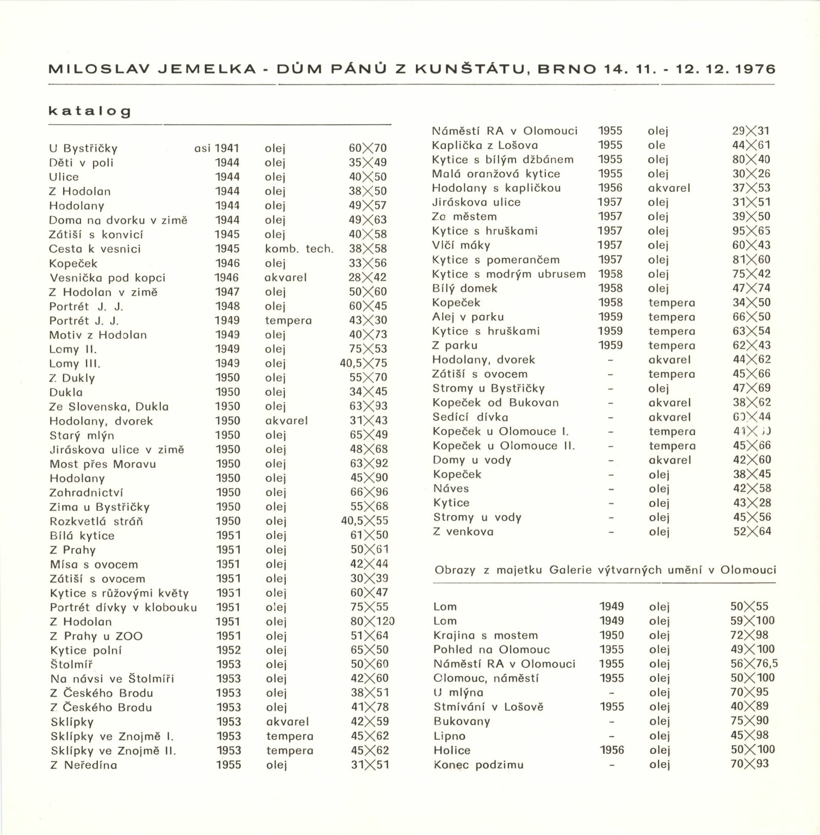 Miloslav Jemelka: Dům umění / Dům pánů z Kunštátu, 14. 11. – 12. 12. 1976 / Text: Alena Konečná. – Brno: DUmB, 1976. – 20 s., obr., katalog 1 s., životní data, výstavy, DPK 635. – MZK; MG; MMB