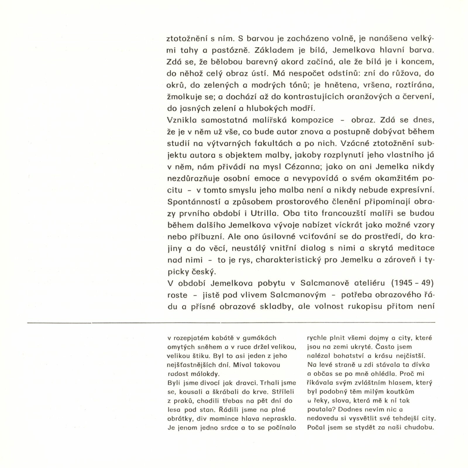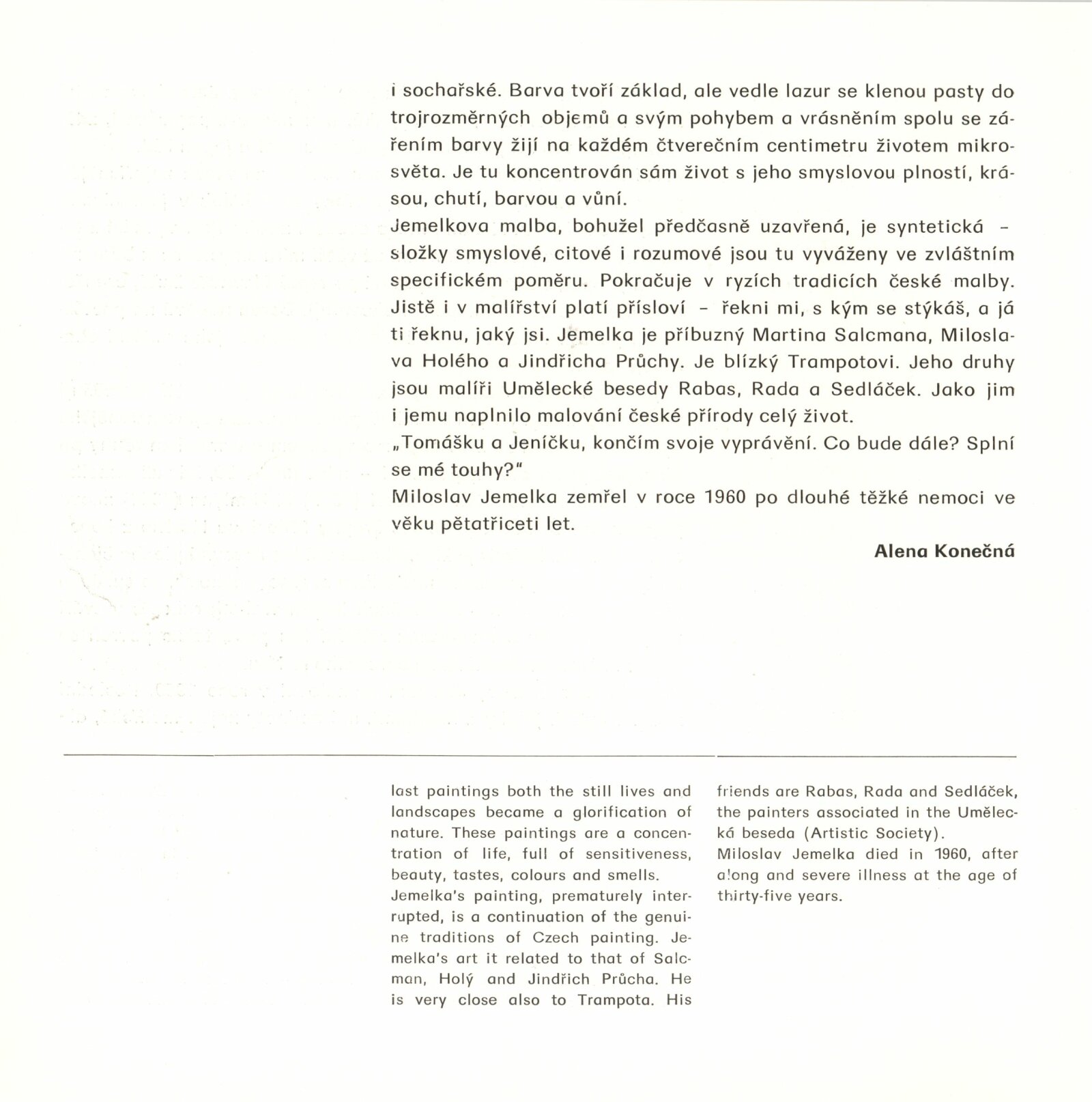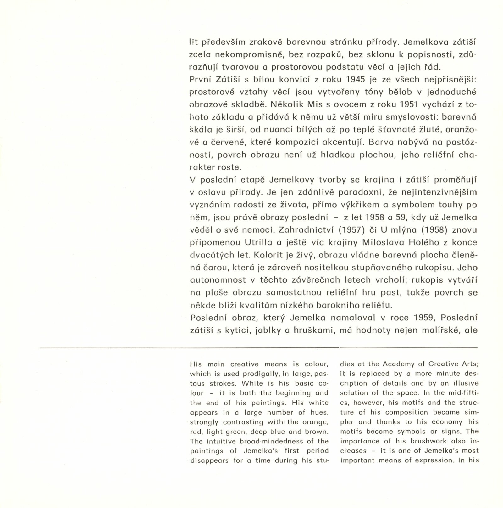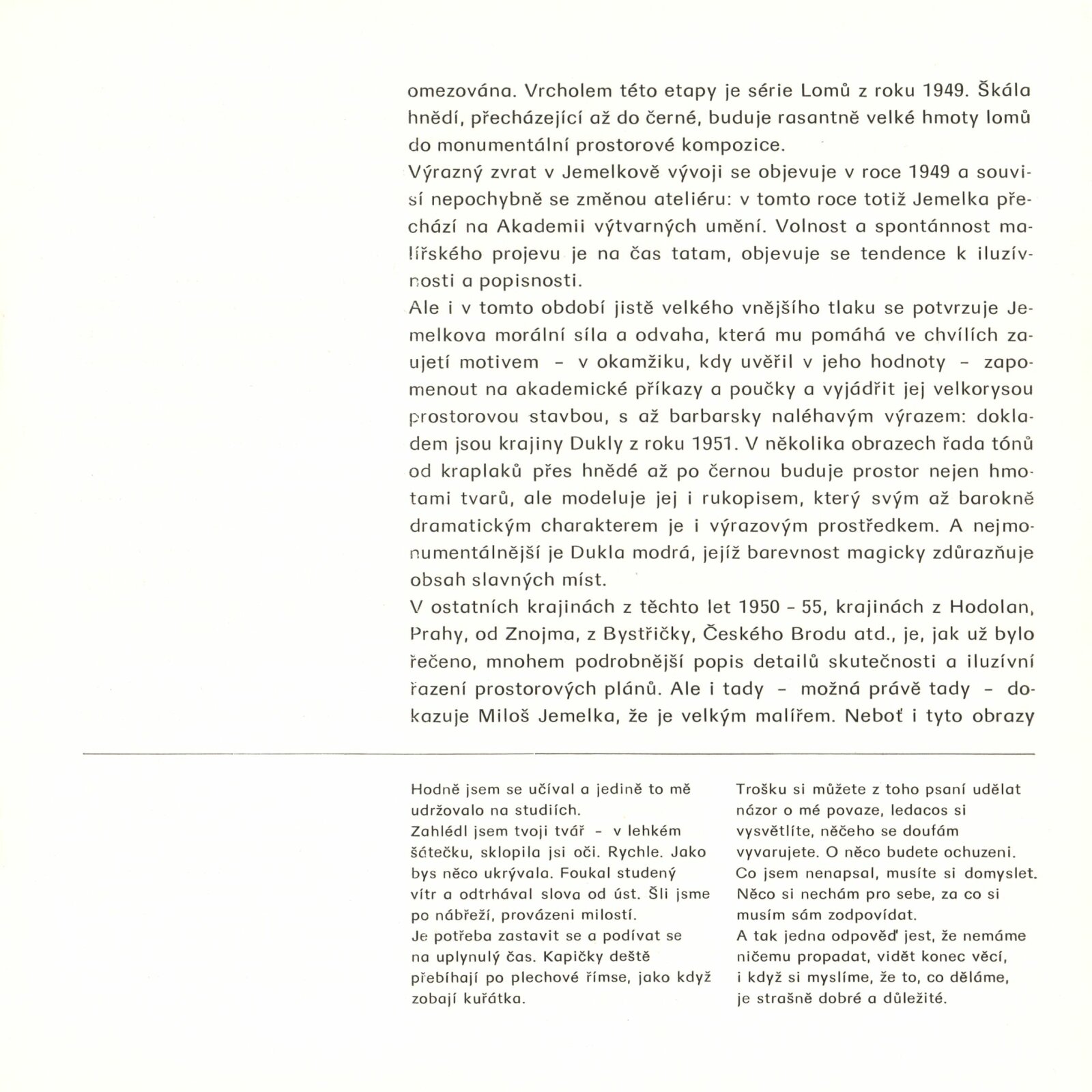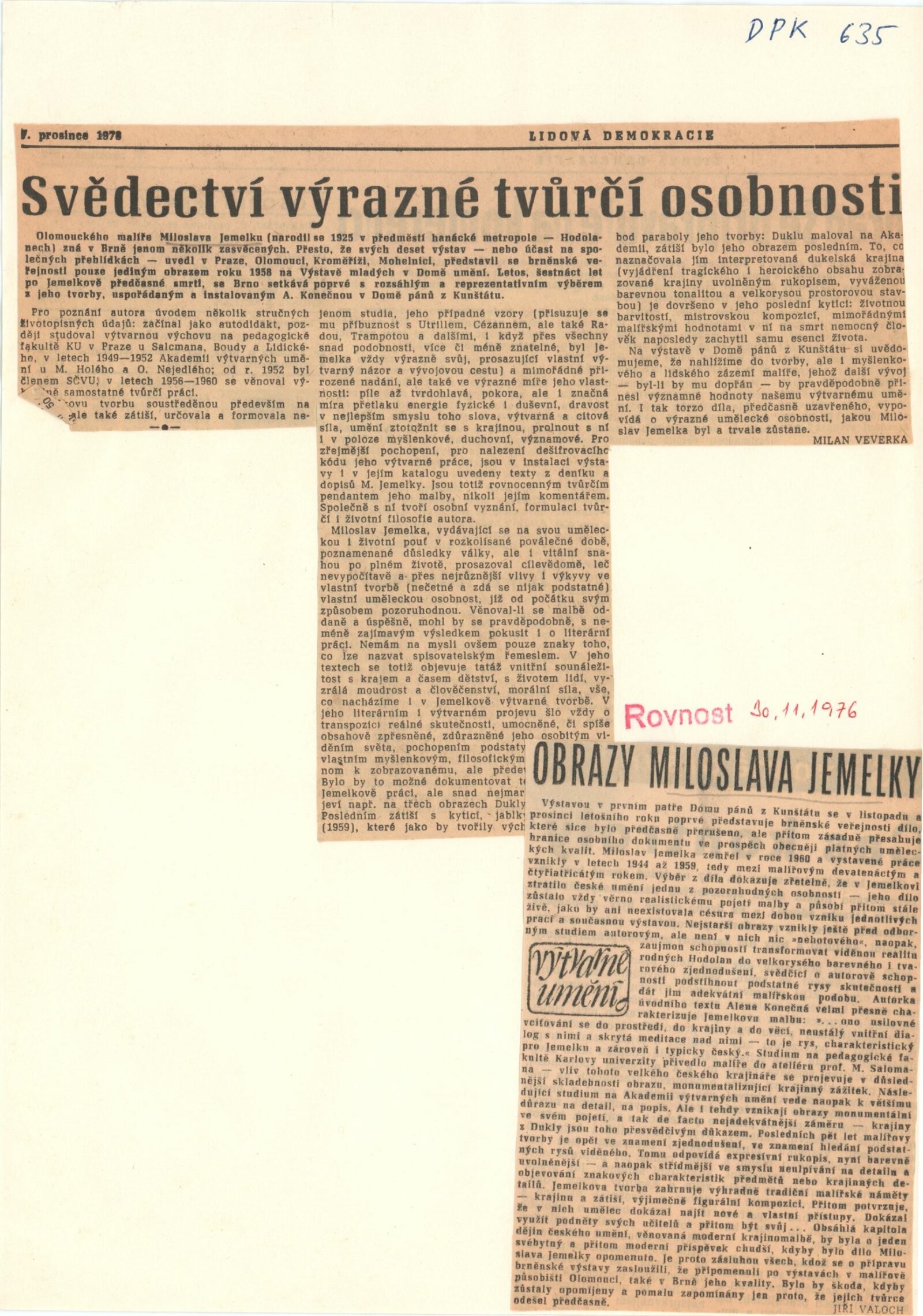 Miloslav Jemelka: Dům umění / Dům pánů z Kunštátu, 14. 11. – 12. 12. 1976 / Text: Alena Konečná. – Brno: DUmB, 1976. – 20 s., obr., katalog 1 s., životní data, výstavy, DPK 635. – MZK; MG; MMB