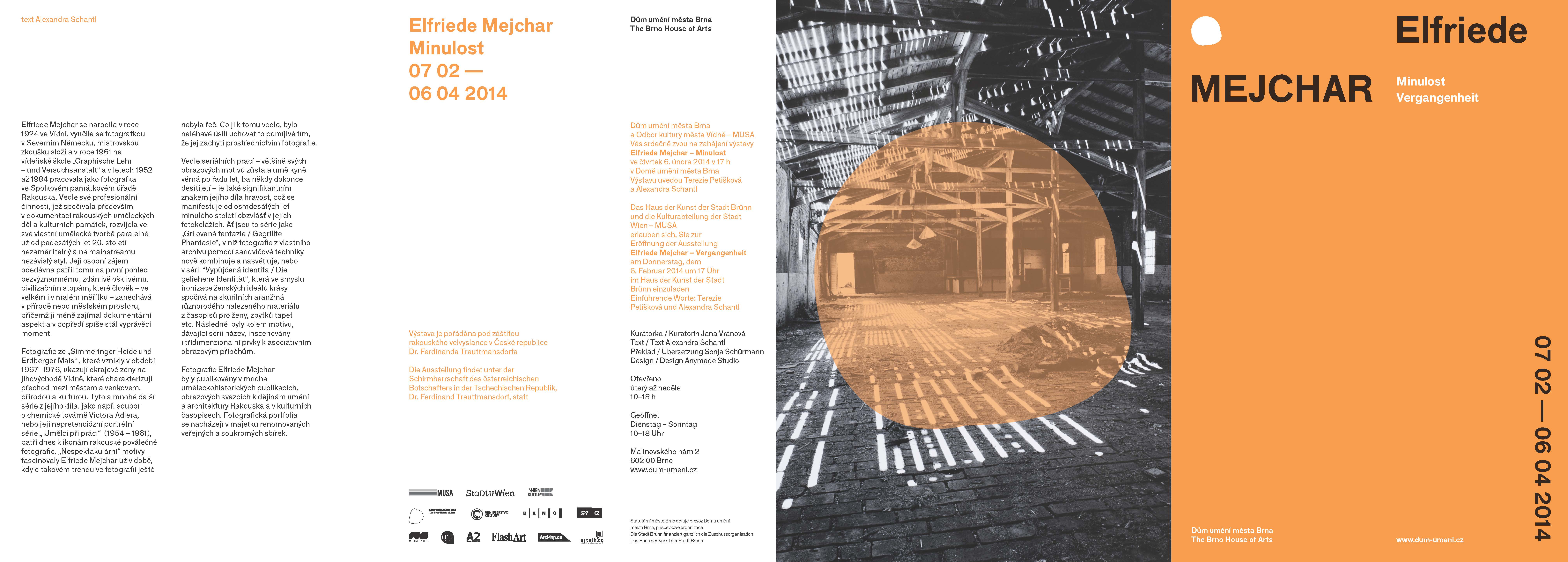Výstava nestorky současné rakouské fotografie Elfriede Mejchar (1924), pořádaná ve spolupráci s pořádaná ve spolupráci s Odborem kultury města Vídně – MUSA. Představí výběr portfolií černobílé fotografie z padesátých až devadesátých let minulého století z prostředí vídeňské periferie. Autorka snímala zejména proměnu venkovské krajiny do městského komplexu. Reprezentuje polohu neinscenované, civilní konceptuální rakouské fotografie. Později experimentovala s tónovanou fotografií, koncem osmdesátých let se soustředila na zátiší přecházející postupně v koláže a surreálné montáže. V nich se ironicky vyrovnává s interpretací tématu žena.