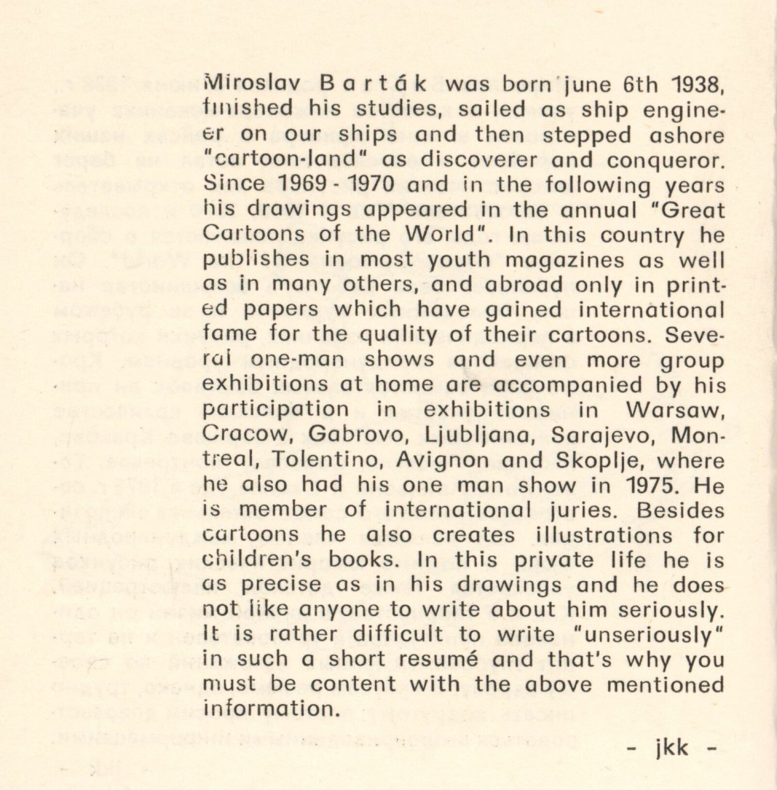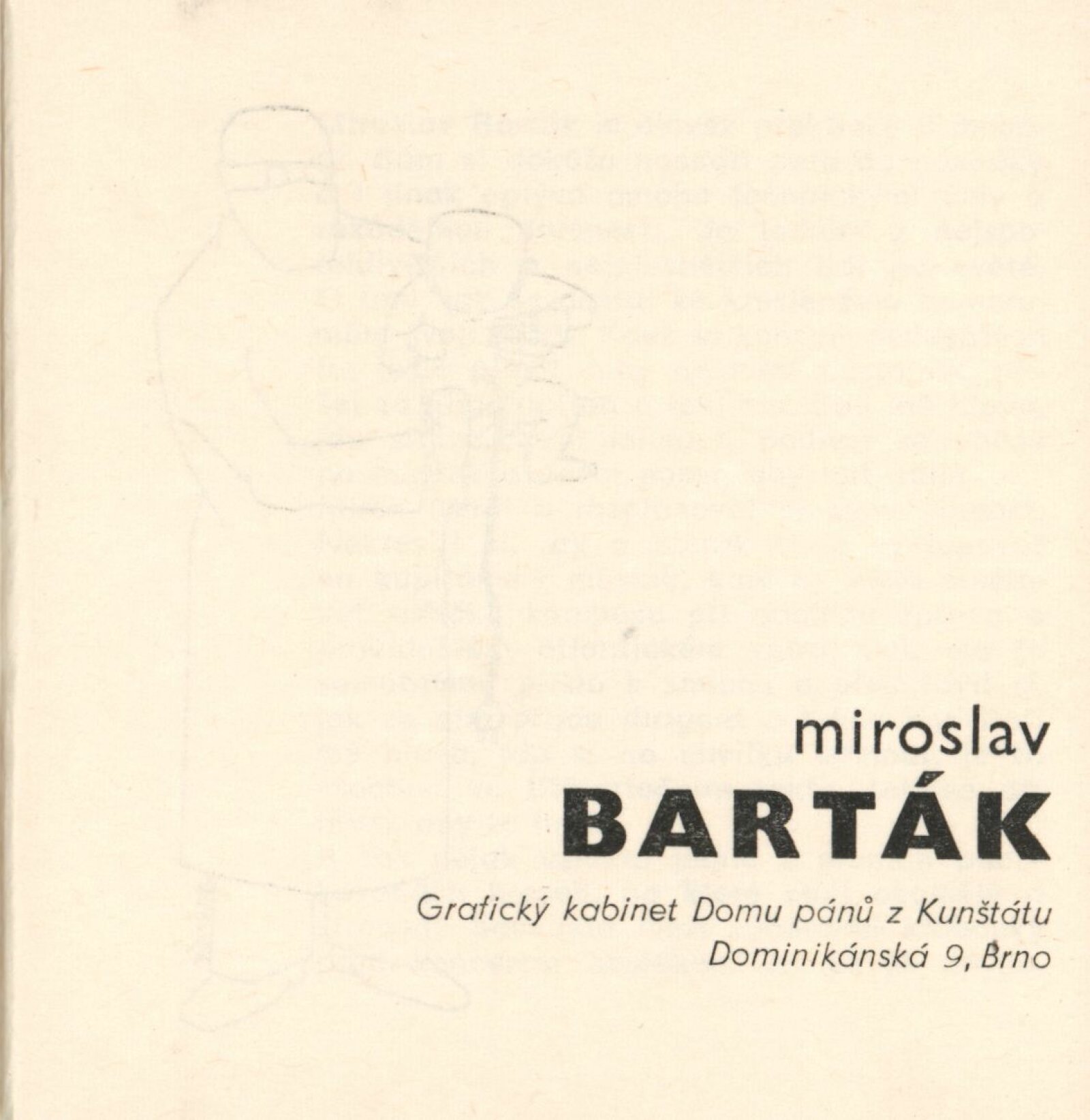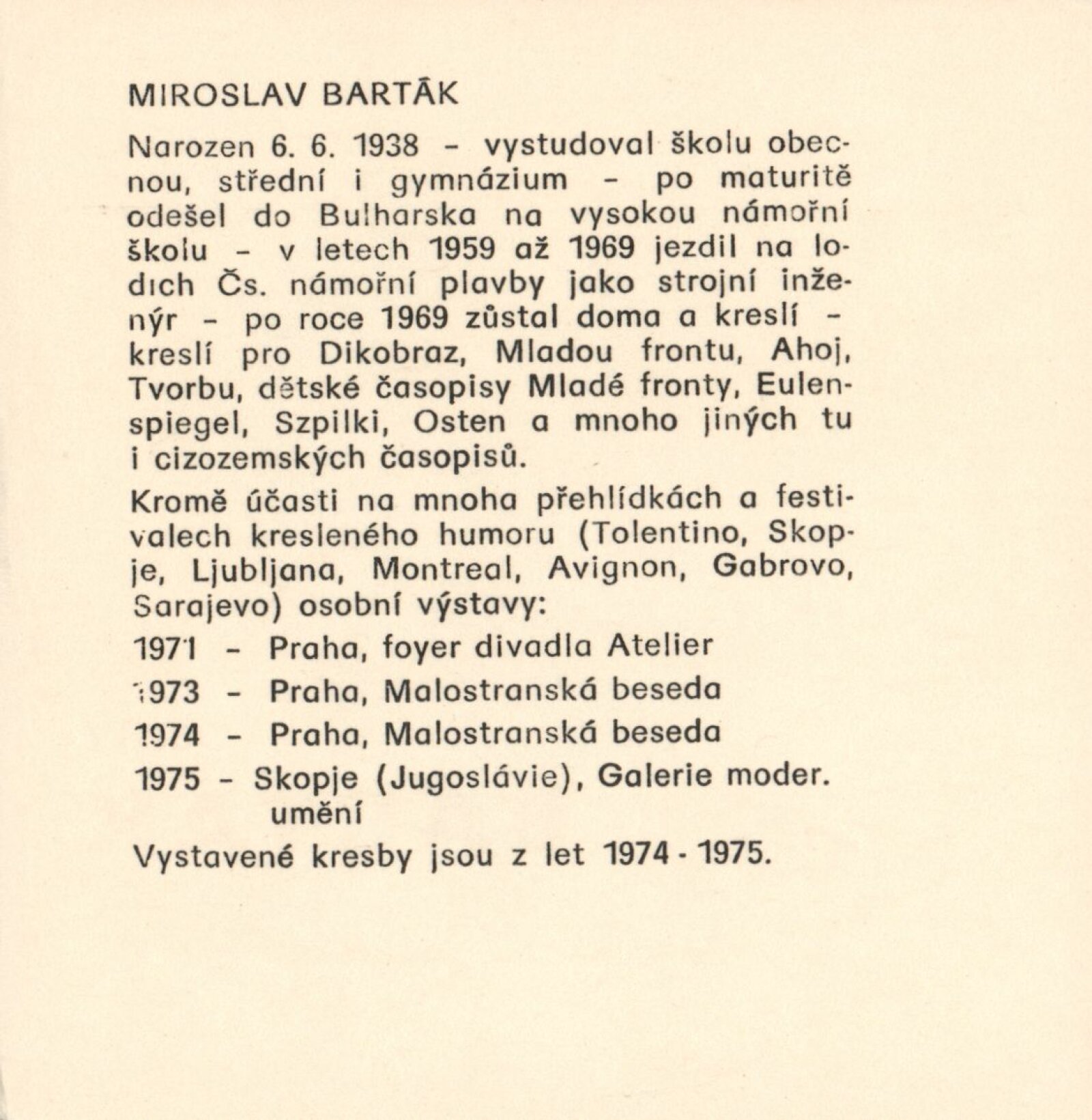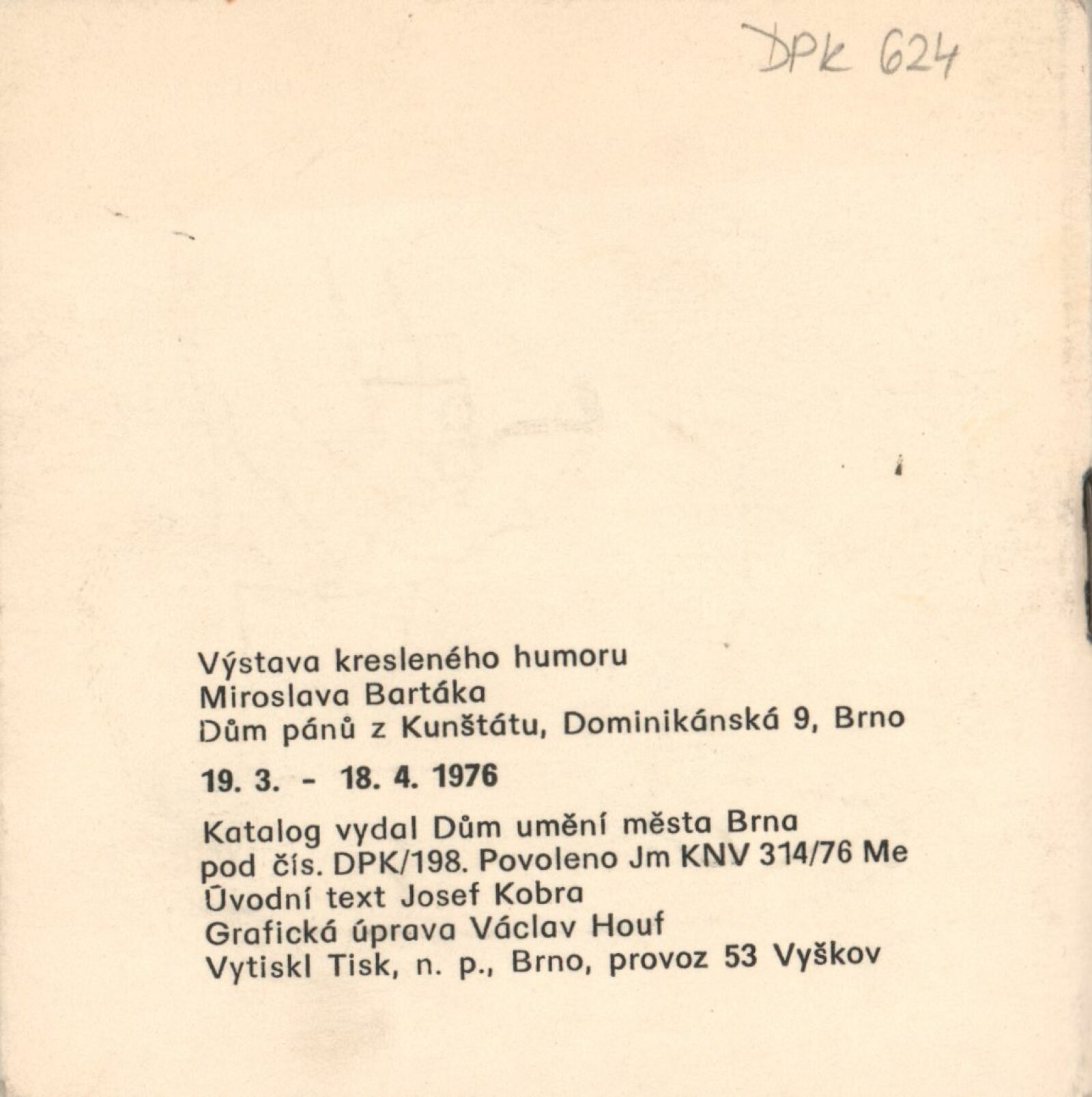 Miroslav Barták. Výstava kresleného humoru: Dům umění / Dům pánů z Kunštátu, 156. výstava Kabinetu grafiky, 19. 3. – 18. 4. 1976 / Text: Josef Kobra. – Brno: DUmB, 1976. – 28 s., obr., životopis, DPK 624. – MZK; MG; MMB