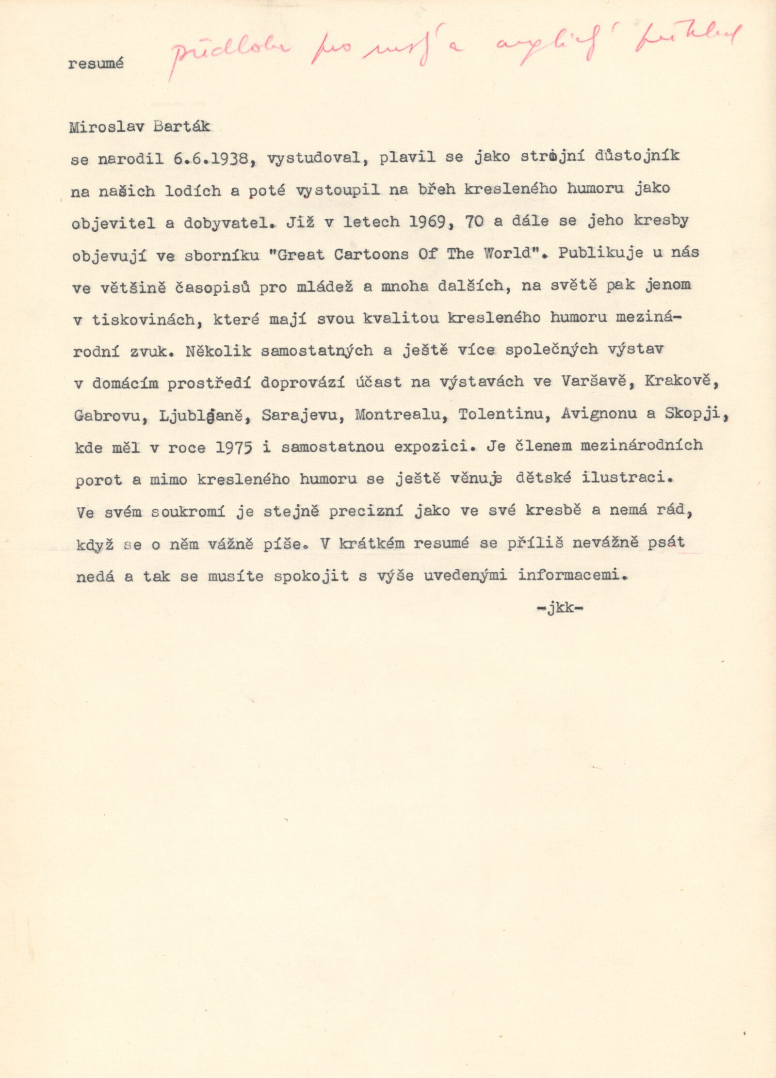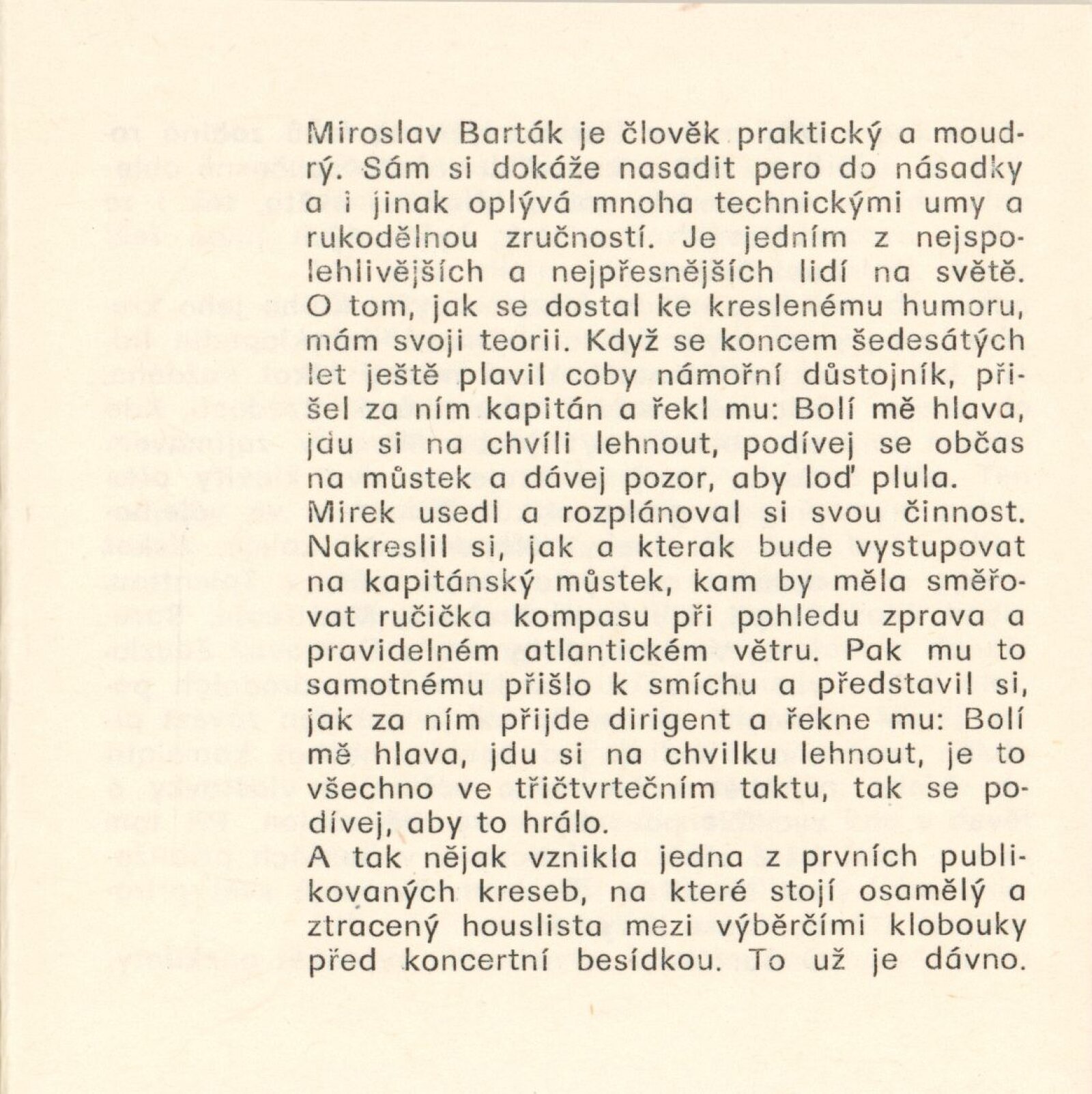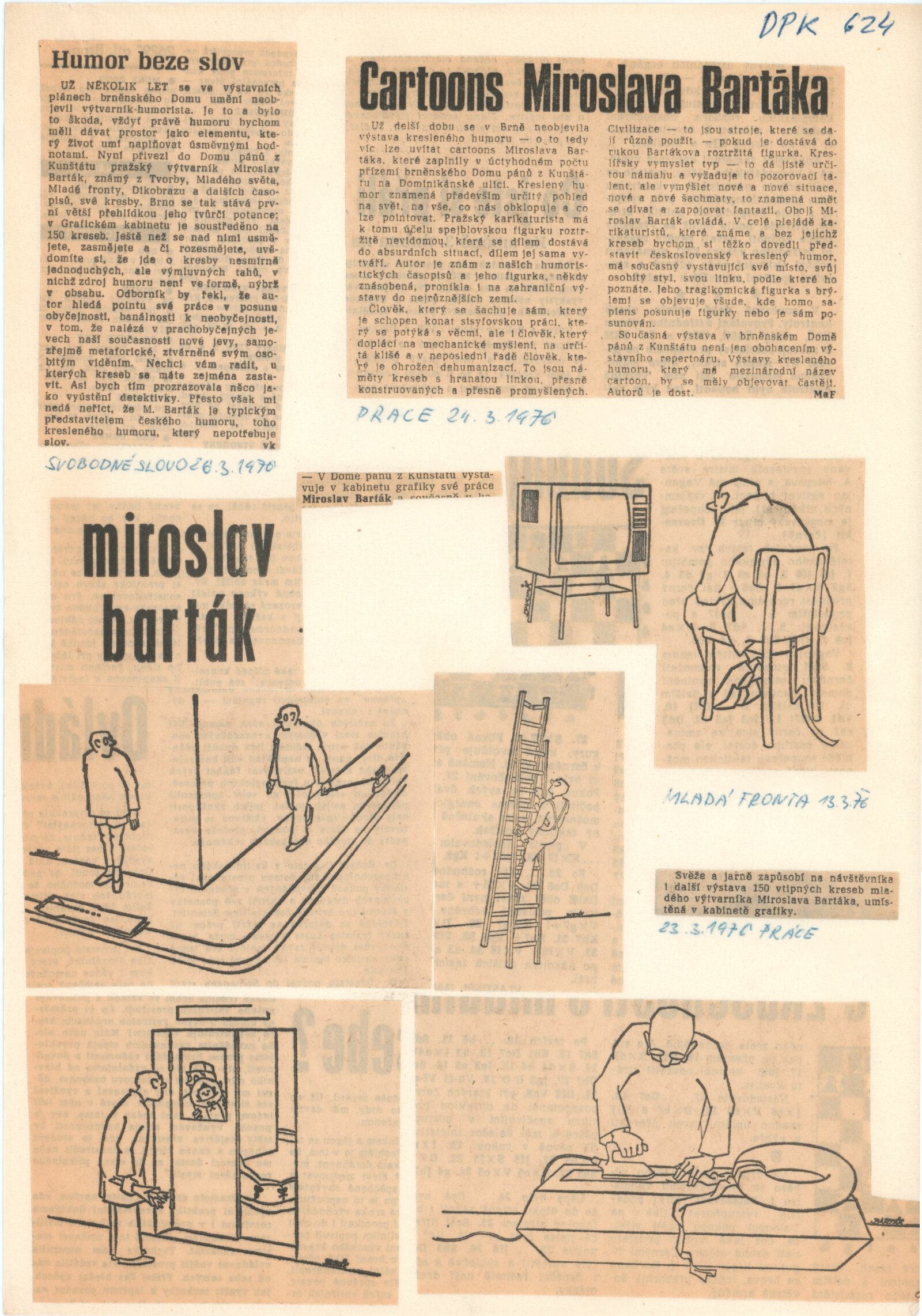 Miroslav Barták. Výstava kresleného humoru: Dům umění / Dům pánů z Kunštátu, 156. výstava Kabinetu grafiky, 19. 3. – 18. 4. 1976 / Text: Josef Kobra. – Brno: DUmB, 1976. – 28 s., obr., životopis, DPK 624. – MZK; MG; MMB