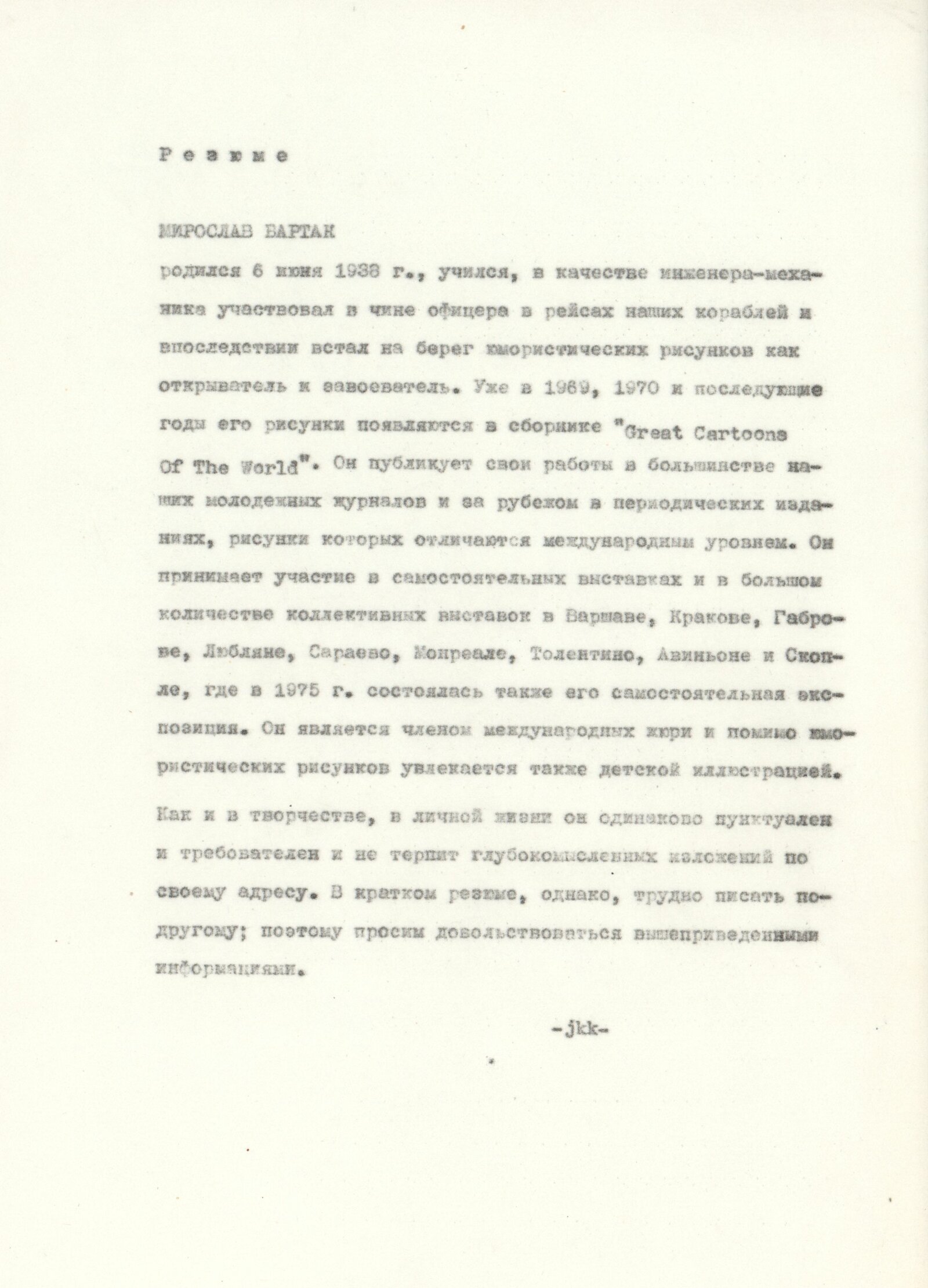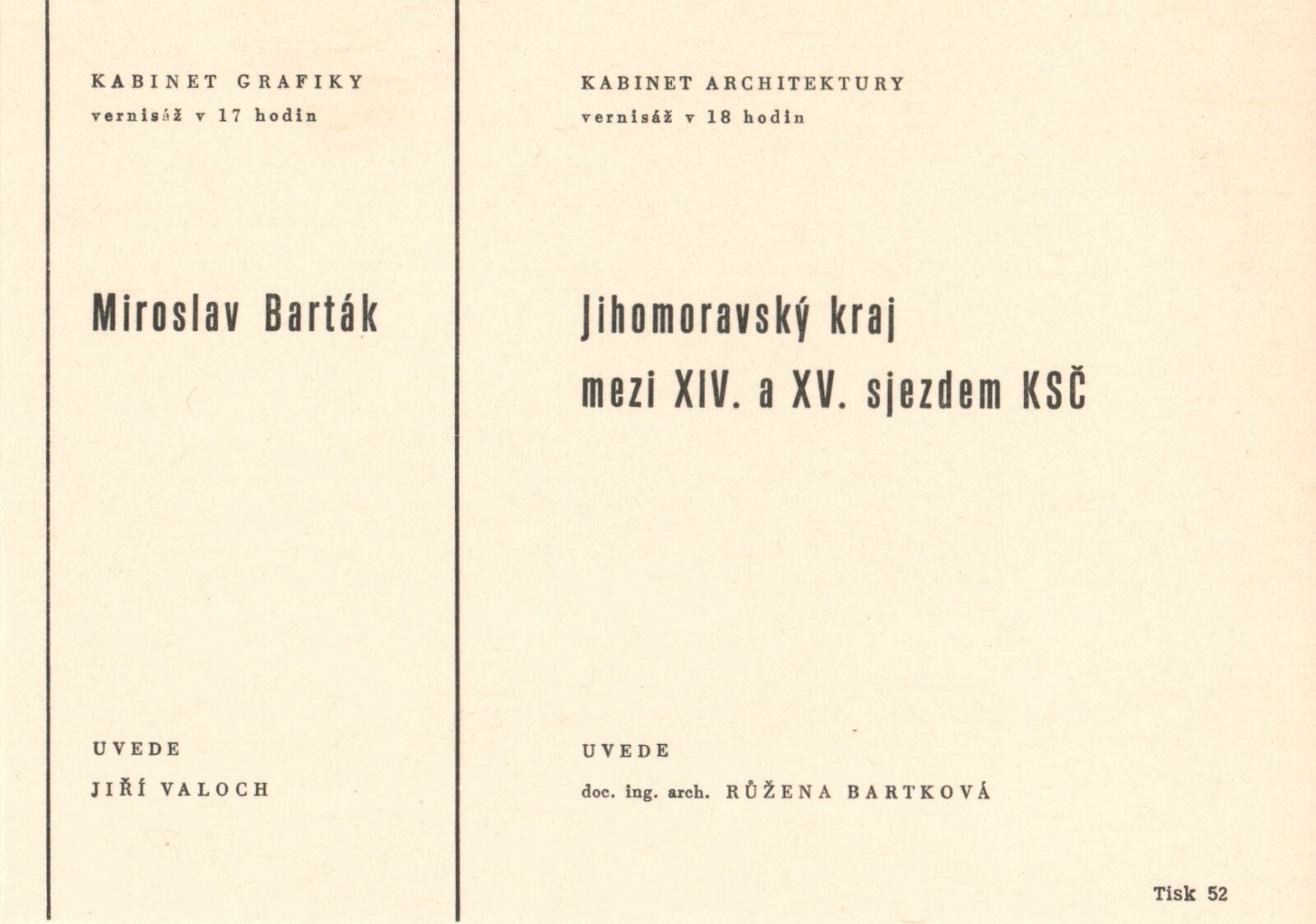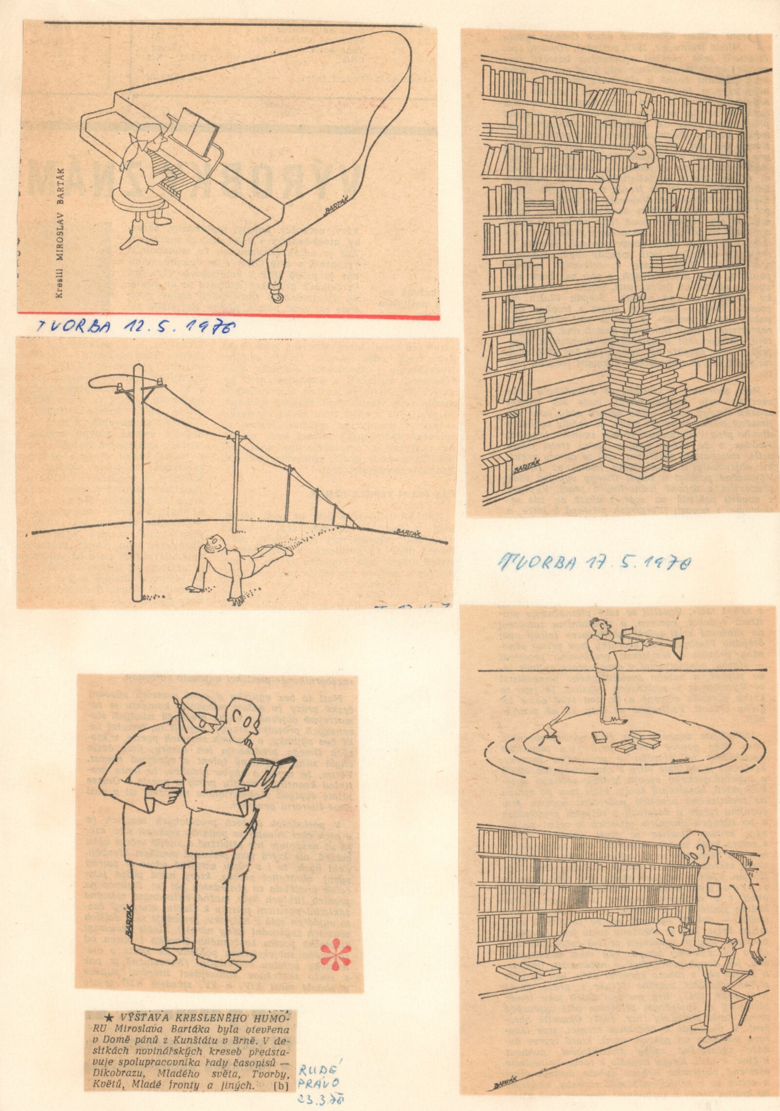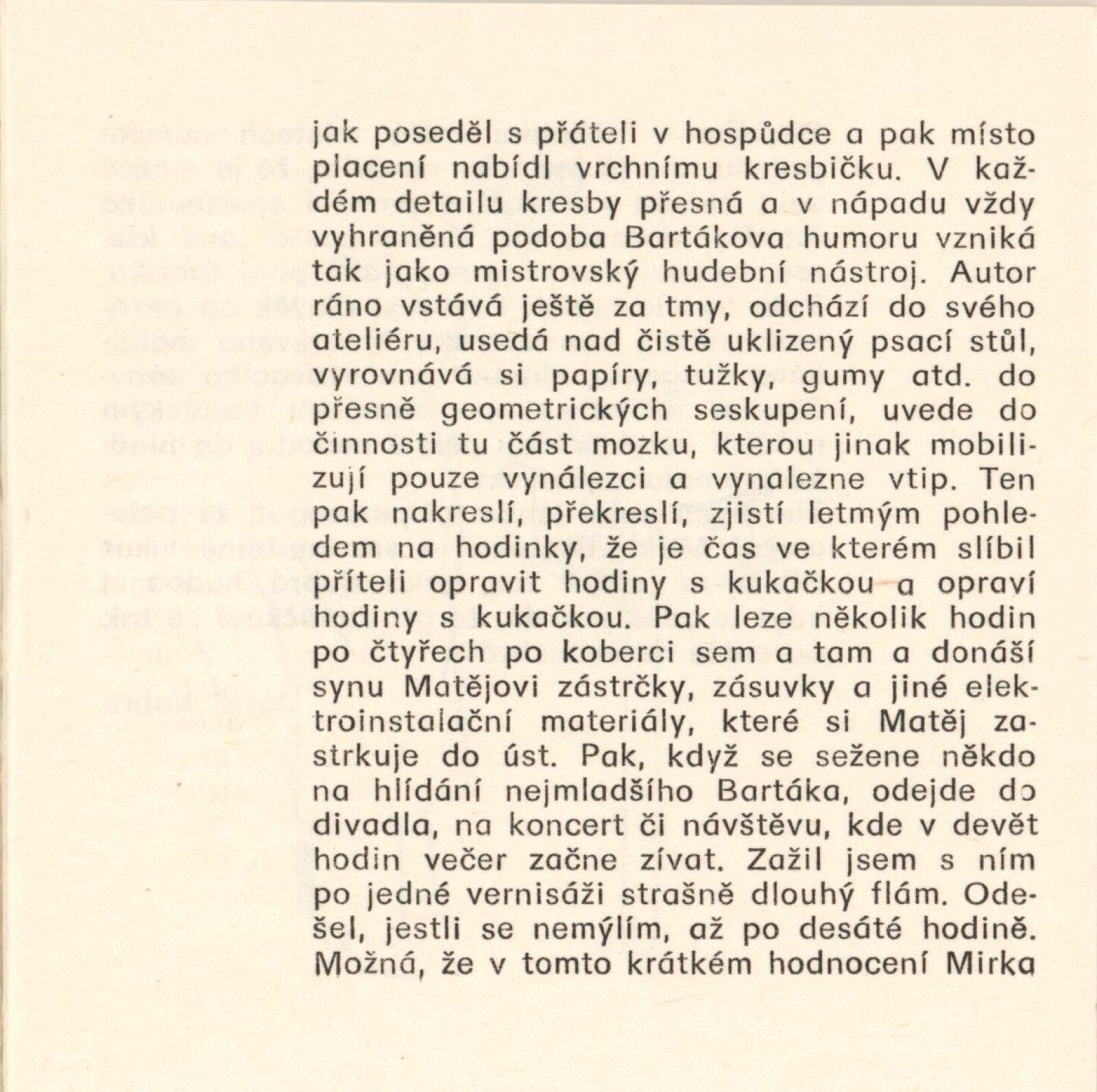 Miroslav Barták. Výstava kresleného humoru: Dům umění / Dům pánů z Kunštátu, 156. výstava Kabinetu grafiky, 19. 3. – 18. 4. 1976 / Text: Josef Kobra. – Brno: DUmB, 1976. – 28 s., obr., životopis, DPK 624. – MZK; MG; MMB