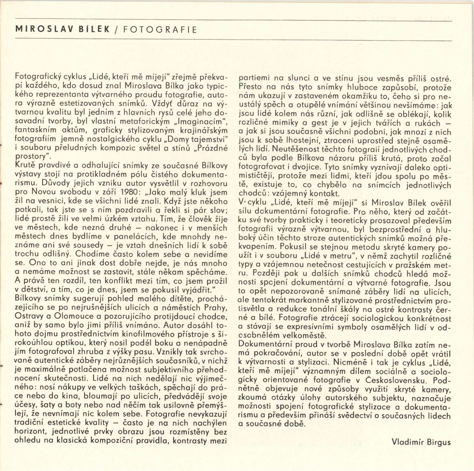 Miroslav Bílek. Fotografie: Dům umění / Dům pánů z Kunštátu, Kabinet fotografie Jaromíra Funka, 28. 8. – 4. 10. 1981 / Text: Vladimír Birgus. – Brno: DUmB, 1981. – 13 s., obr., životopis, DPK 763. – MZK; MG