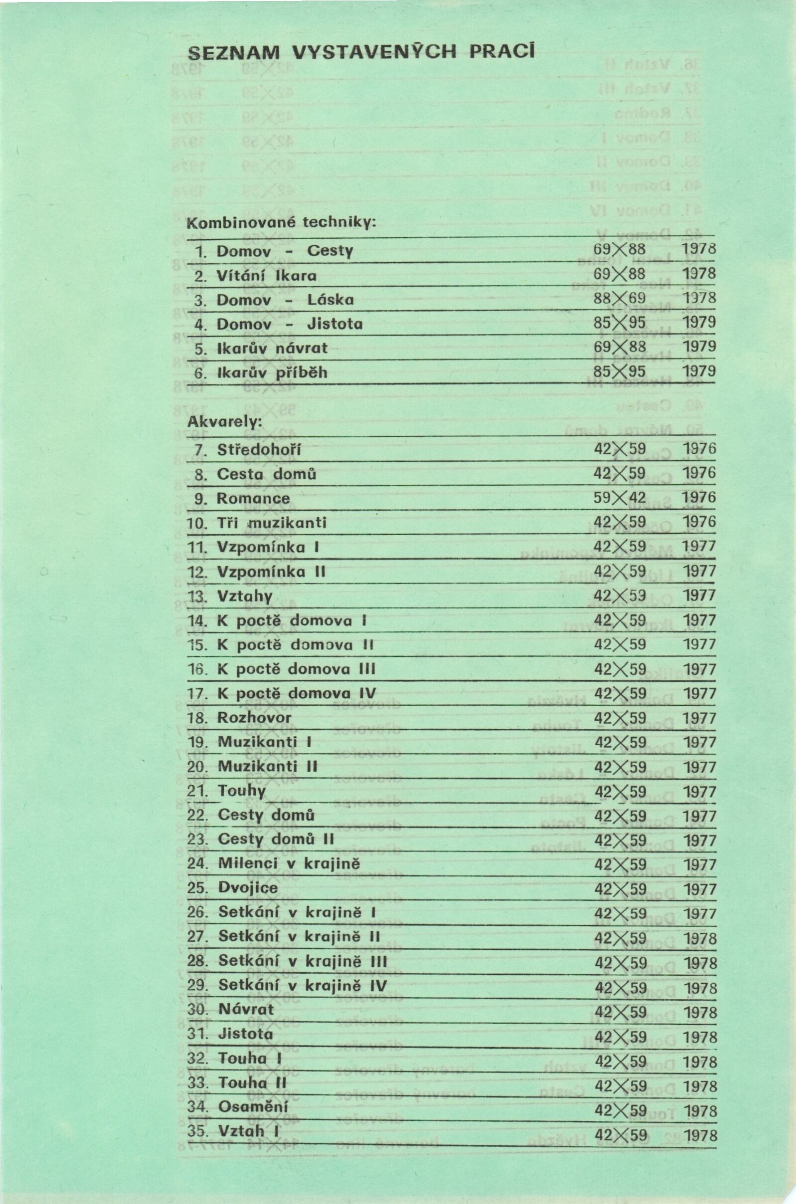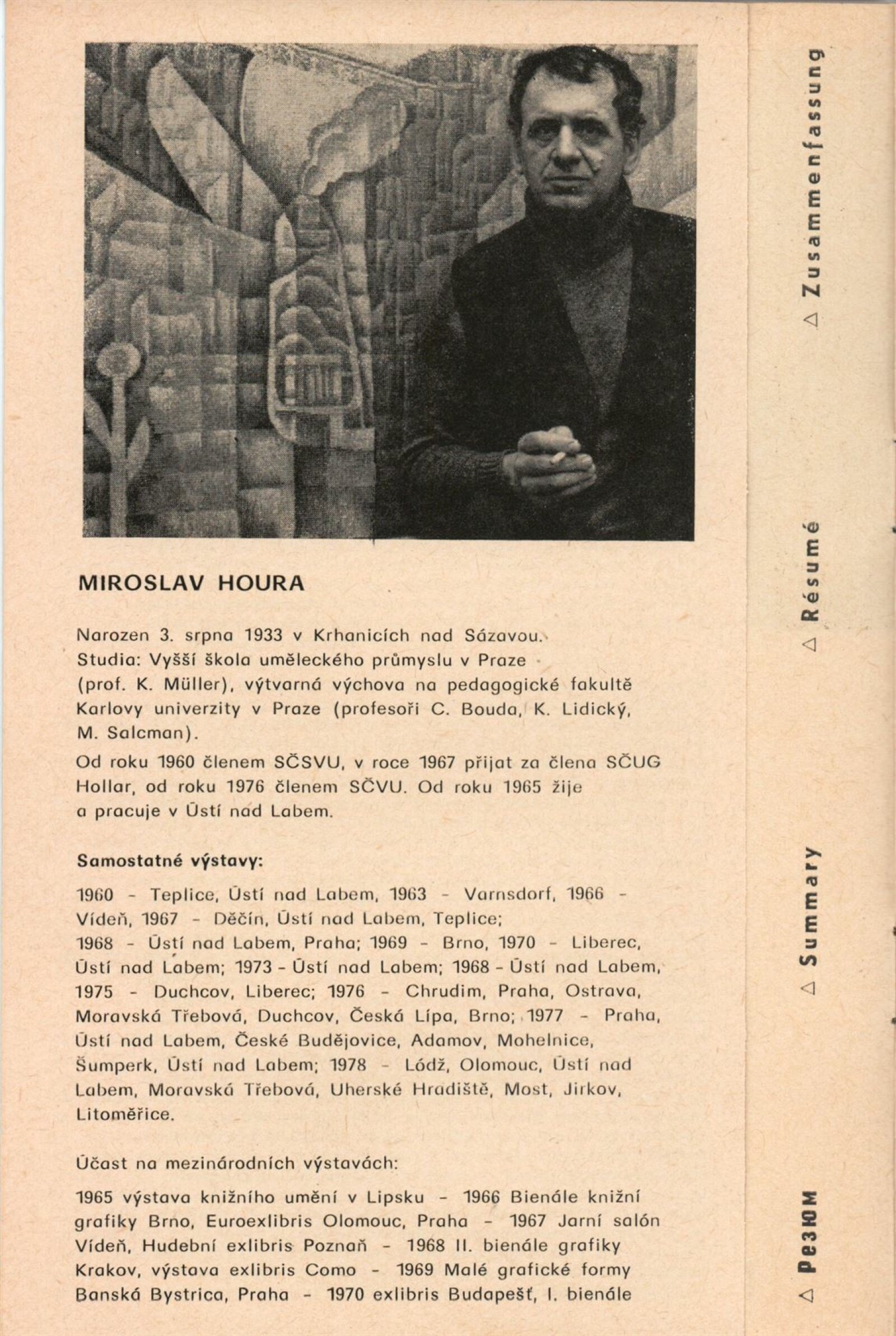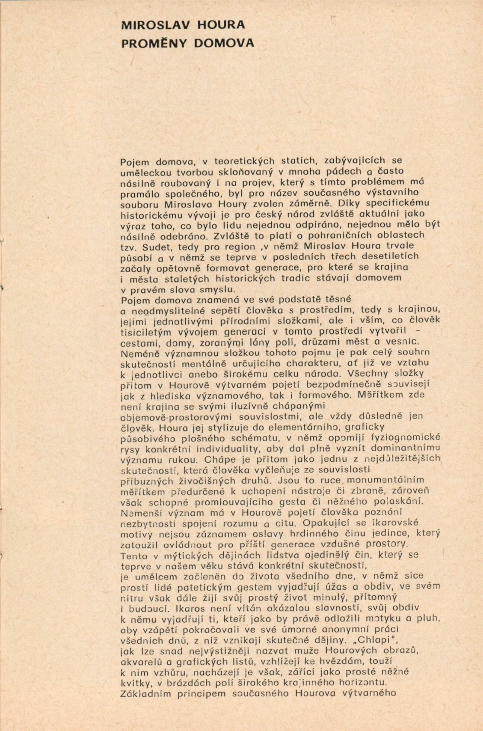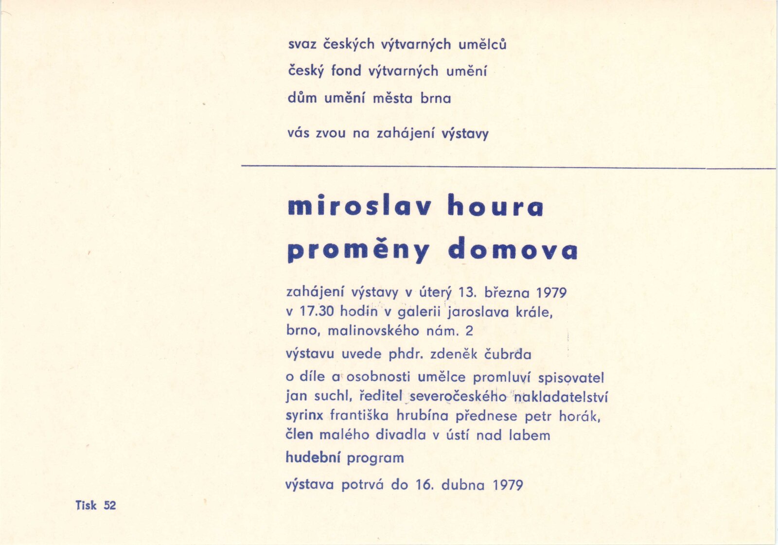 Miroslav Houra. Proměny domova: 92. výstava v Galerii Jaroslava Krále 13. 3. – 16. 4. 1979 / Text Zdeněk Čubrda. - Brno: ČFVU, - 10 s., obr. + Seznam vystavených prací 2 s. Portrét, životopis DU 689; MG; MMB