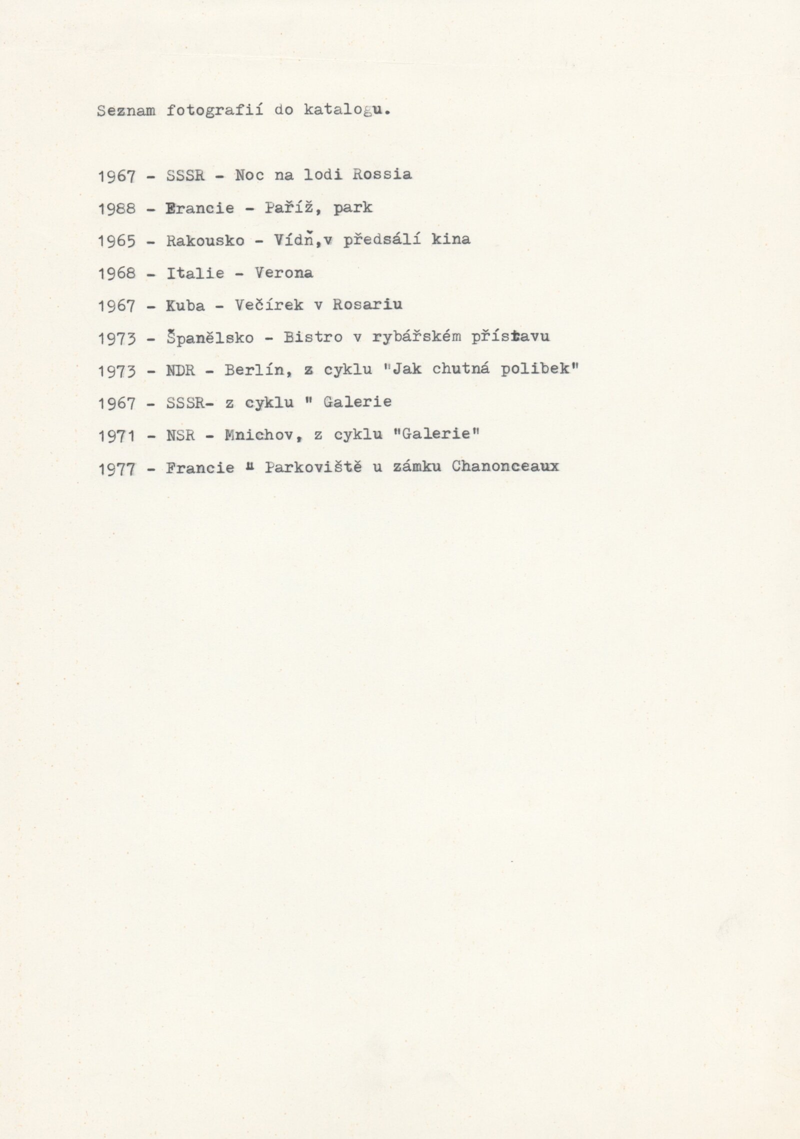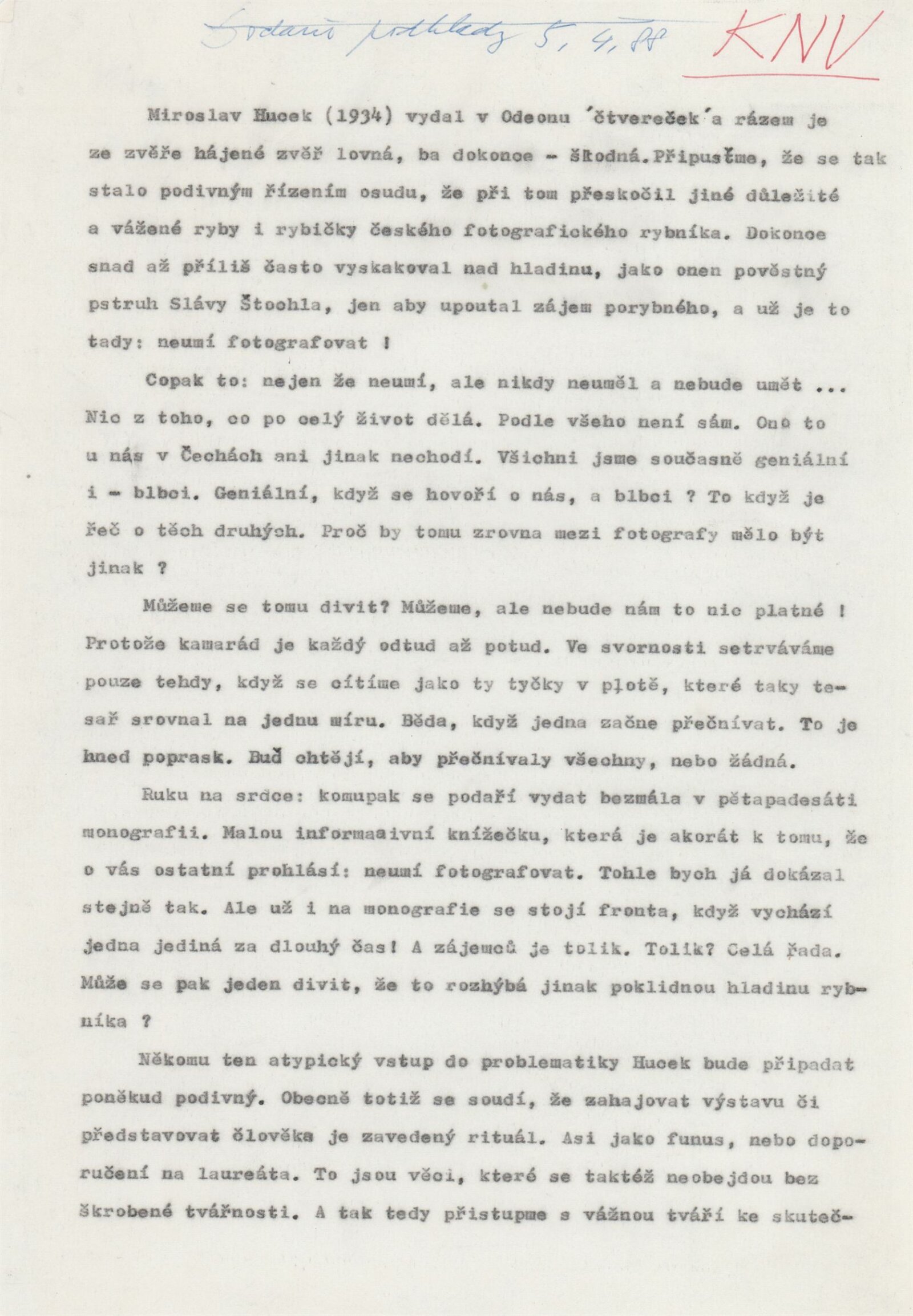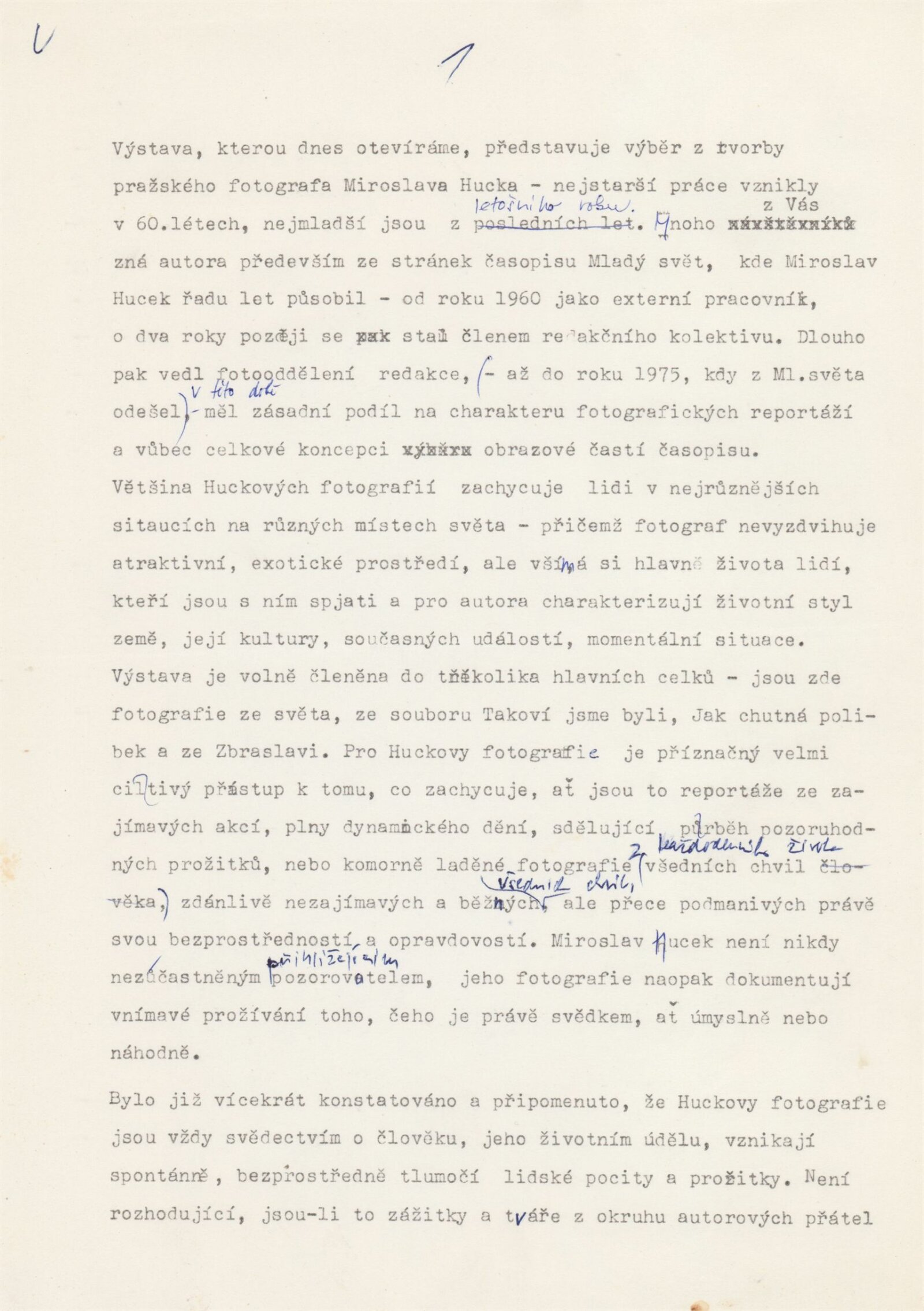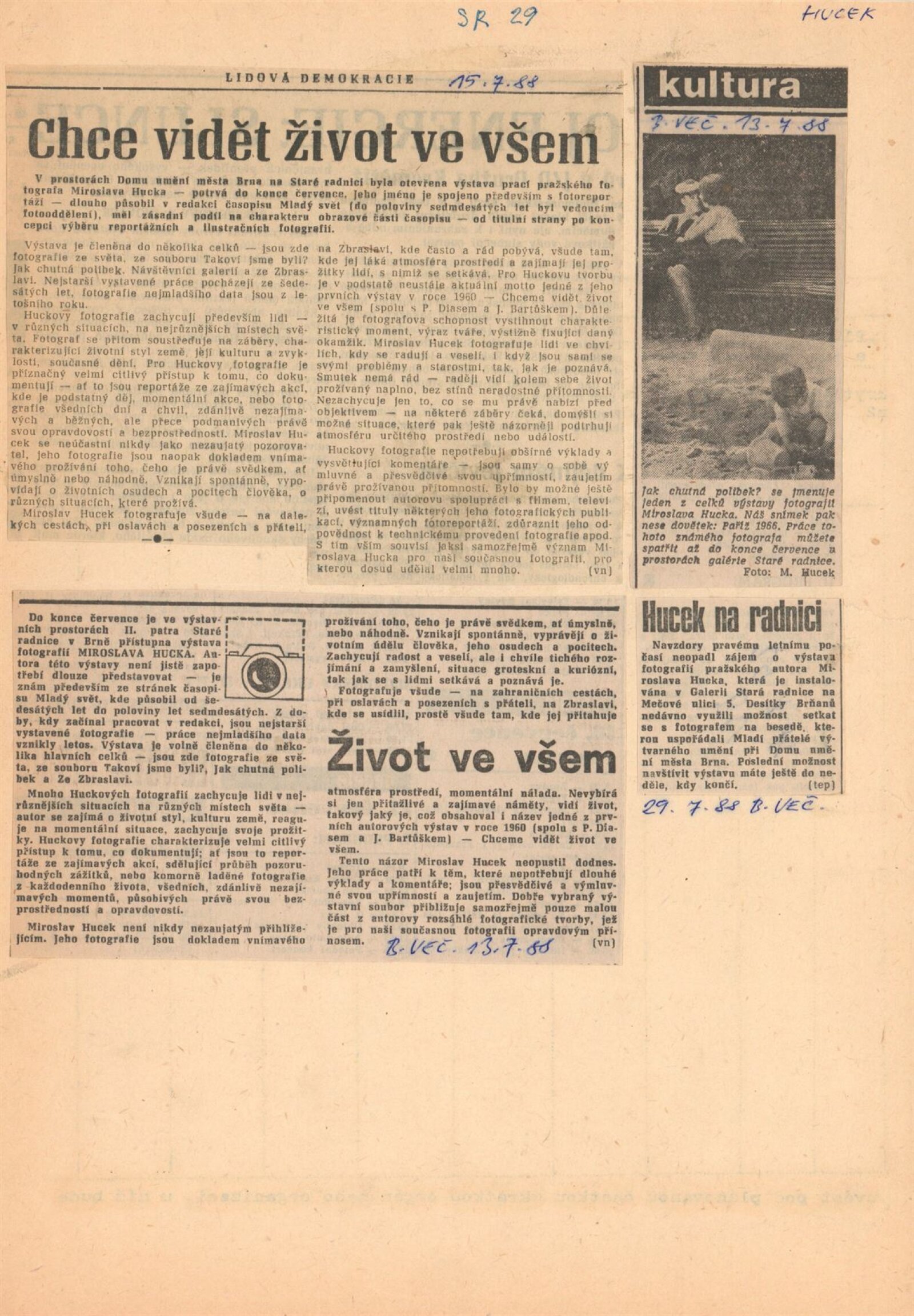 pozvánka, katalog, zpráva do médií, úvodní proslov na vernisáži, strojopis, fotografie pro katalog aj., z vernisáže, korespondence (1988), pozvání výbor MPVU na besedu s fotografem, žádost a potvrzení o konání výstavy, recenze v tisku, katalog z výstavy Miroslava Hucka v GVU v Chebu (1983), katalog z výstavy M. Hucka ve VS Semafor v Praze (1984), VS Fotochema v Praze (1985), poznámky