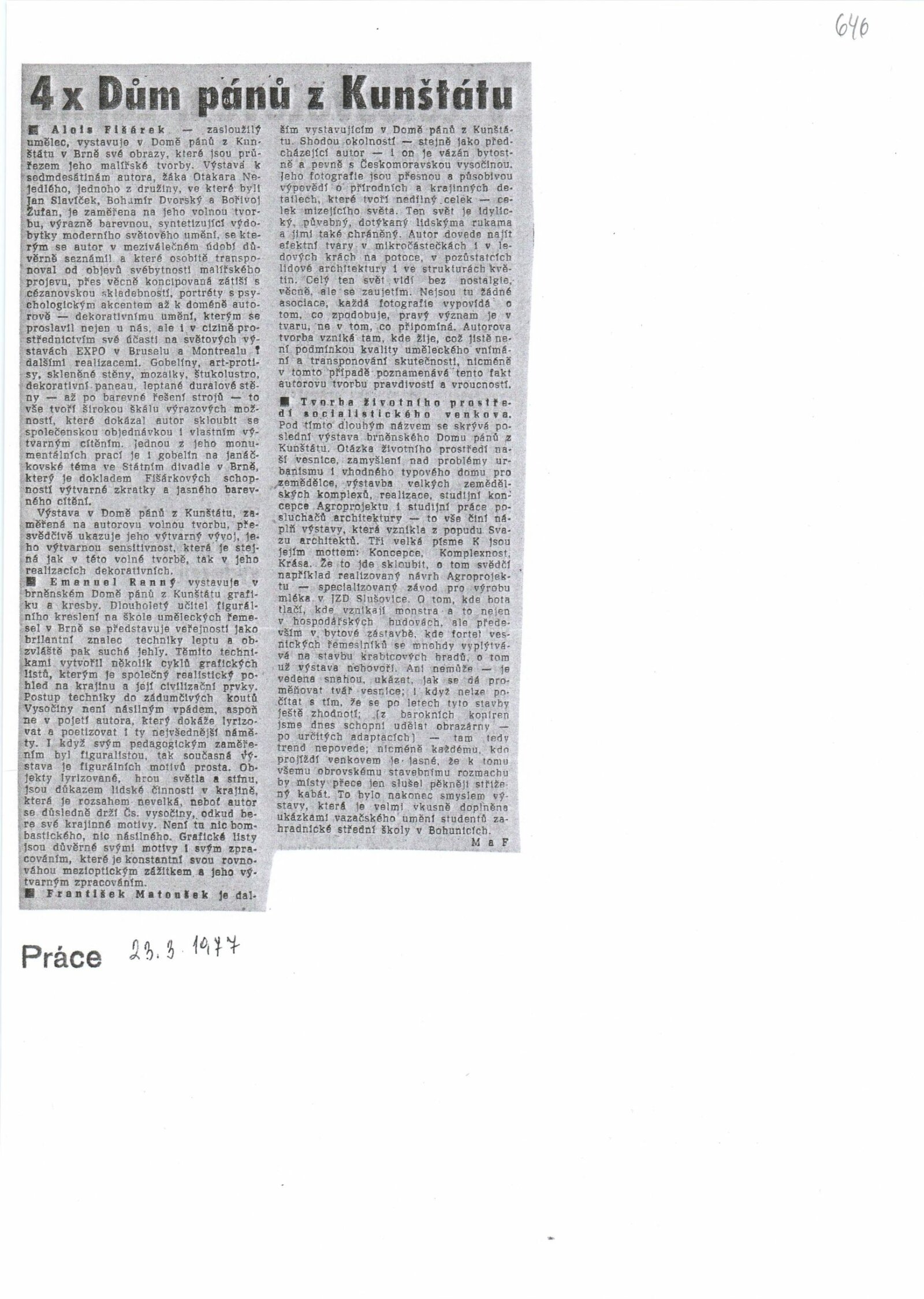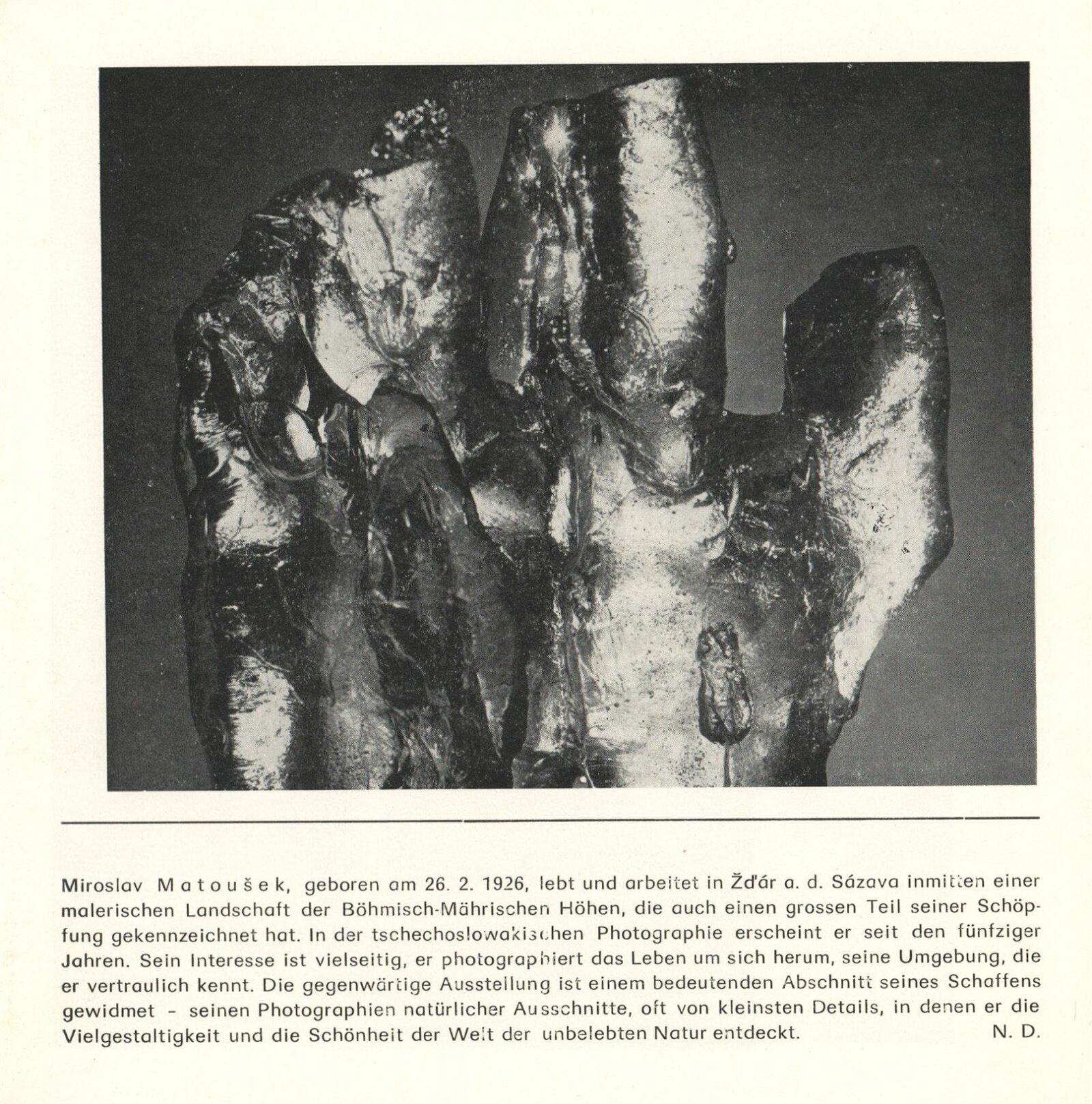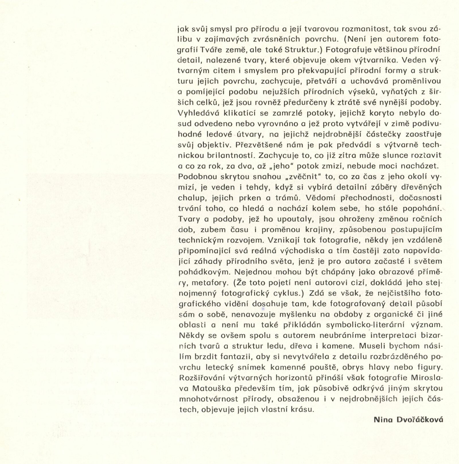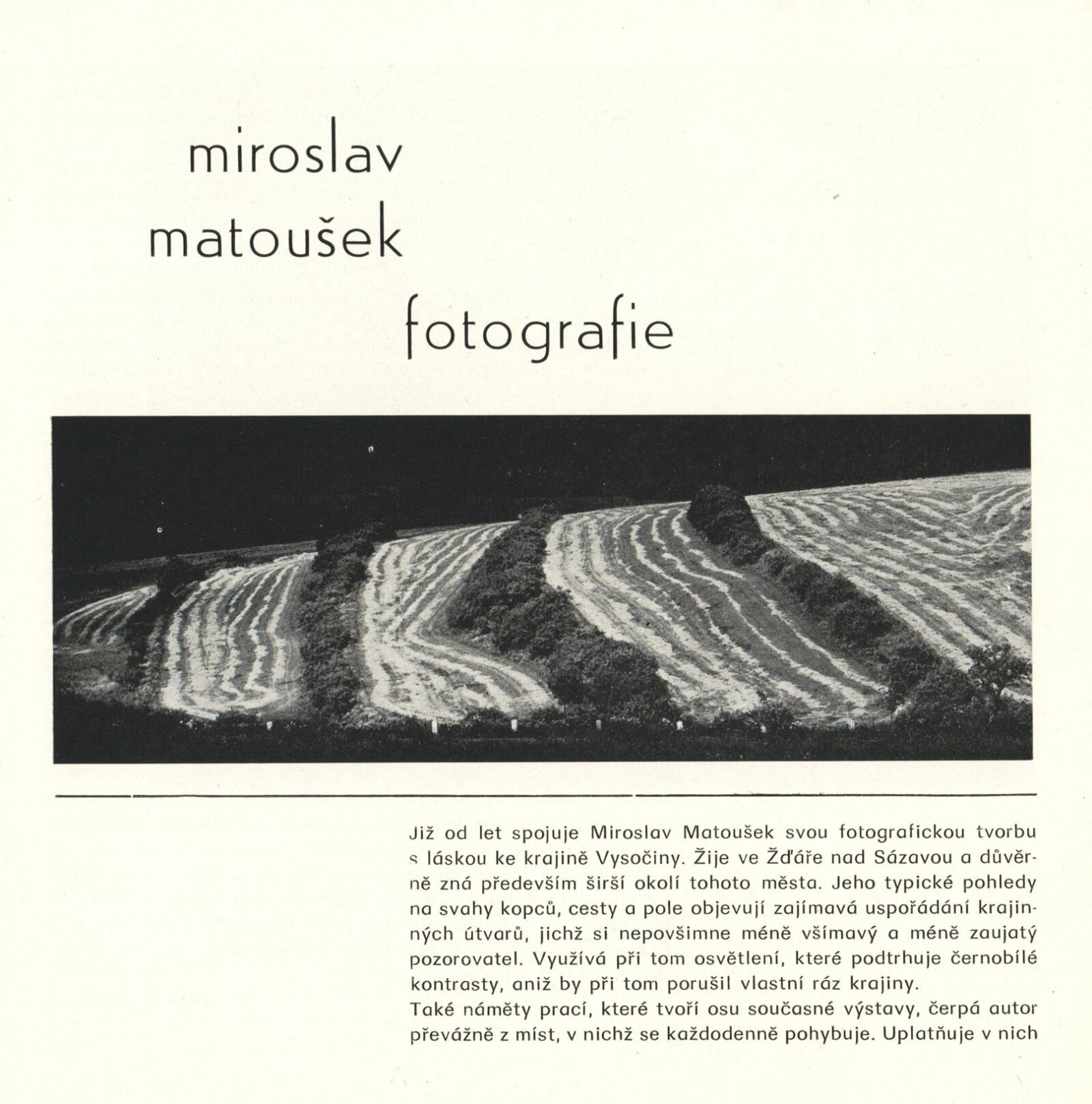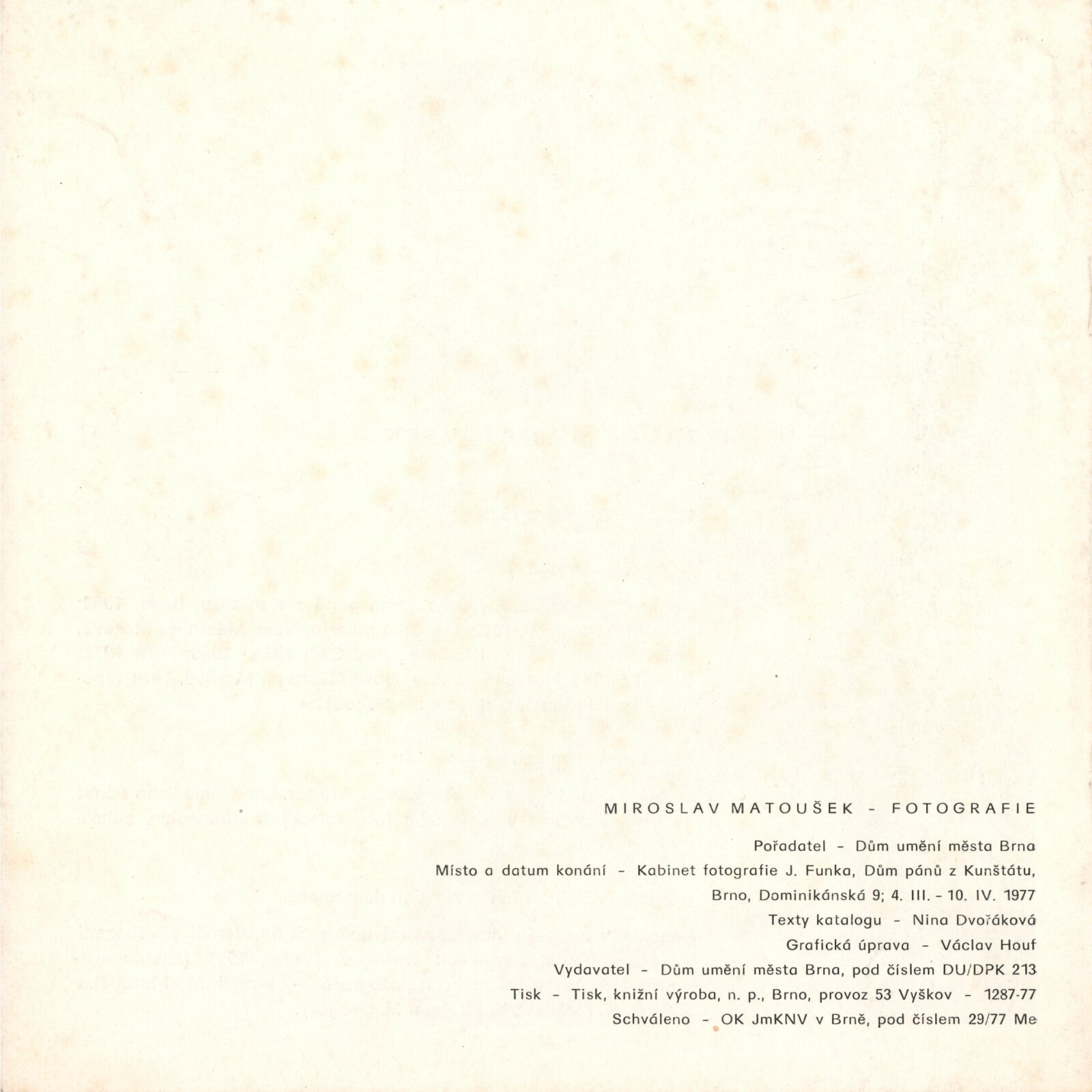 Miroslav Matoušek. Fotografie: Dům umění / Dům pánů z Kunštátu, Kabinet fotografie Jaromíra Funka, 4. 3. 1977 – 10. 4. 1977 / Text: Nina Dvořáková. – Brno: DUmB, 1977. – 12 s., obr., životní data, výstavy, DPK 646. – MZK; MG