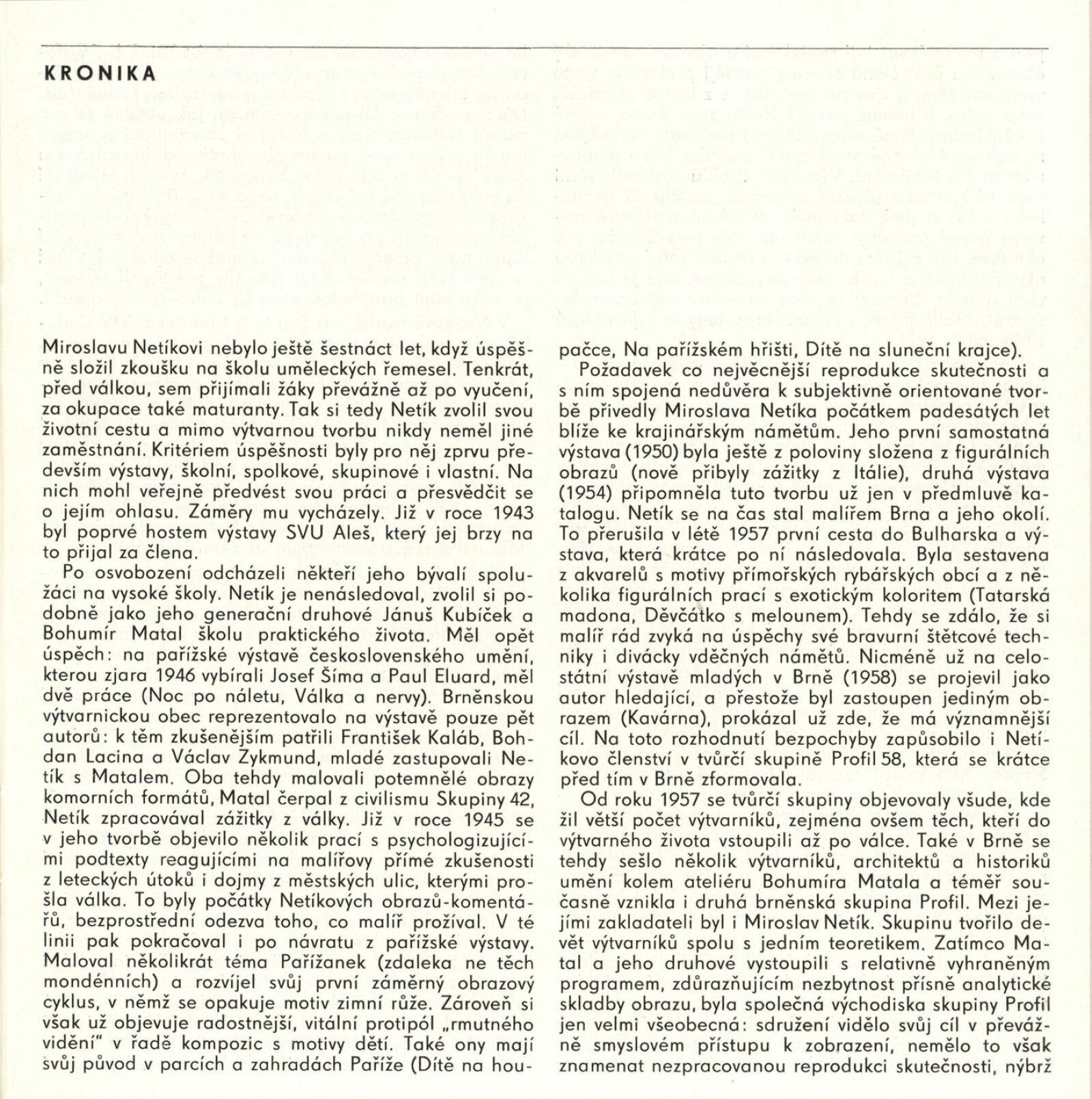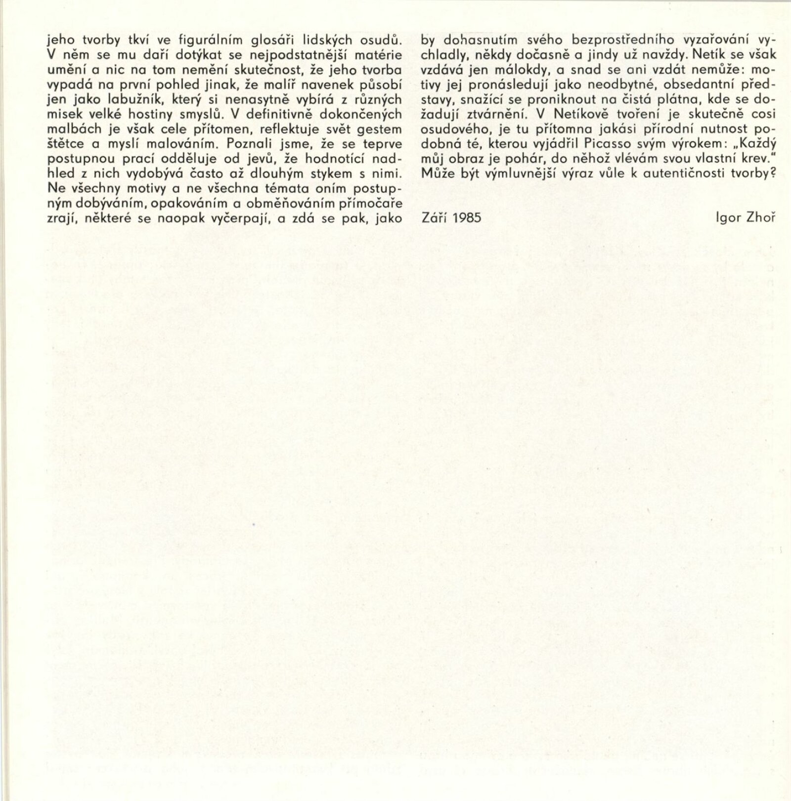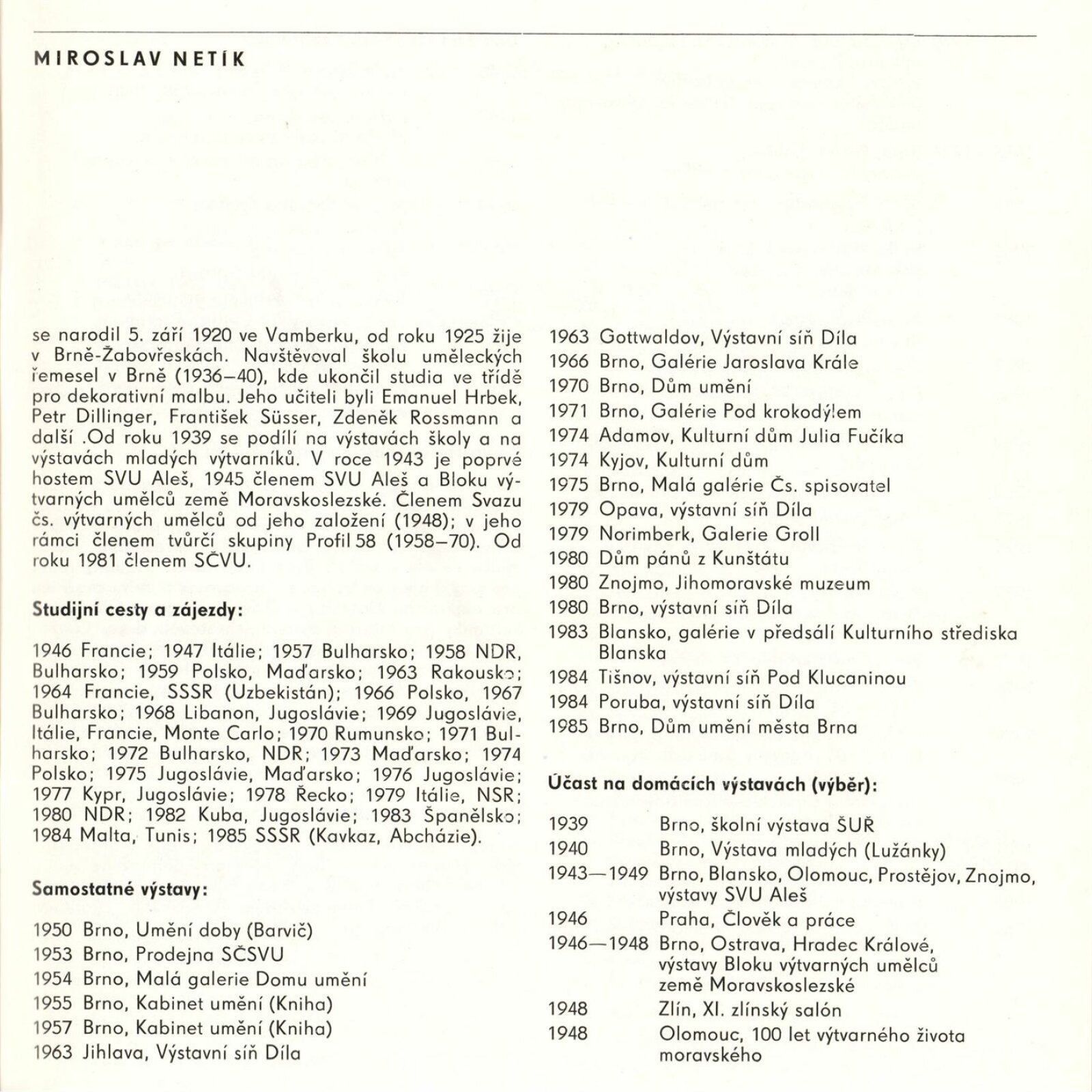 Miroslav Netík. Obrazy: Dům umění města Brna, 14. 1. – 23. 2. 1986 / Text: Igor Zhoř, báseň Oldřich Mikulášek. – Brno: DUmB, 1986. – [28] s., obr., seznam vystavených prací [1] s., životní data, studijní cesty, výstavy, realizace ve spojení s architekturou, zastoupení ve sbírkách, DU 813. – MG; MMB